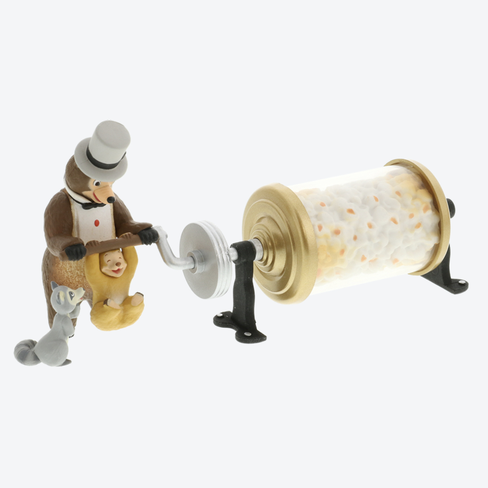 The collection features six characters all cranking popcorn. You can see these kinds of characters in popcorn carts normally, but I think the clown is the only one I’ve seen in a real cart. There’s a Tiki Bird, the clown, Henry with Sammy and Oscar, Pooh and Piglet on a Hunny pot, athletic Goofy, and a mystery figure. I’d put money down that the mystery figure is Big Al though.
