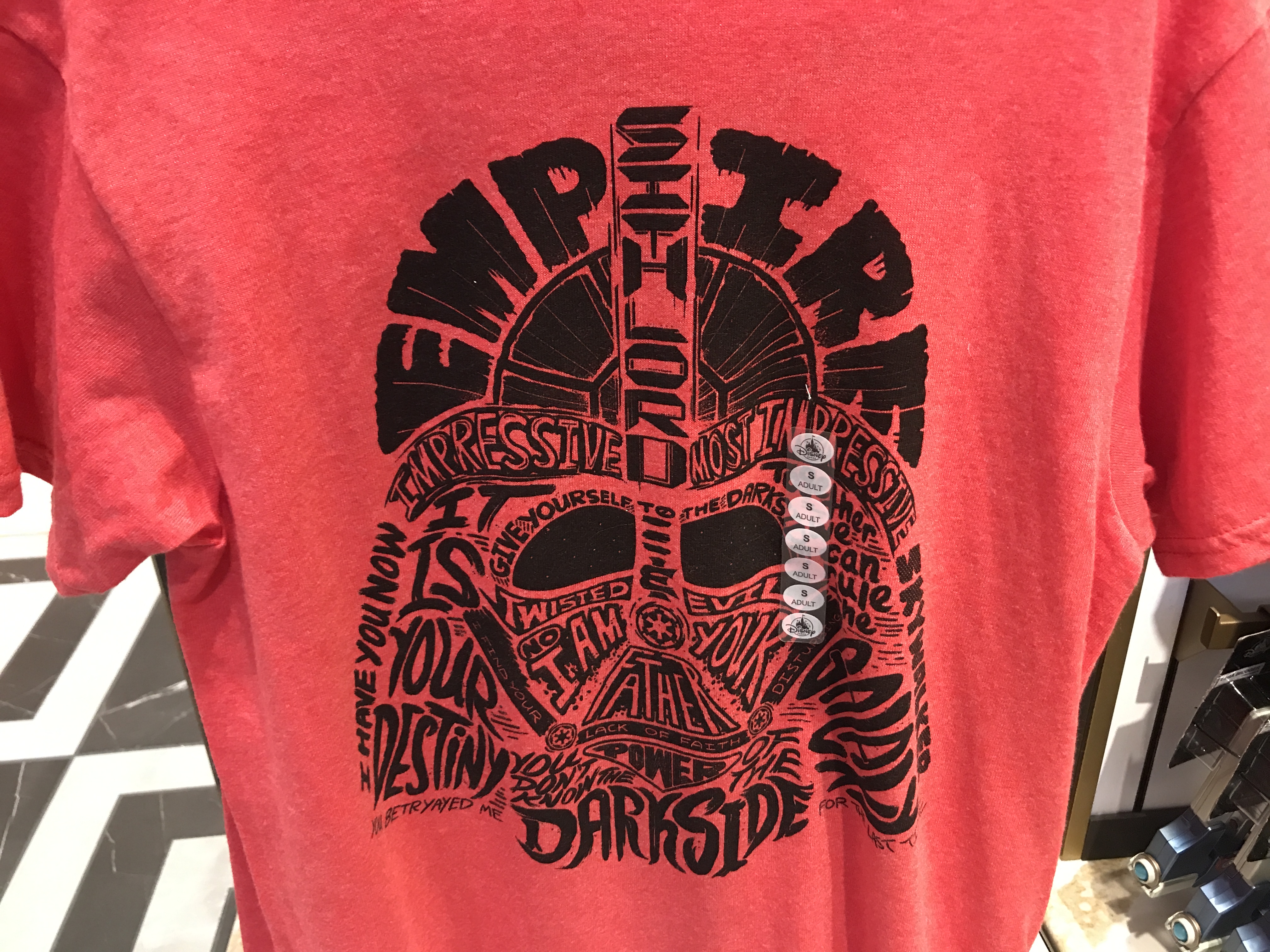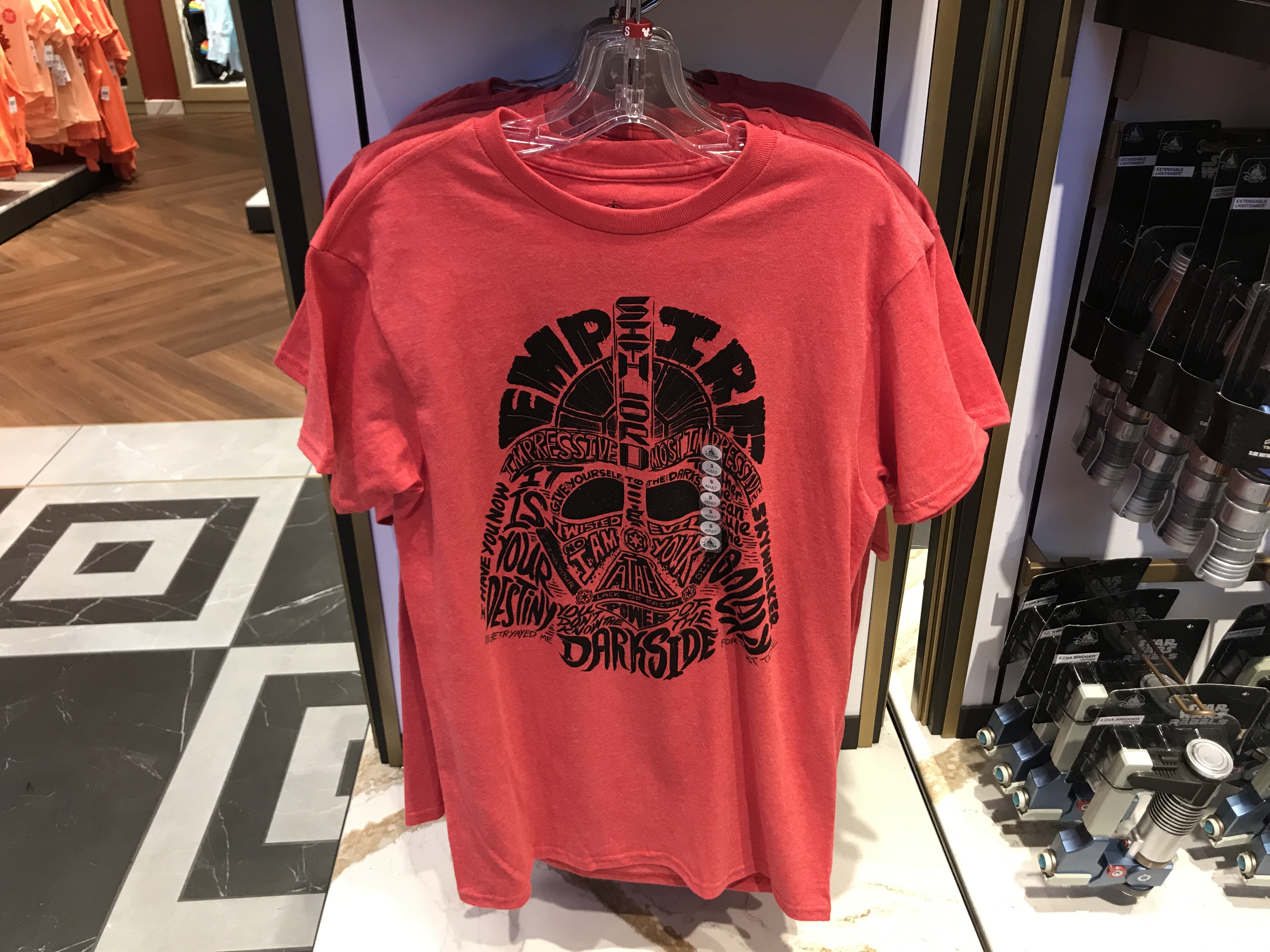 Across the street at Mickey’s of Hollywood, this fun red tee almost tempts us to join the Dark Side.