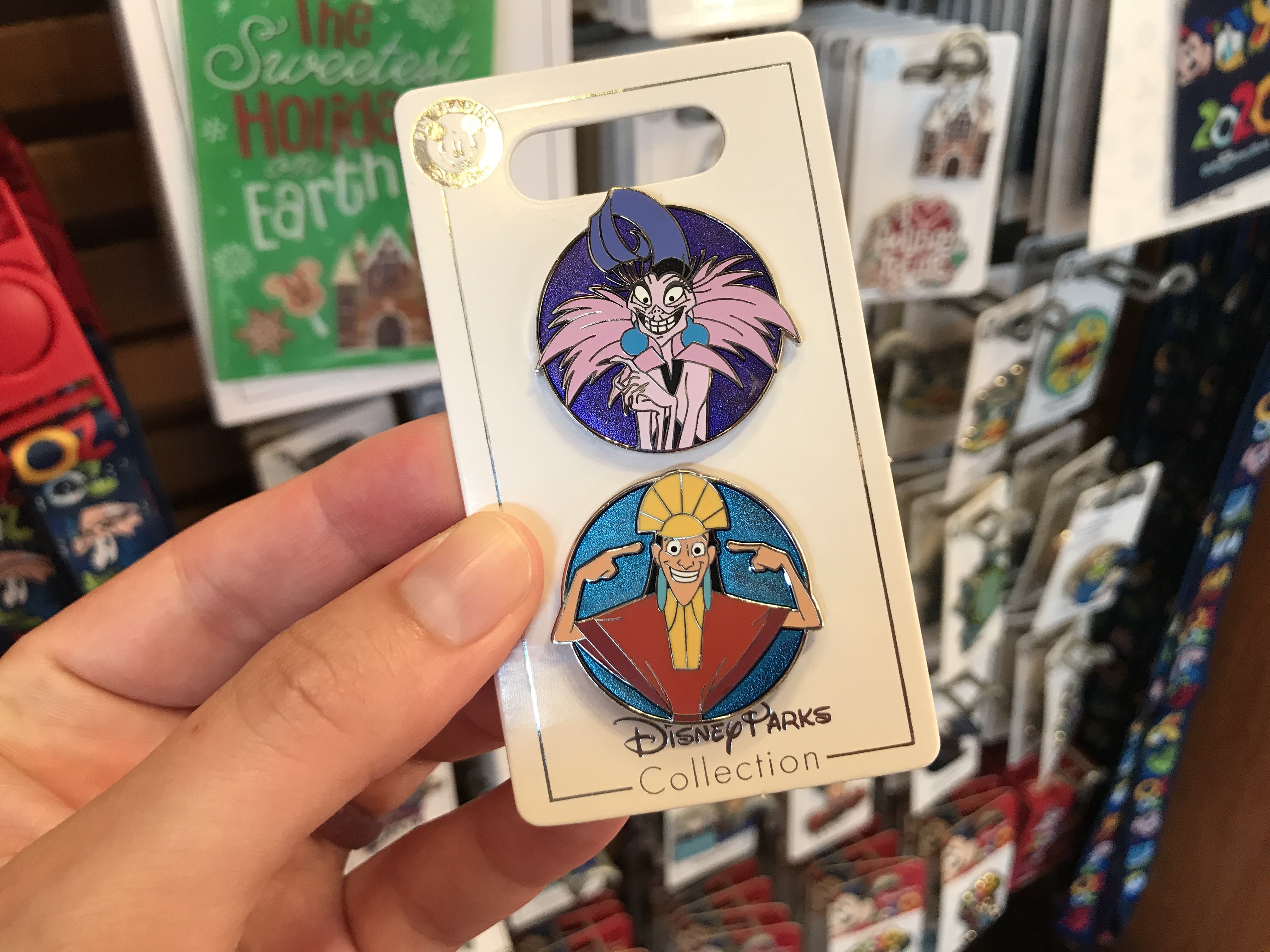 We are here for any merchandise from “The Emperor’s New Groove.” We came across this two-pin set at Sunset Ranch Pin and Souvenirs. One pin is Kuzco pointing to himself and the other is a sly looking Yzma. The pin set is $15.99.