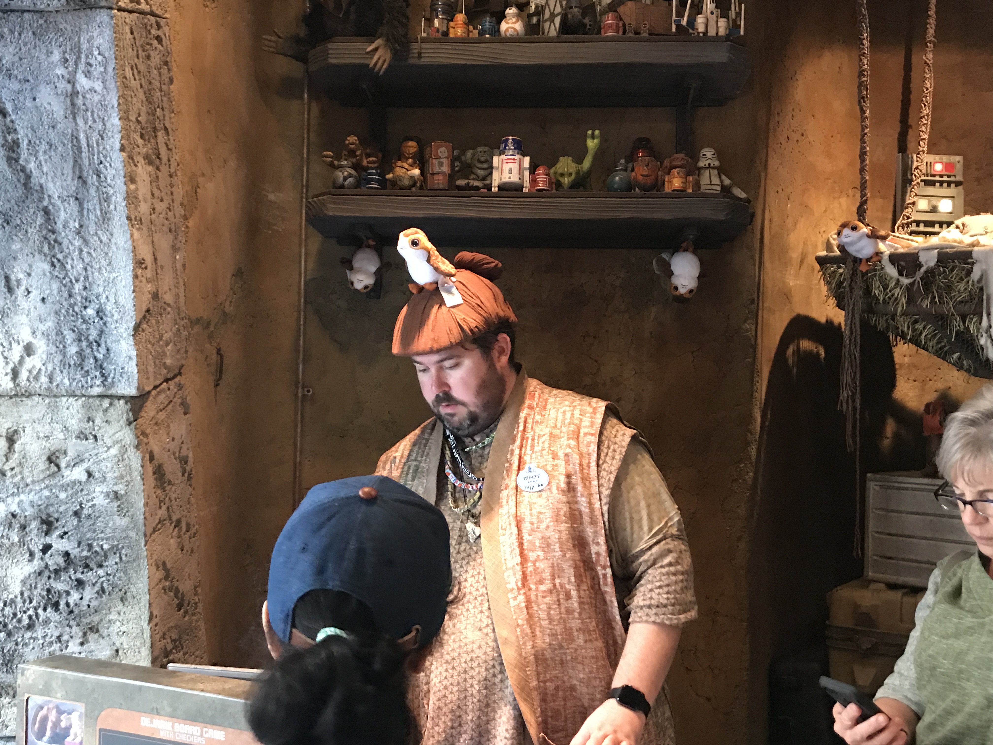 We appreciate that this Cast Member from Toydarian Toymaker allowed this tiny Porg to roost atop his hat.