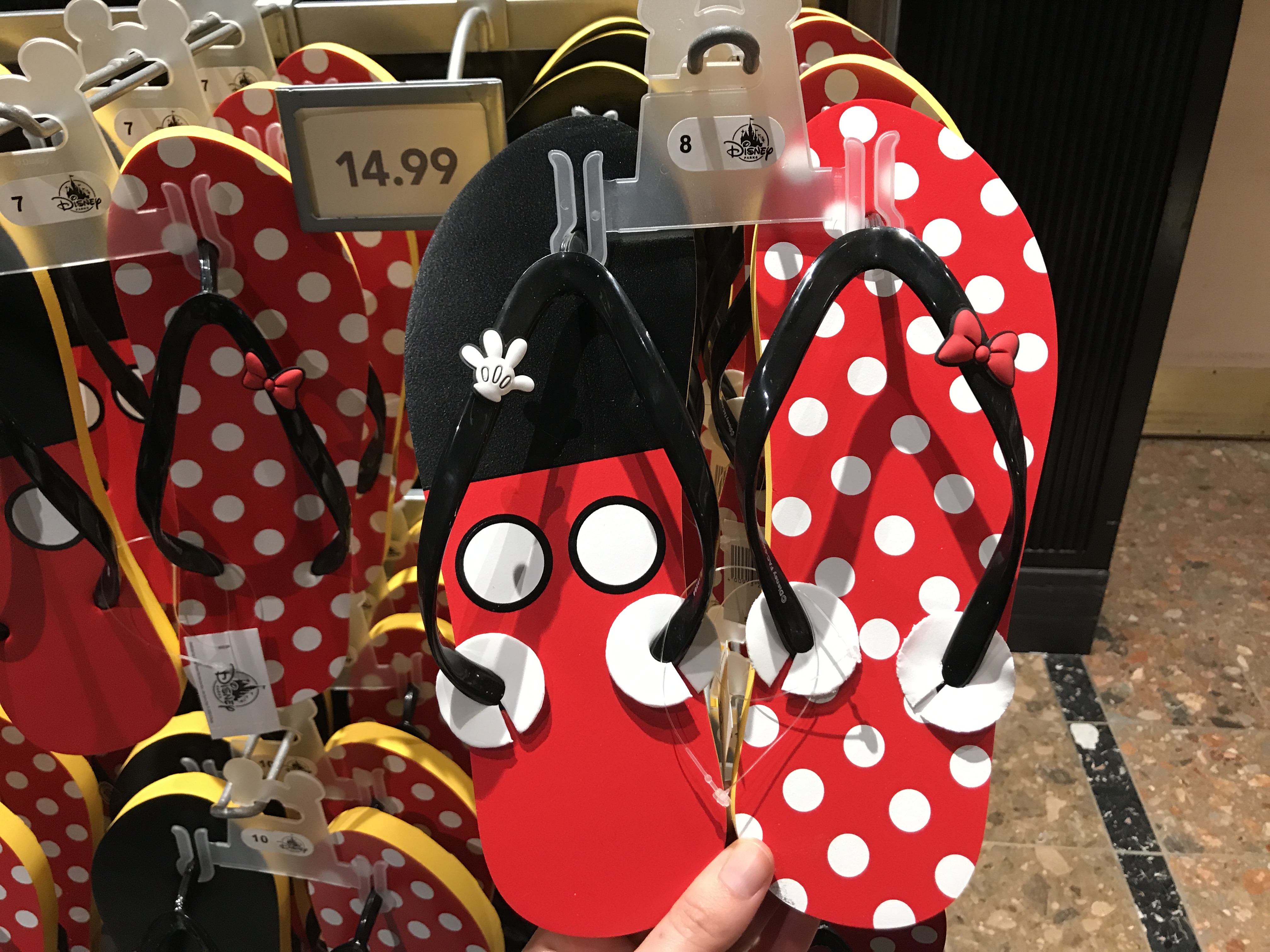 In Once Upon a Time (which was open before 7 a.m.), we found fun mismatched Mickey and Minnie flip-flops. The left shoe is inspired by Mickey and the right by Minnie. On the straps are a Mickey glove and Minnie bow accent.