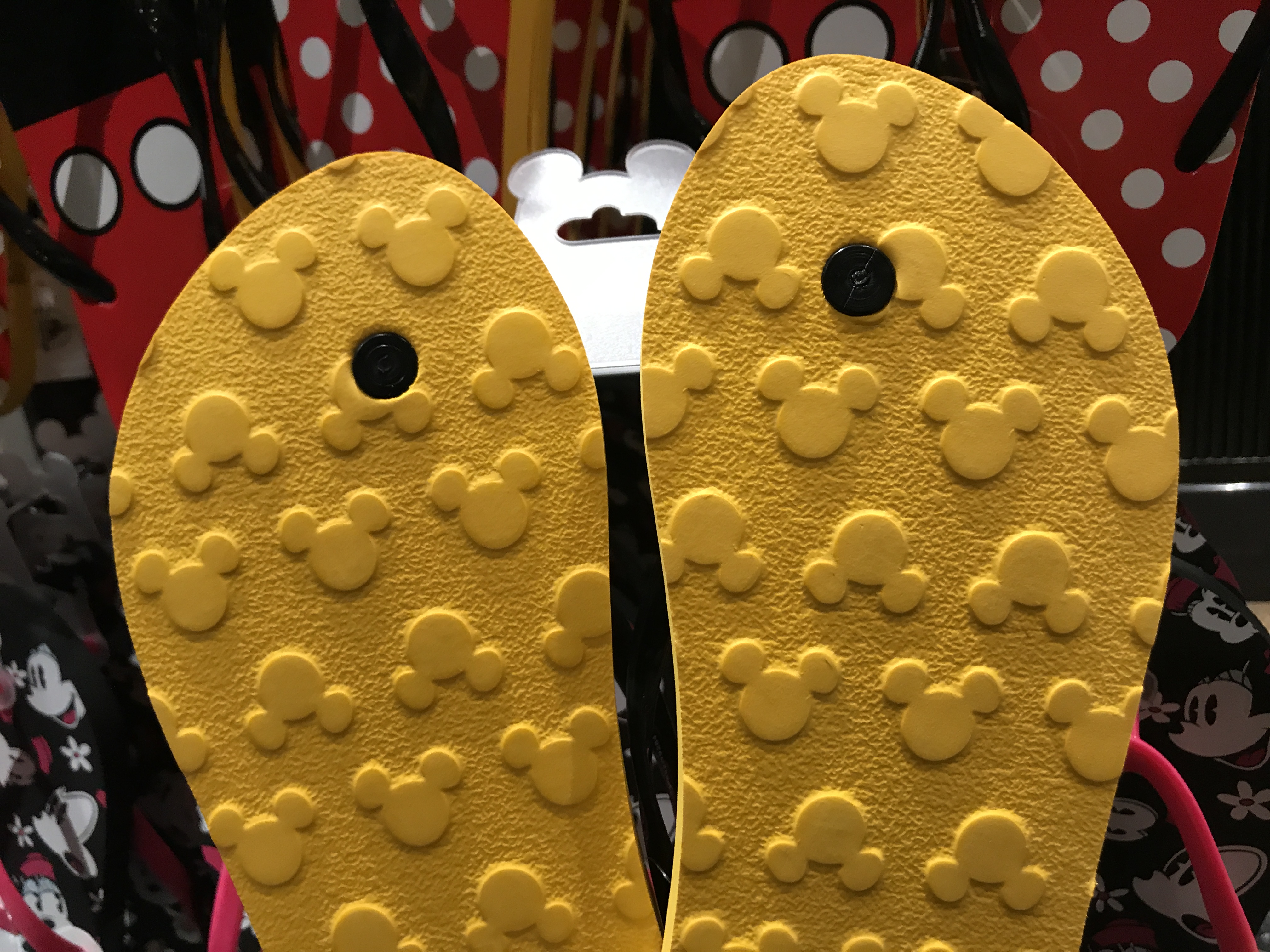 The bottom of the sandals are yellow with a sole pattern that will leave hidden Mickeys wherever you walk.