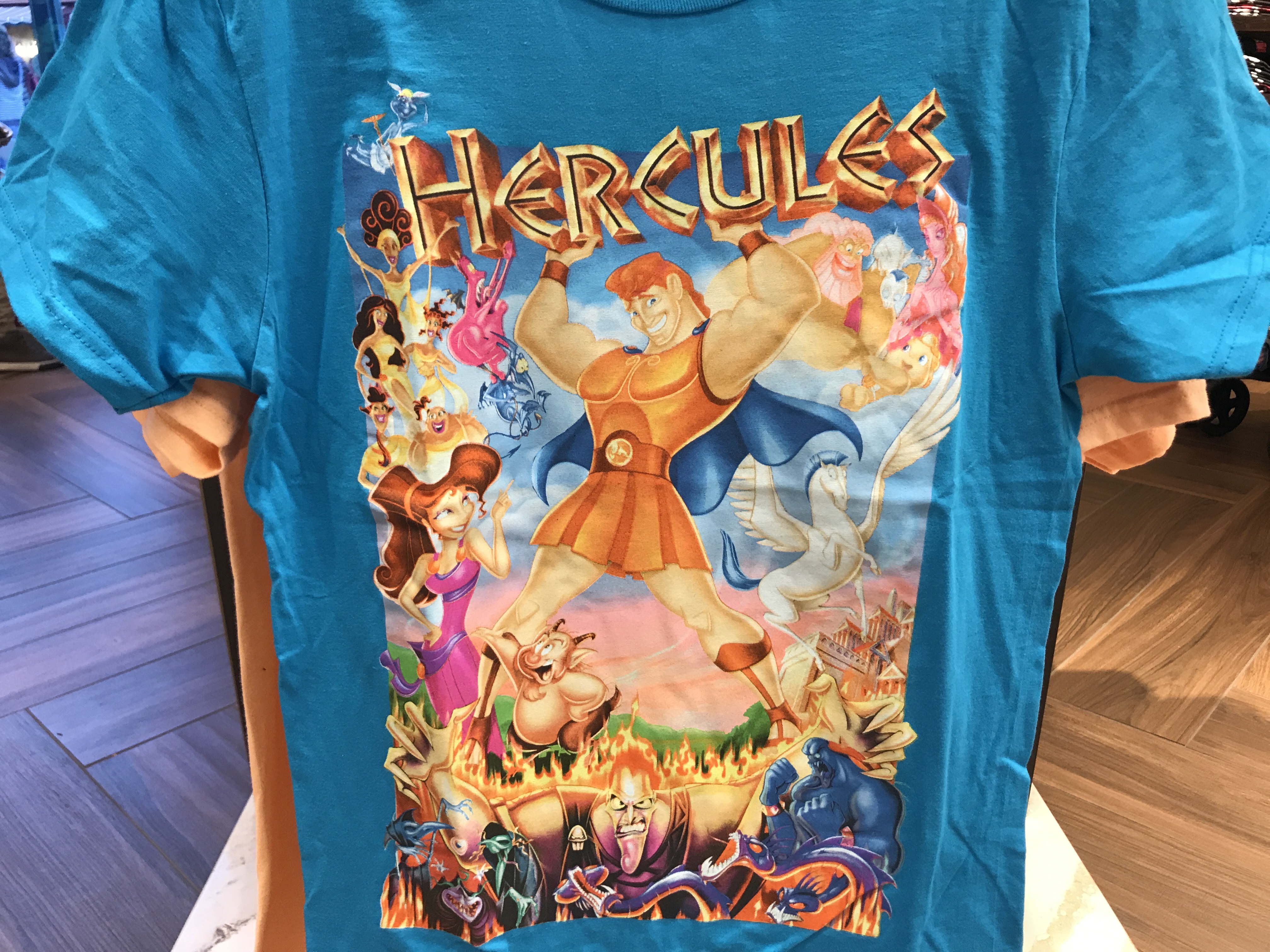 We might just be obsessed with this second shirt, because it looks straight up out of the 90s. This blue “Hercules” tee shows Hercules power lifting the film’s logo.