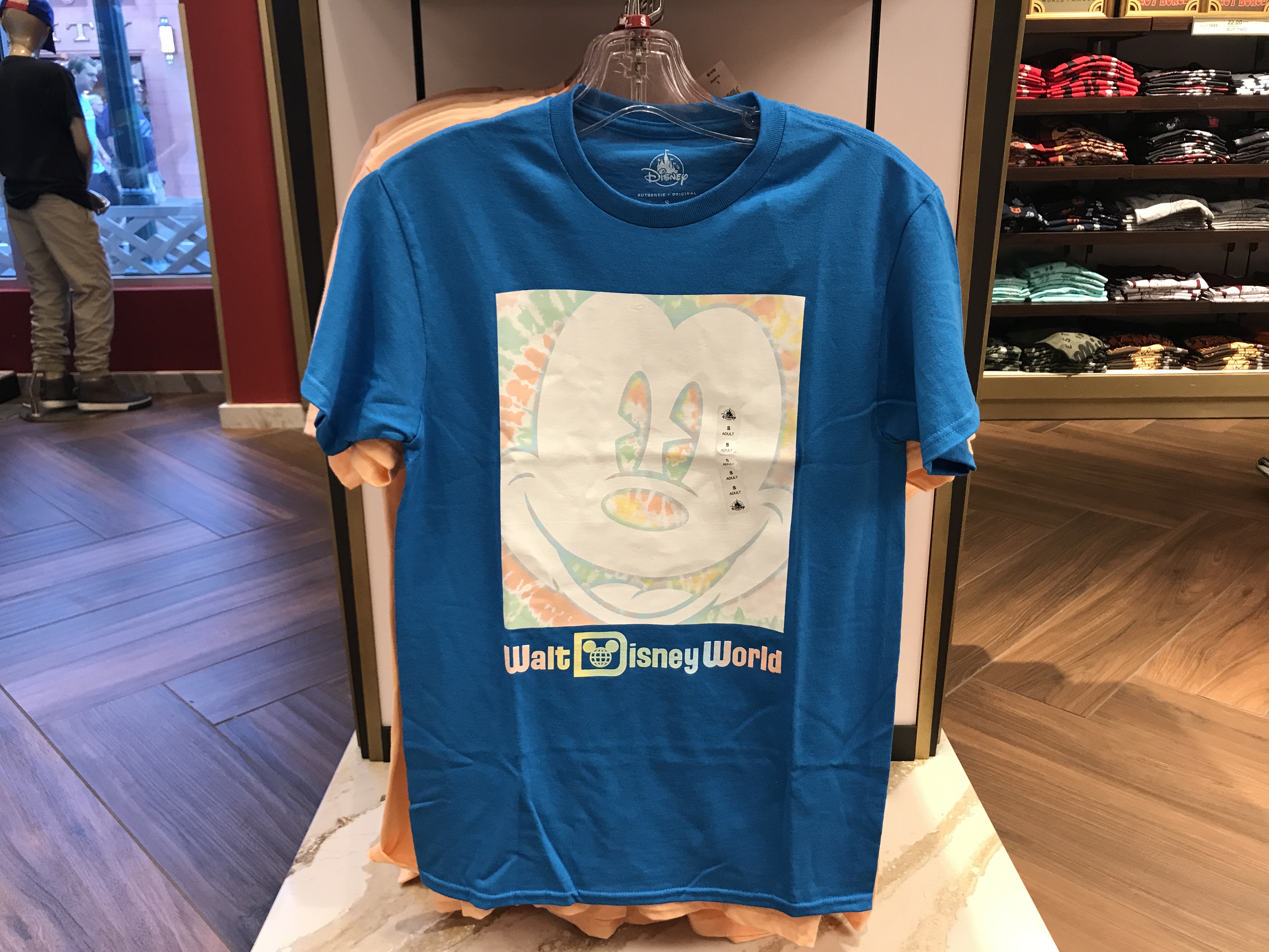 At Mickey’s of Hollywood, we came across more new adult t-shirt designs. The first shirt is blue with a pastel tie dye graphic of Mickey’s face in the center. Below Mickey’s face is the original Walt Disney World logo.