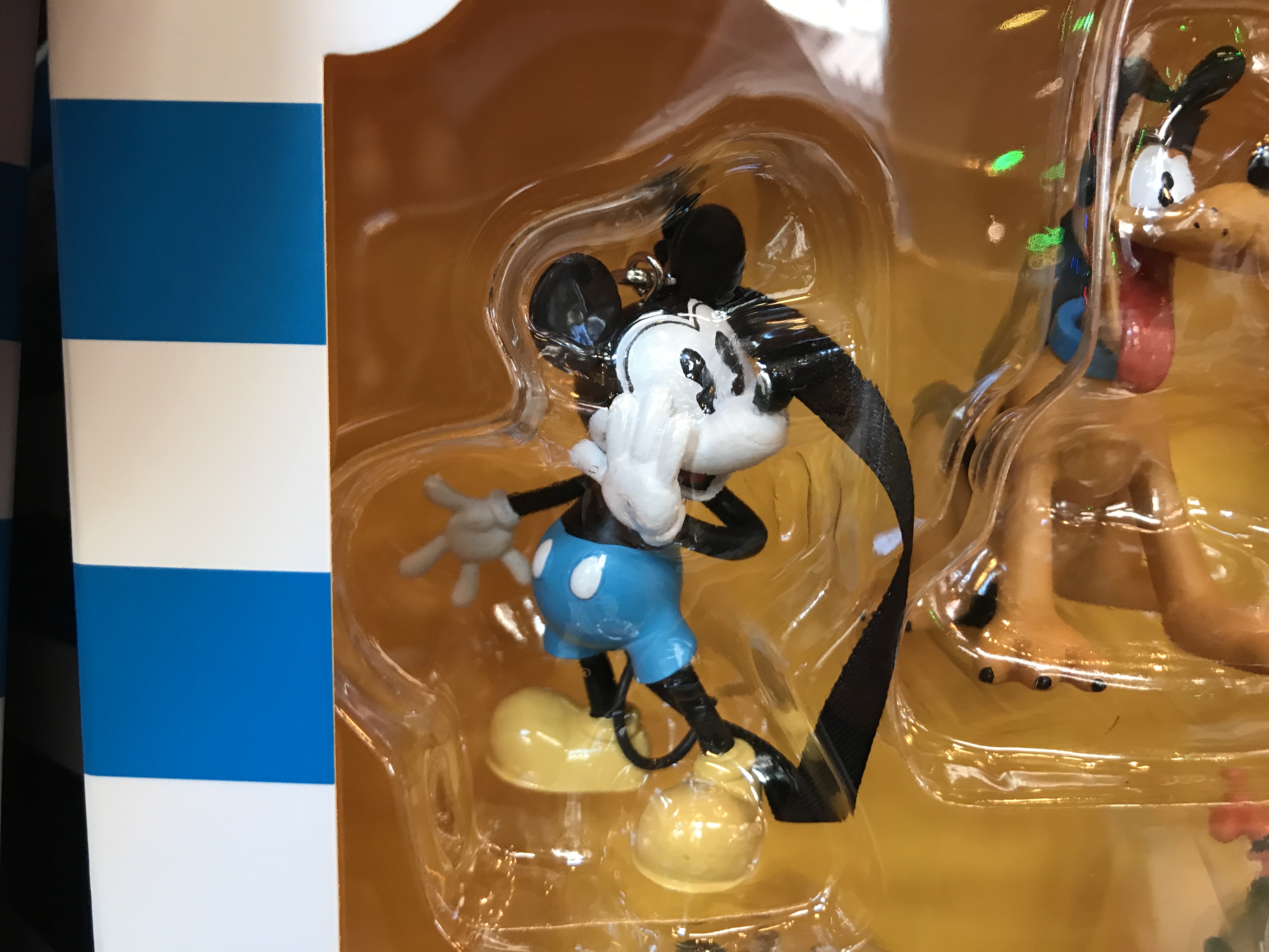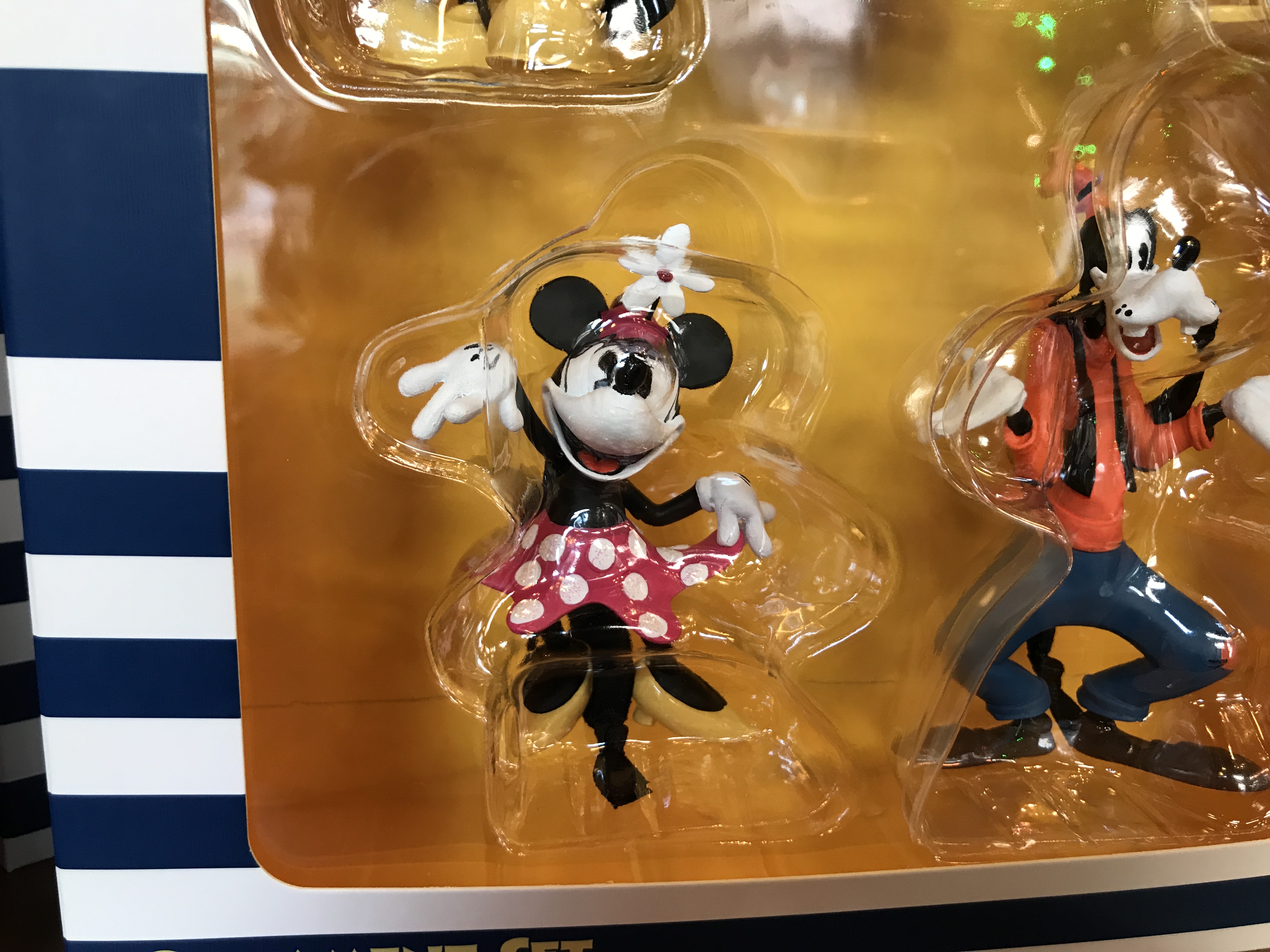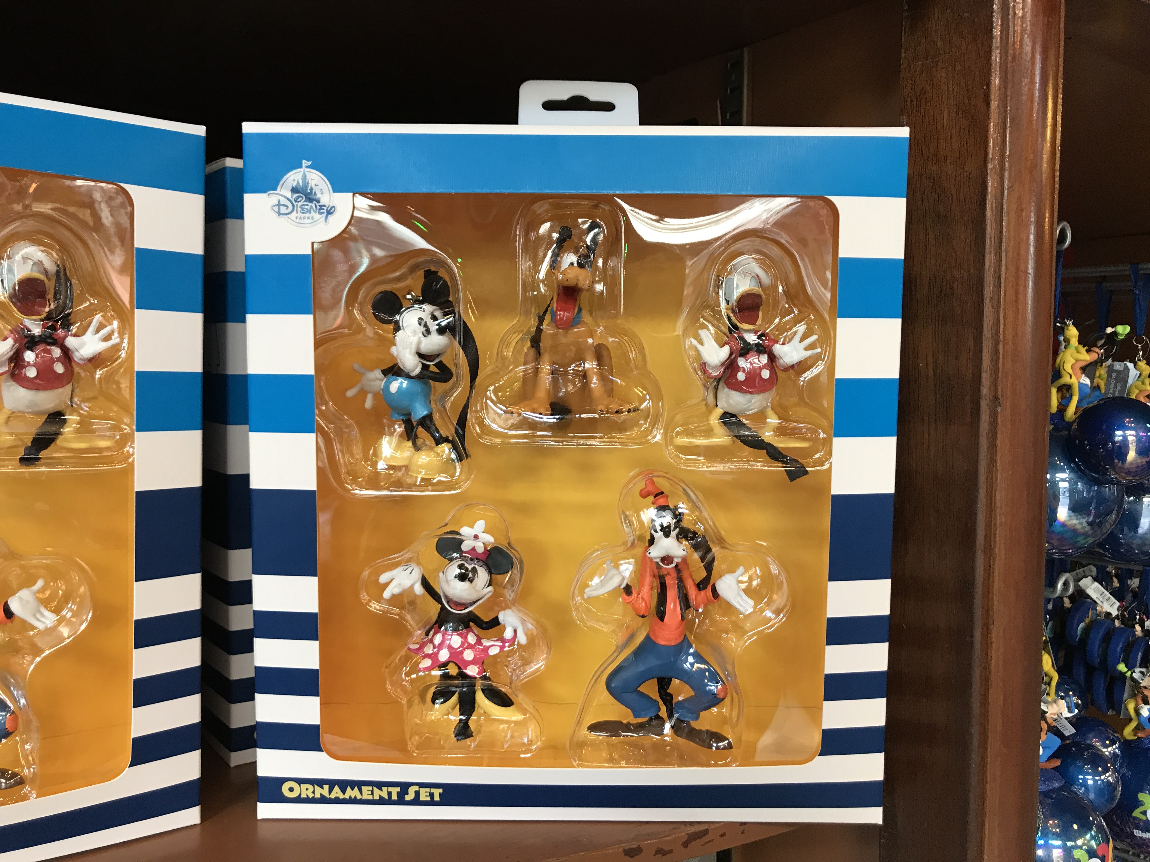 Mickey, wearing blue pants, holds his hand up to his mouth like he’s telling a secret. This ornament set costs $34.99.
