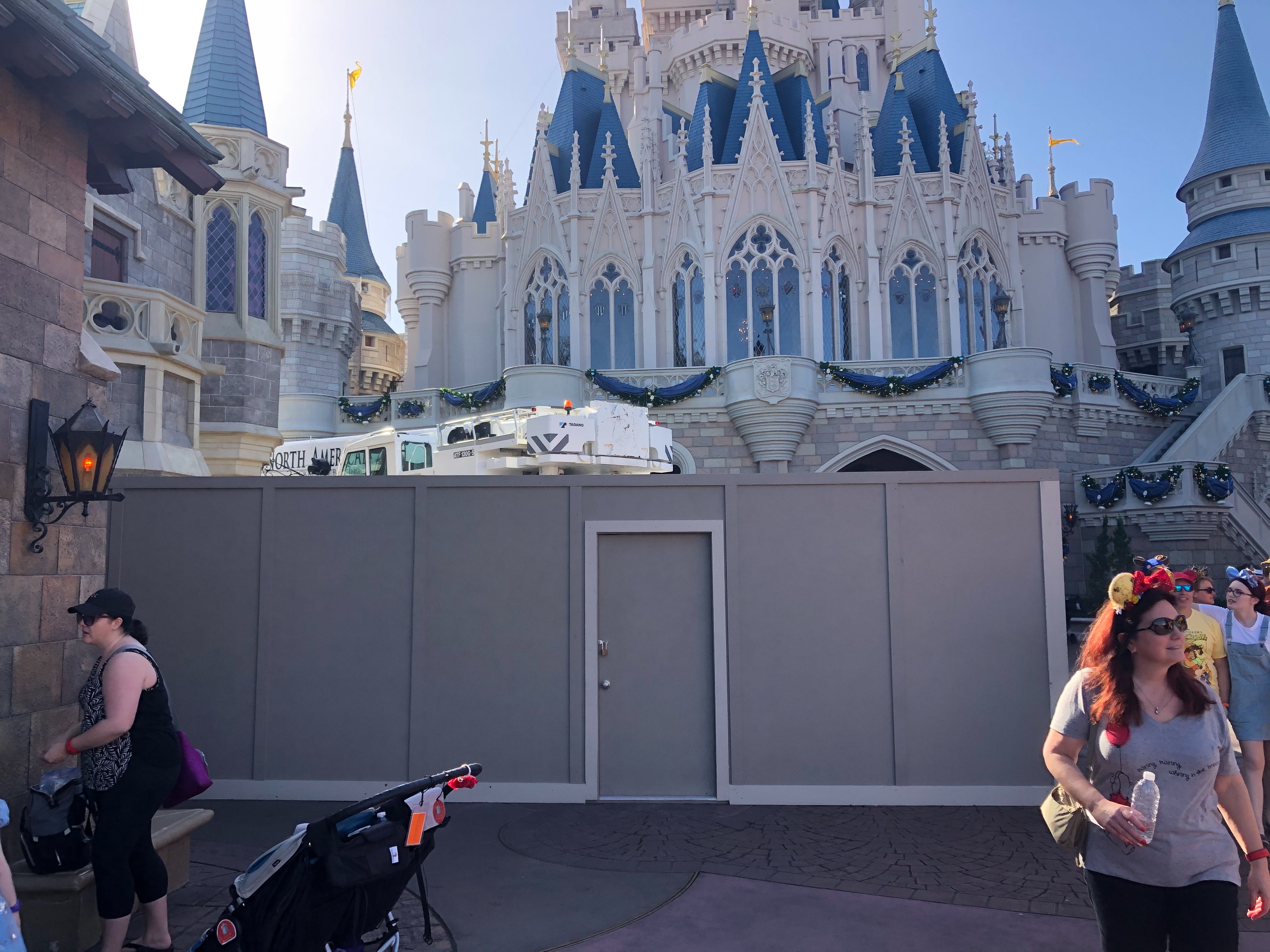 The Christmas decorations are getting ready to come down. The pathway from Fantasyland towards Tomorrowland is closed off for the giant crane.