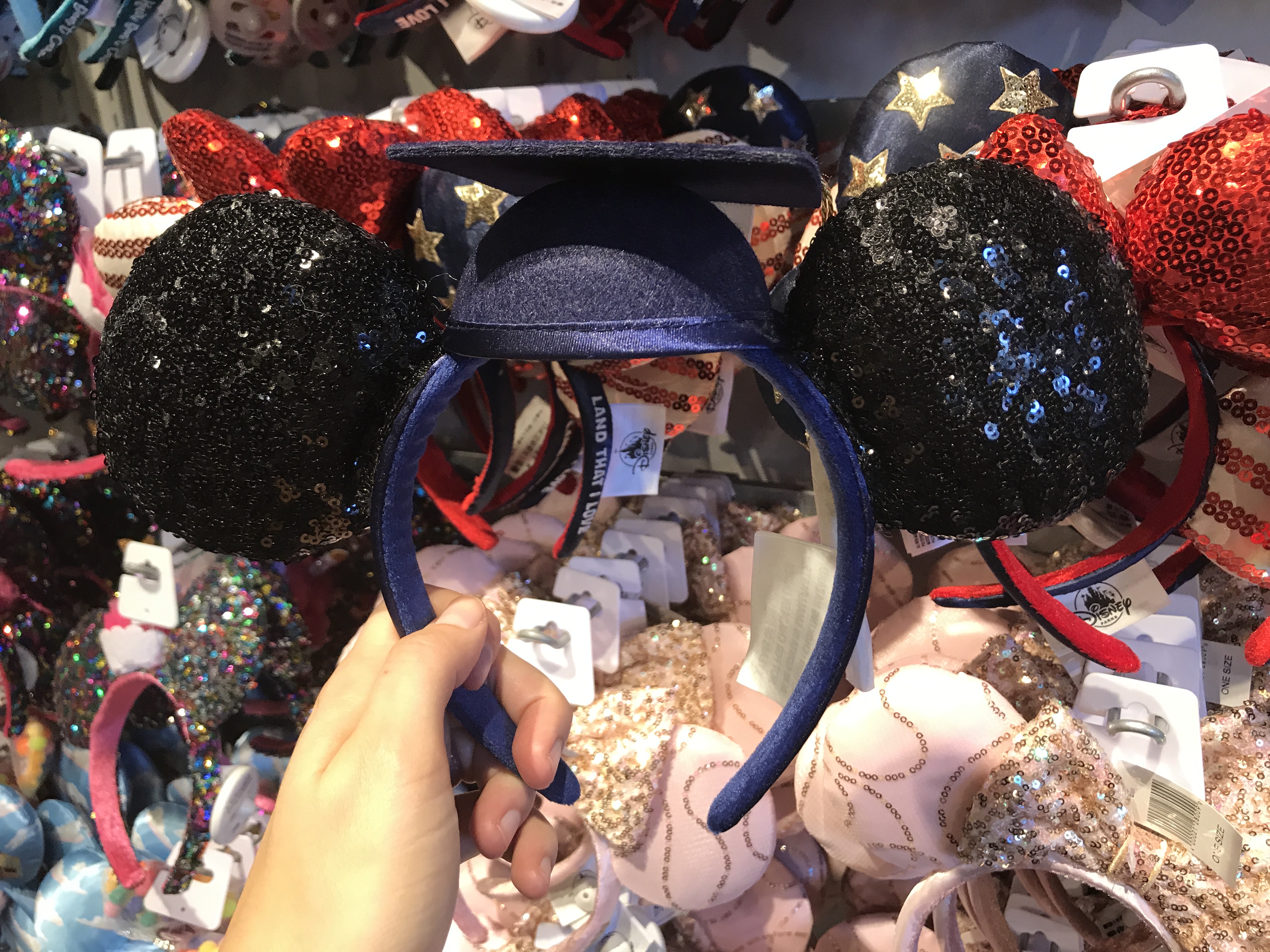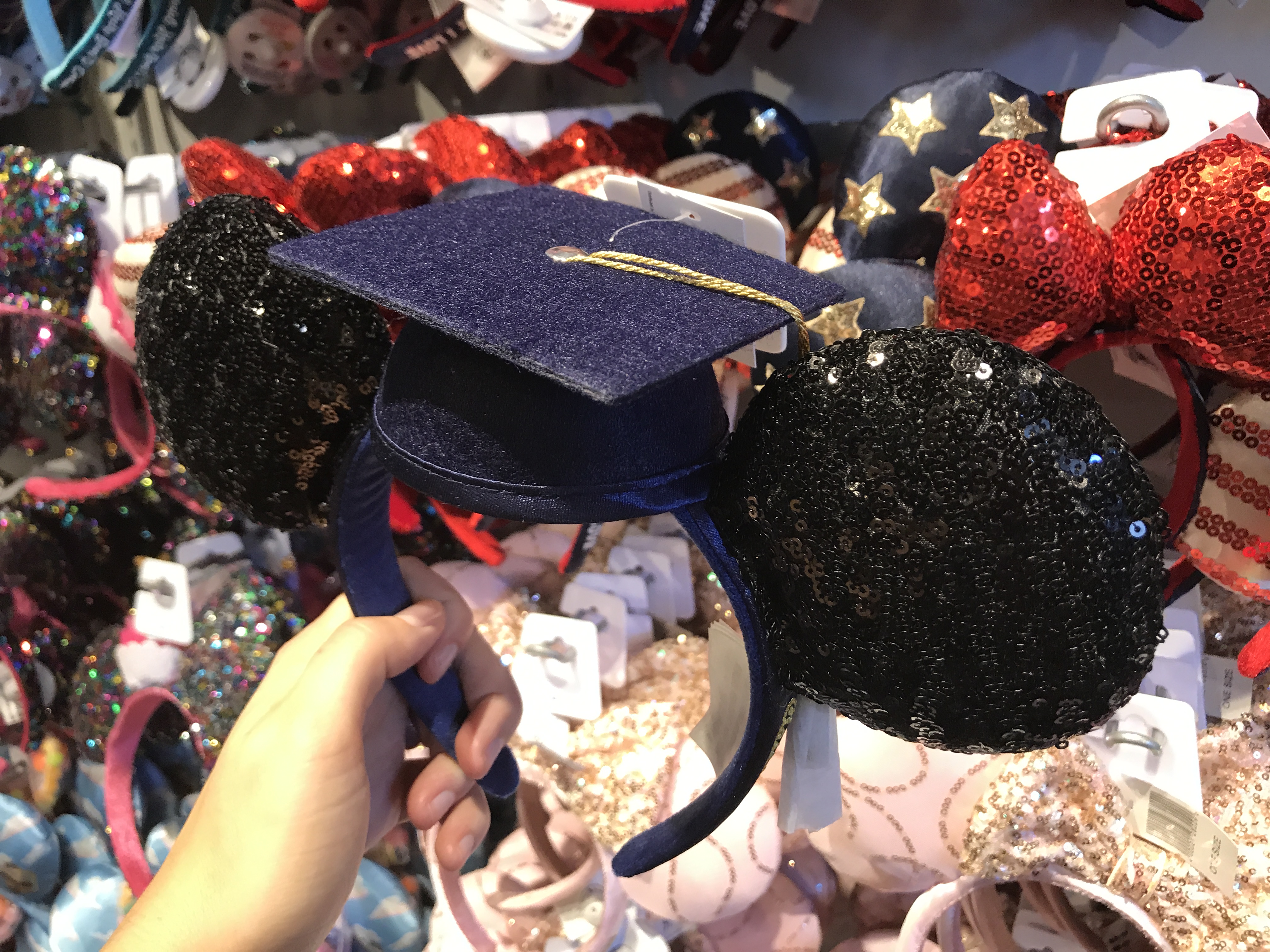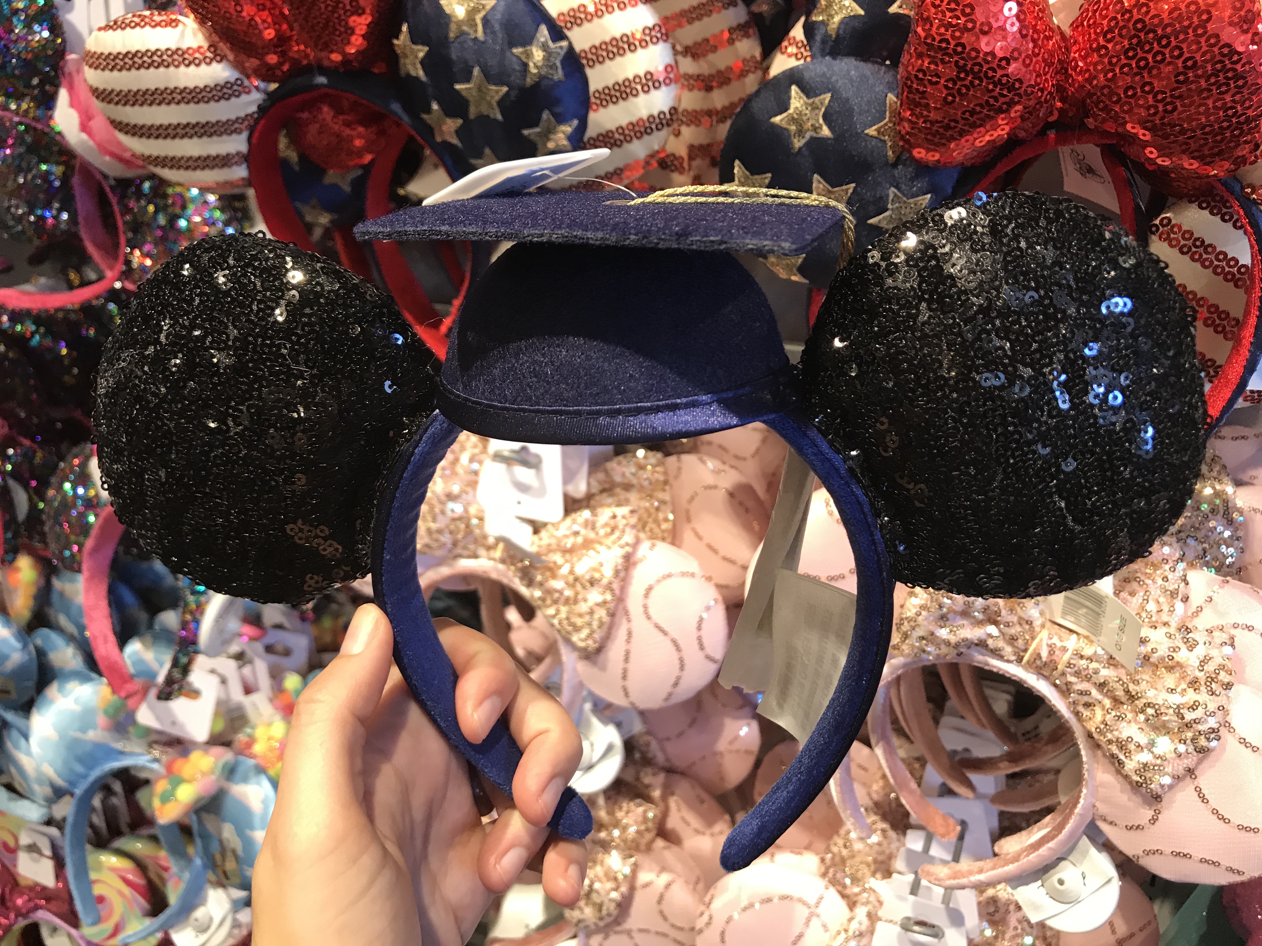 These ear headbands are a similar design to the “Class of 2019” ones. They have classic black sequin Mickey ears with a navy felt mortarboard graduation cap in the center.
