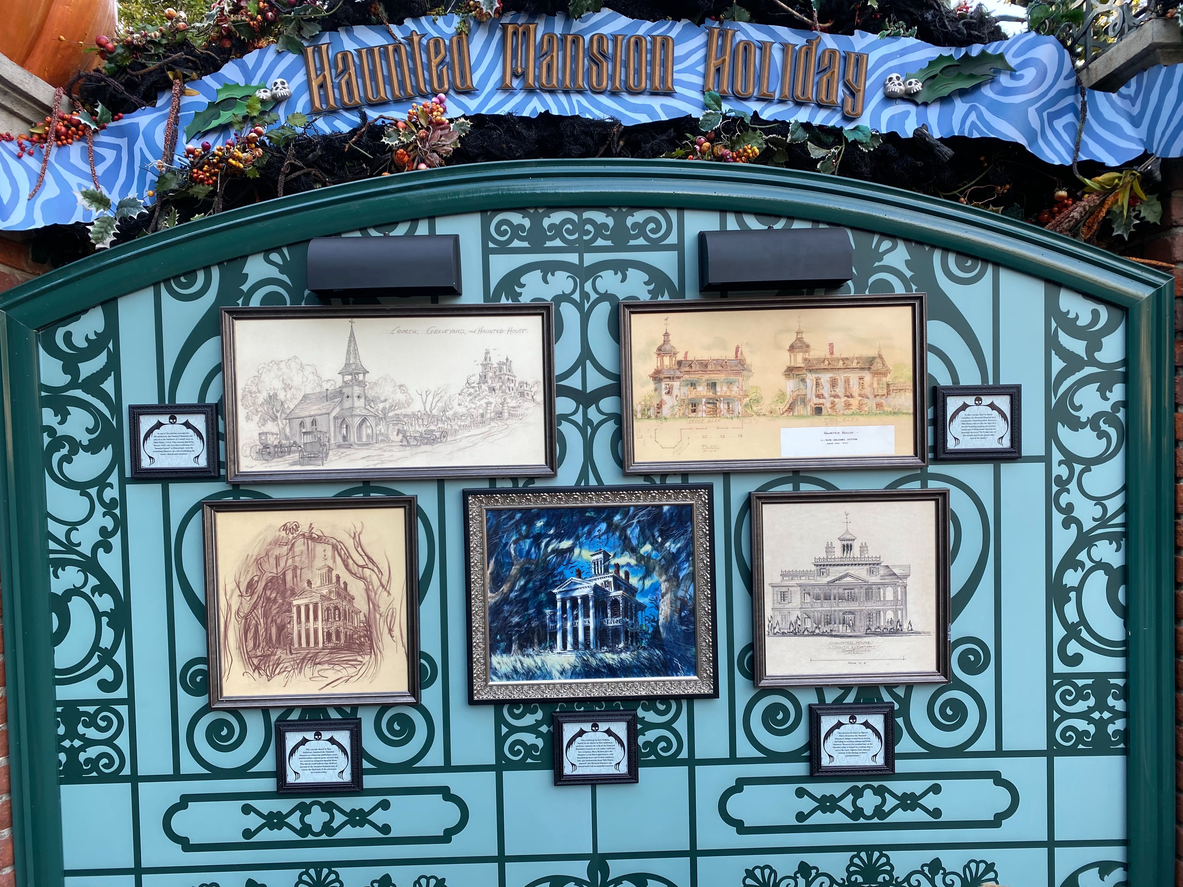 Of course, the 999 happy haunts didn’t leave guests completely empty-handed. Instead, they brought in some ghosts from the past. The construction wall at the attraction’s entrance has been populated with concept art from the attraction’s development.
