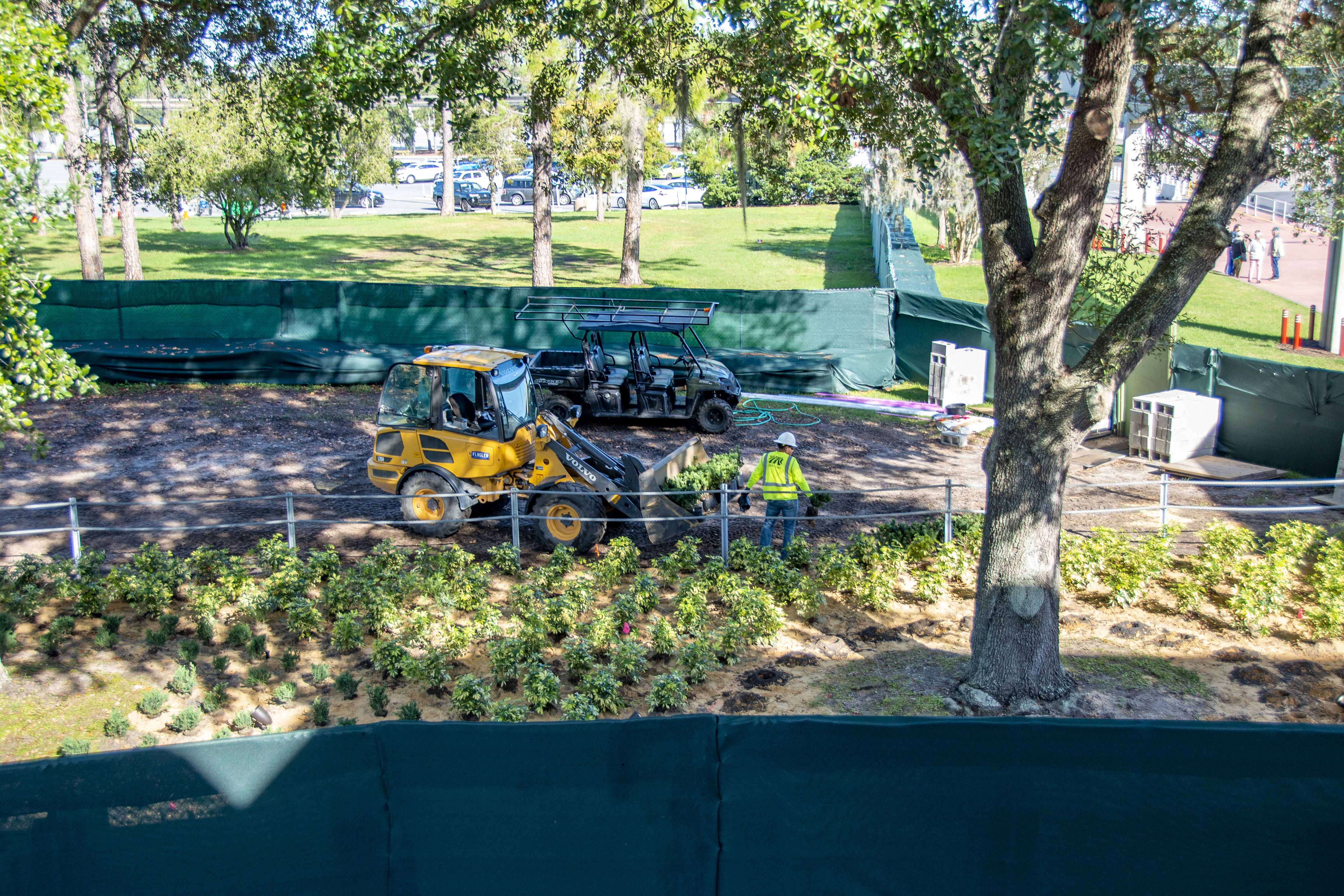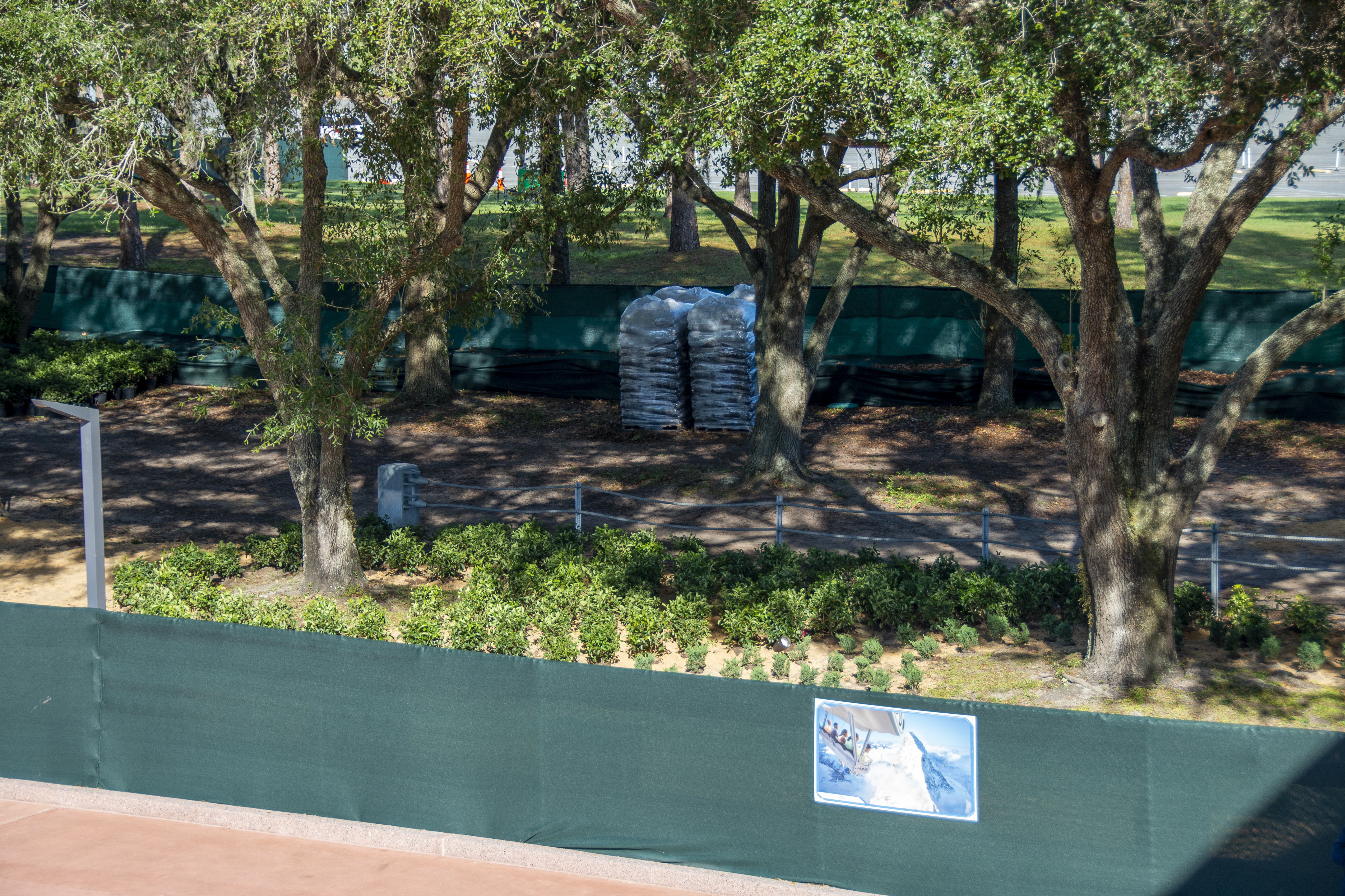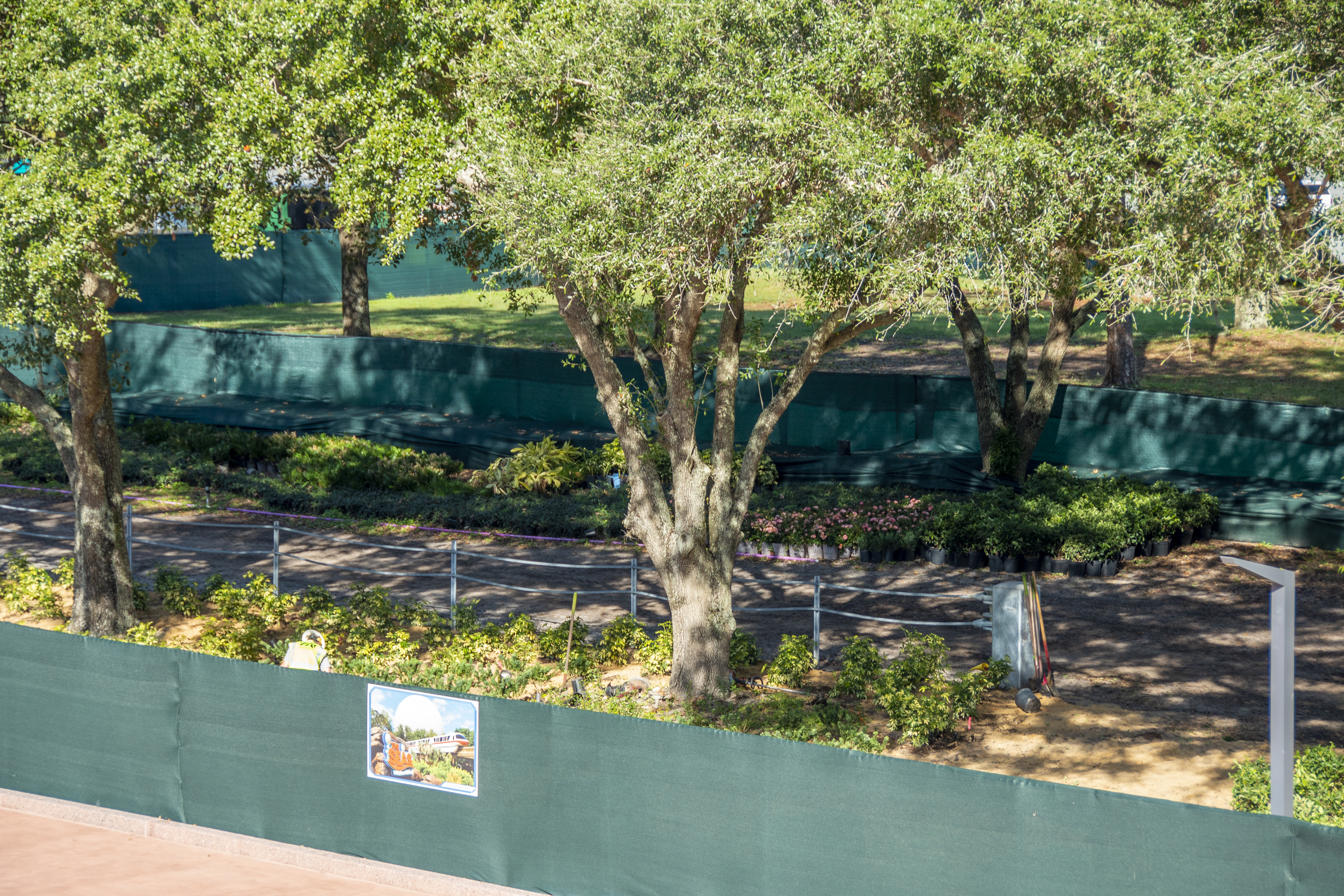 Behind the construction scrims near the security screening on the west side of the entrance, we can see numerous potted plants have been staged for planting here.