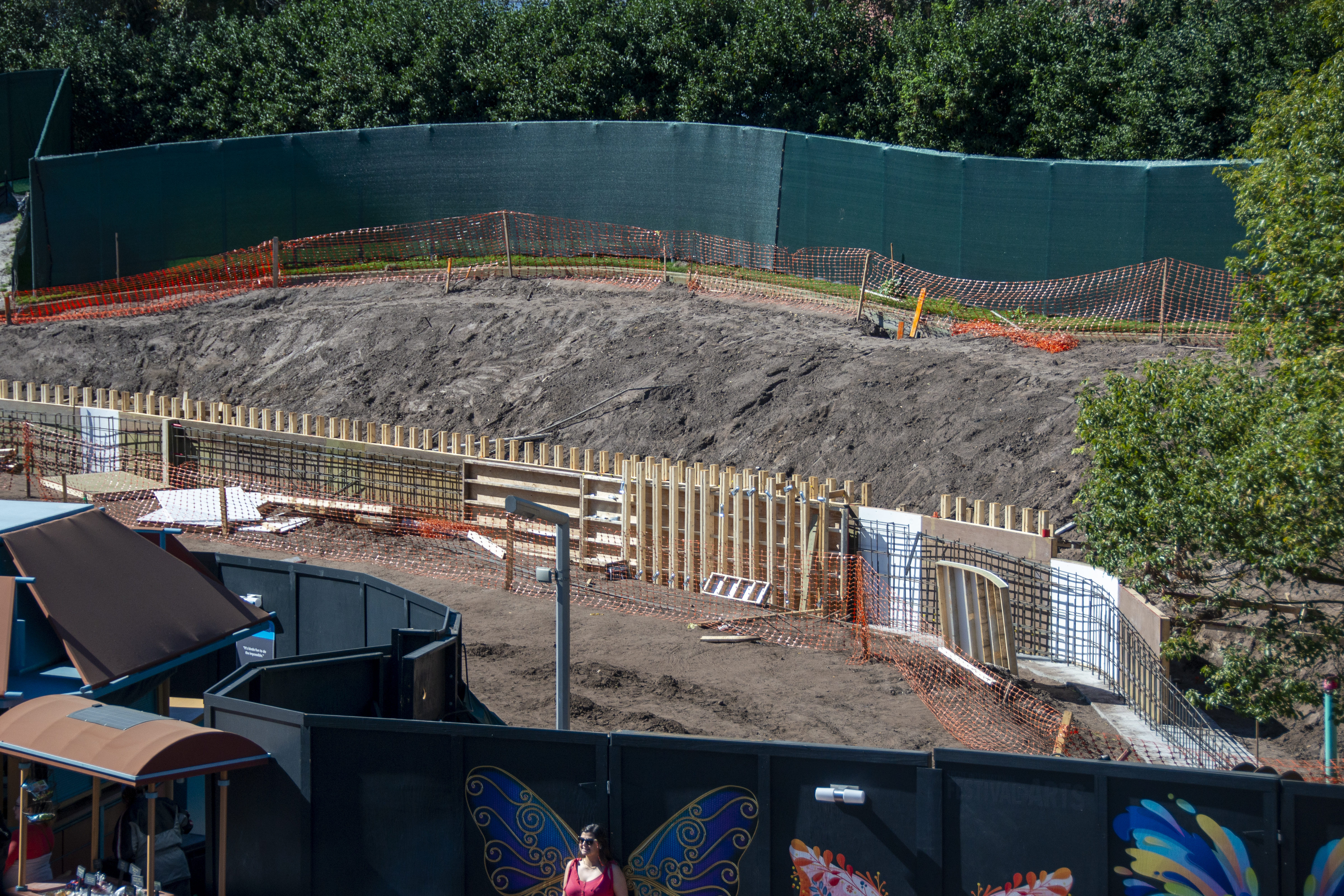 Over near Imagination! and The Land, frames continue to be put into place as wall segments are poured. We still have no word on what this work here is leading towards, but we will keep an eye on the site.