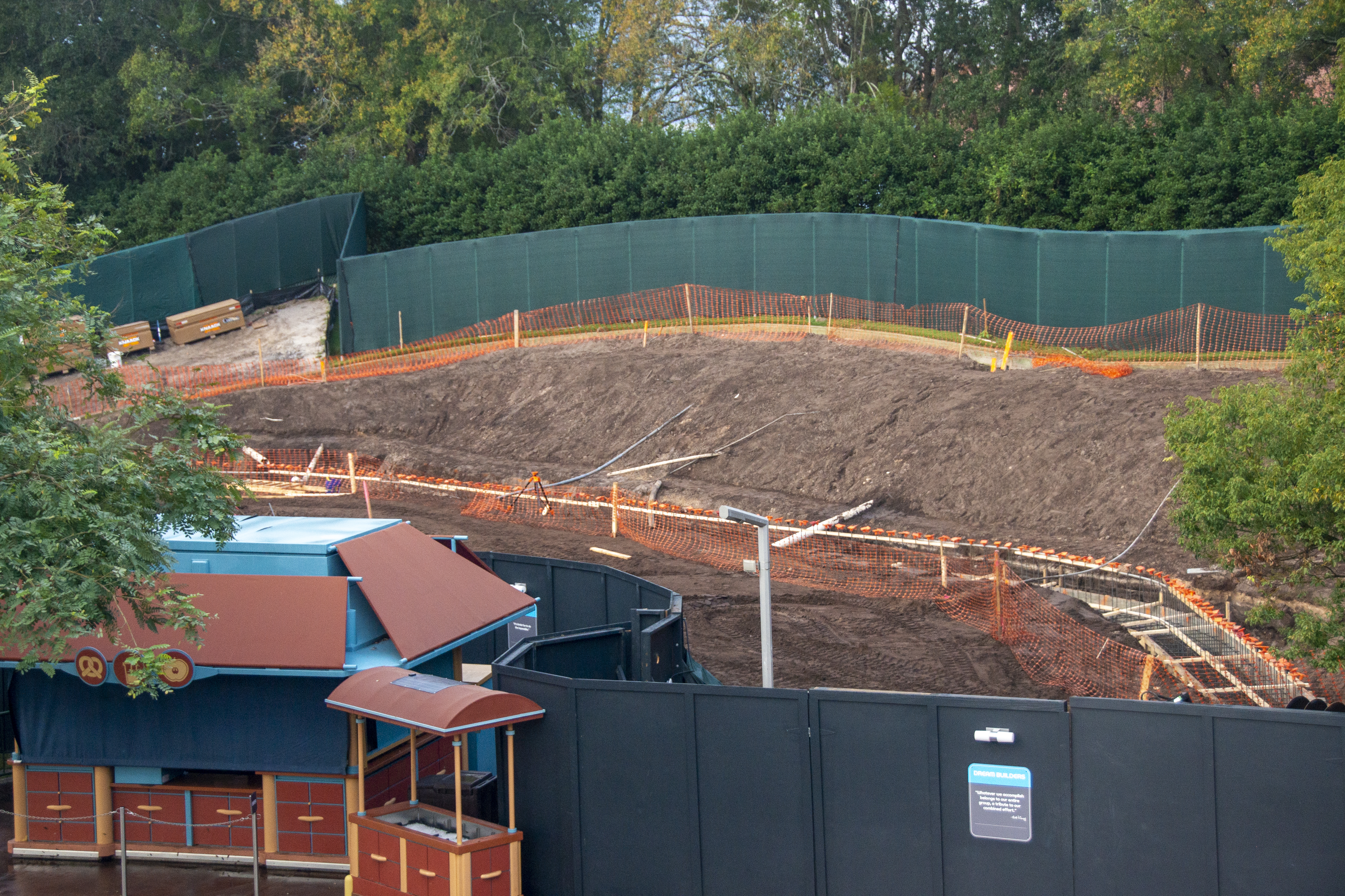 The mystery of the ongoing “landscaping” work between The Land and Imagination! continues to deepen. The framing for what looks to be a new retaining wall is in place while the ground in front has been leveled.