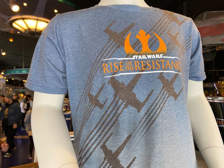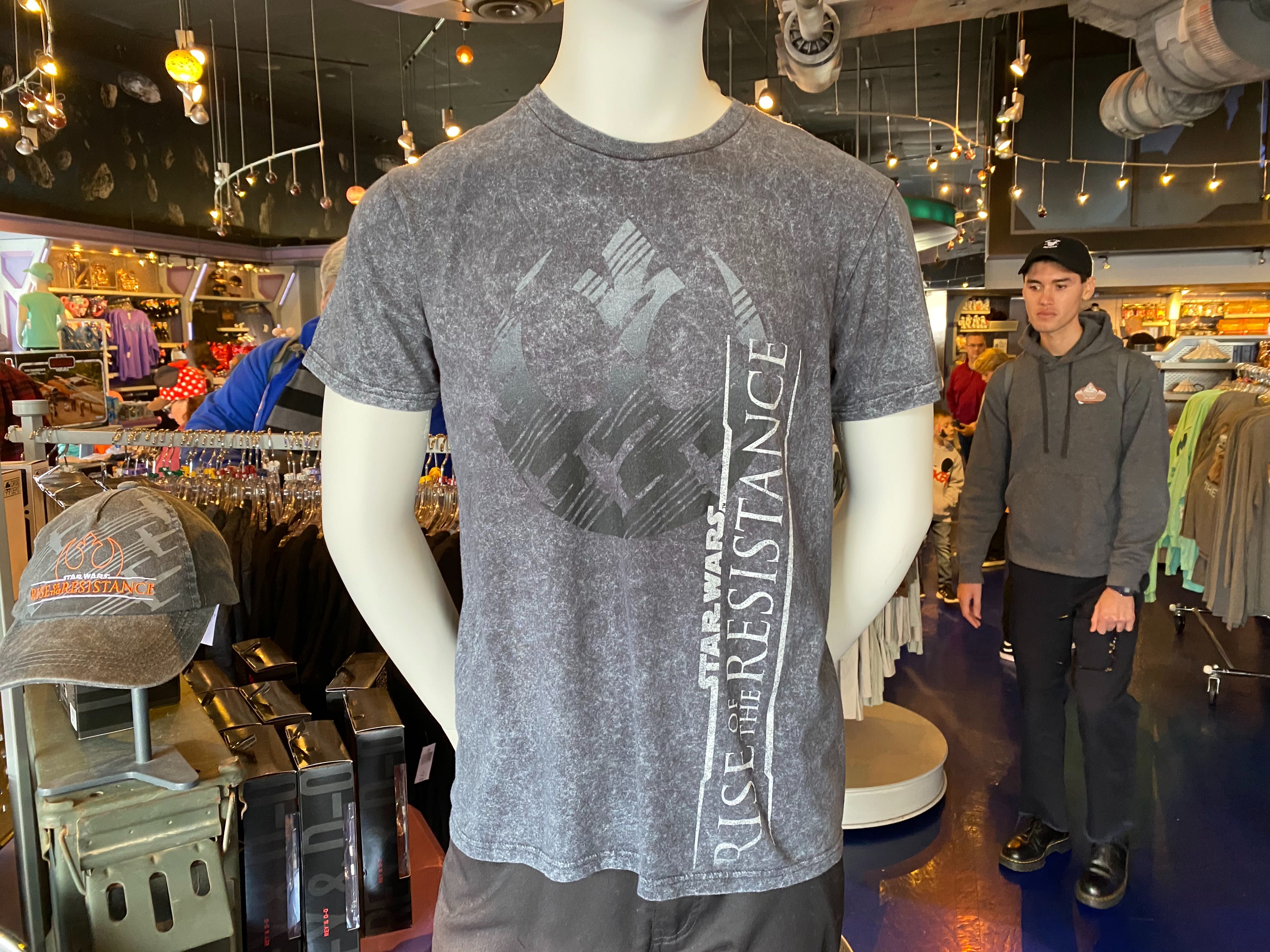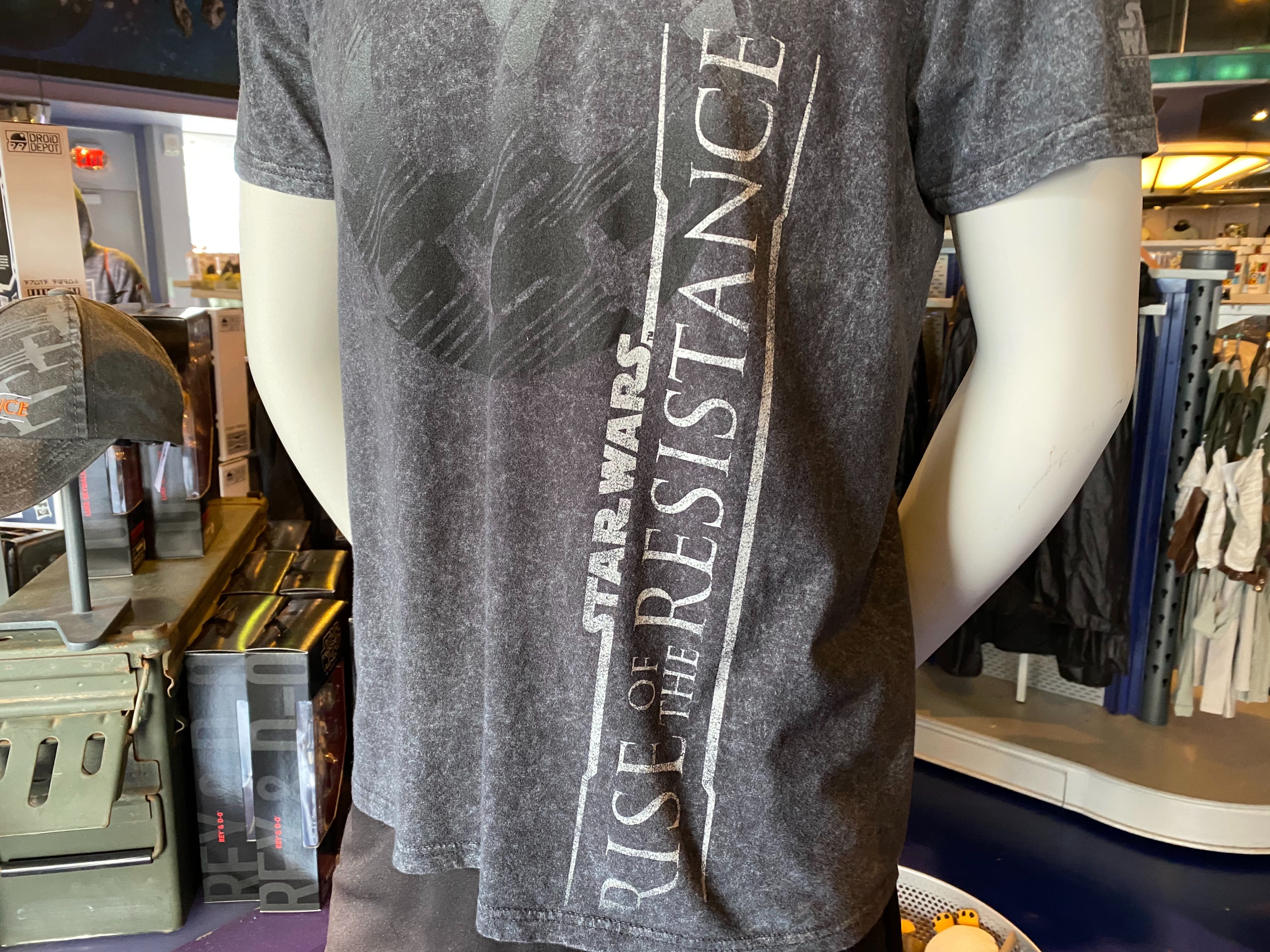 Down the side of the front of the shirt is large white text that says, “Star Wars Rise of the Resistance.”