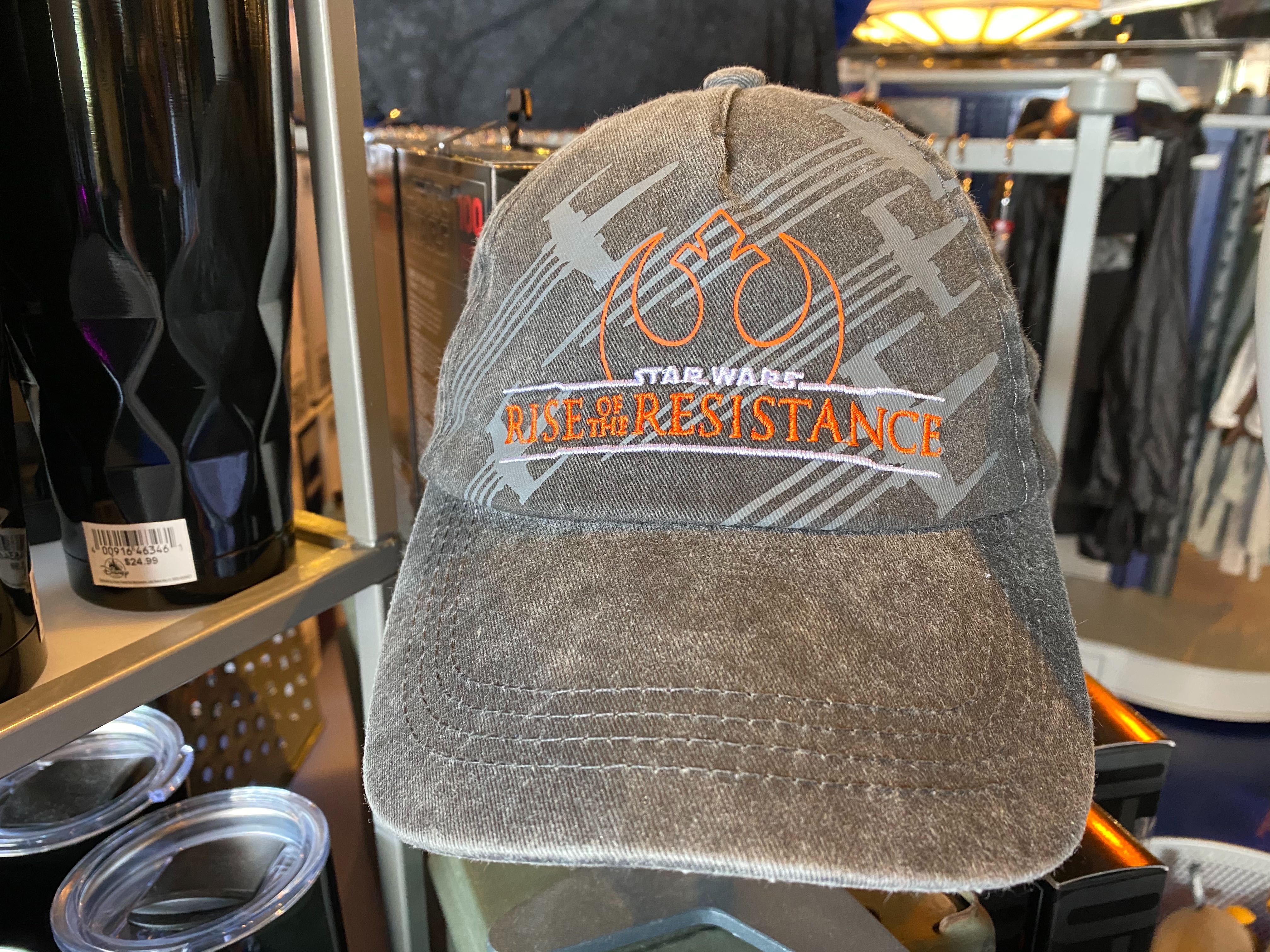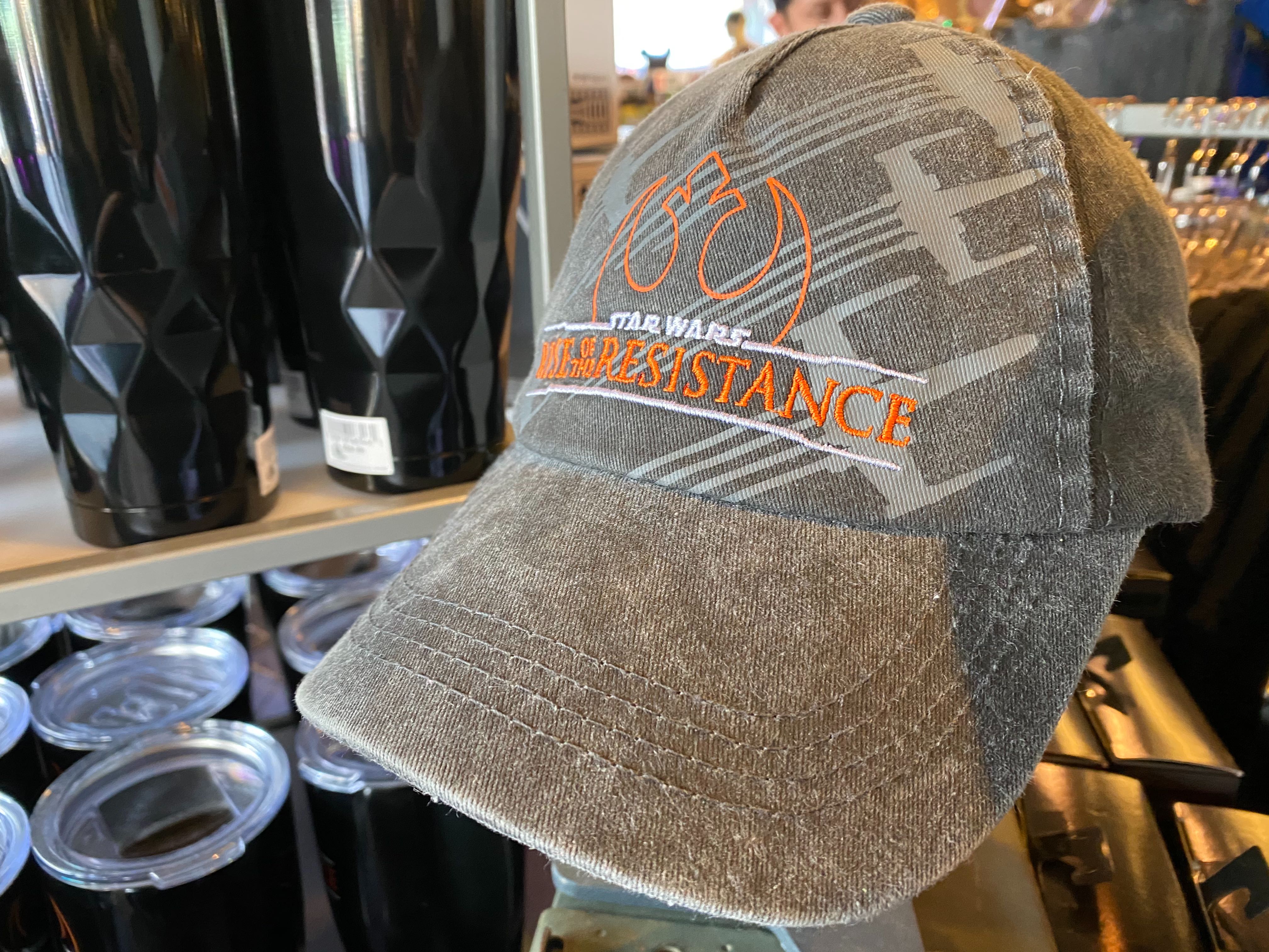 This hat features a gray and white weathered background (similar to the t-shirt), so these items could pair together nicely. On the front of the hat in bright orange text is “Star Wars Rise of the Resistance,” with the rebel alliance symbol behind it.