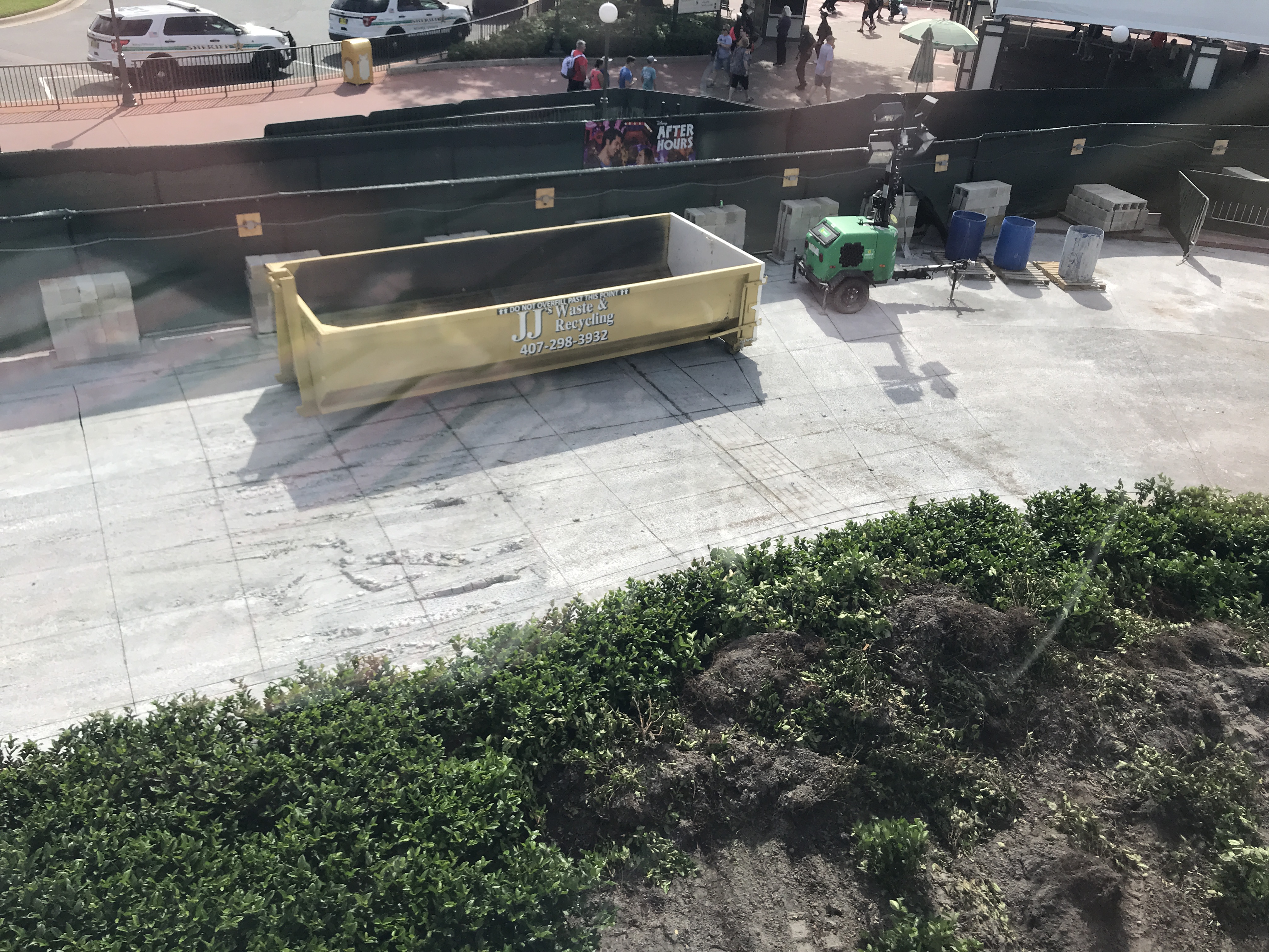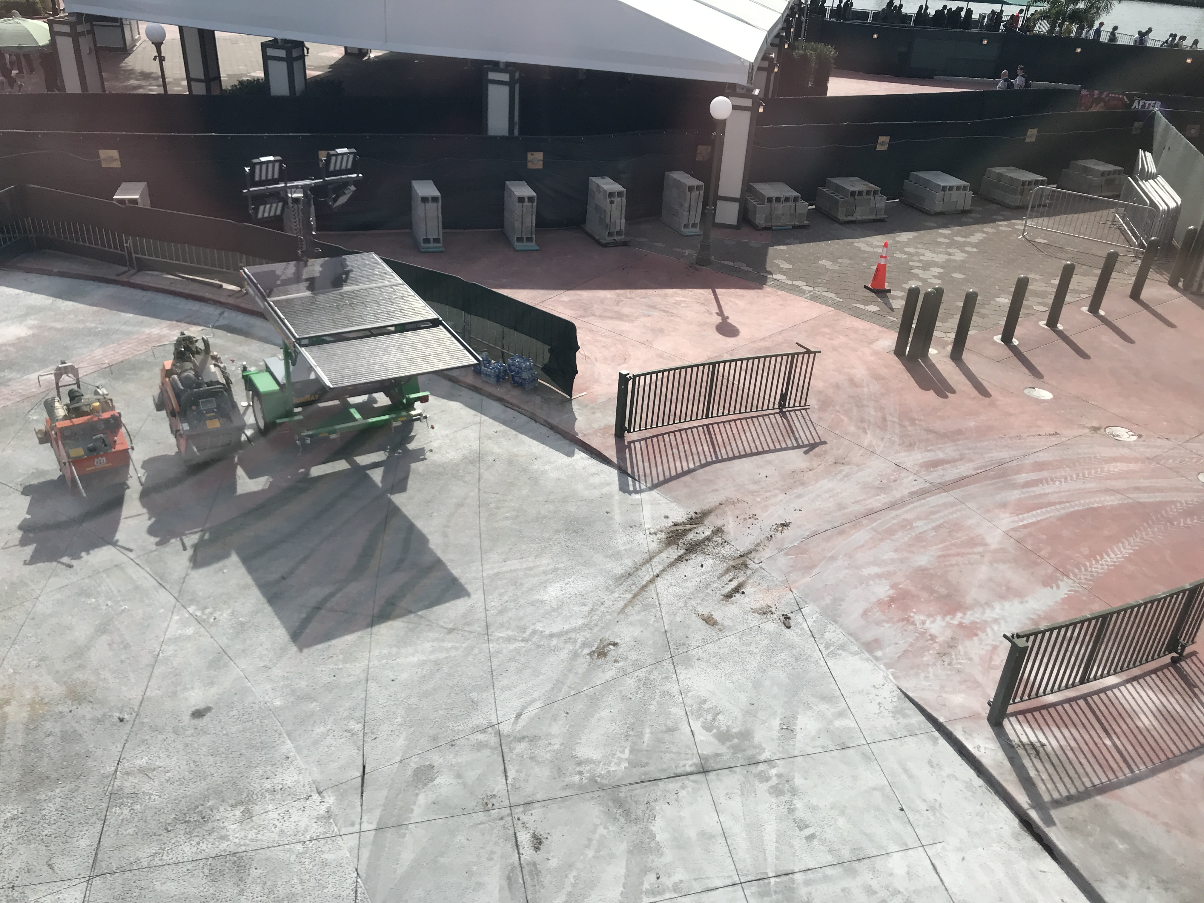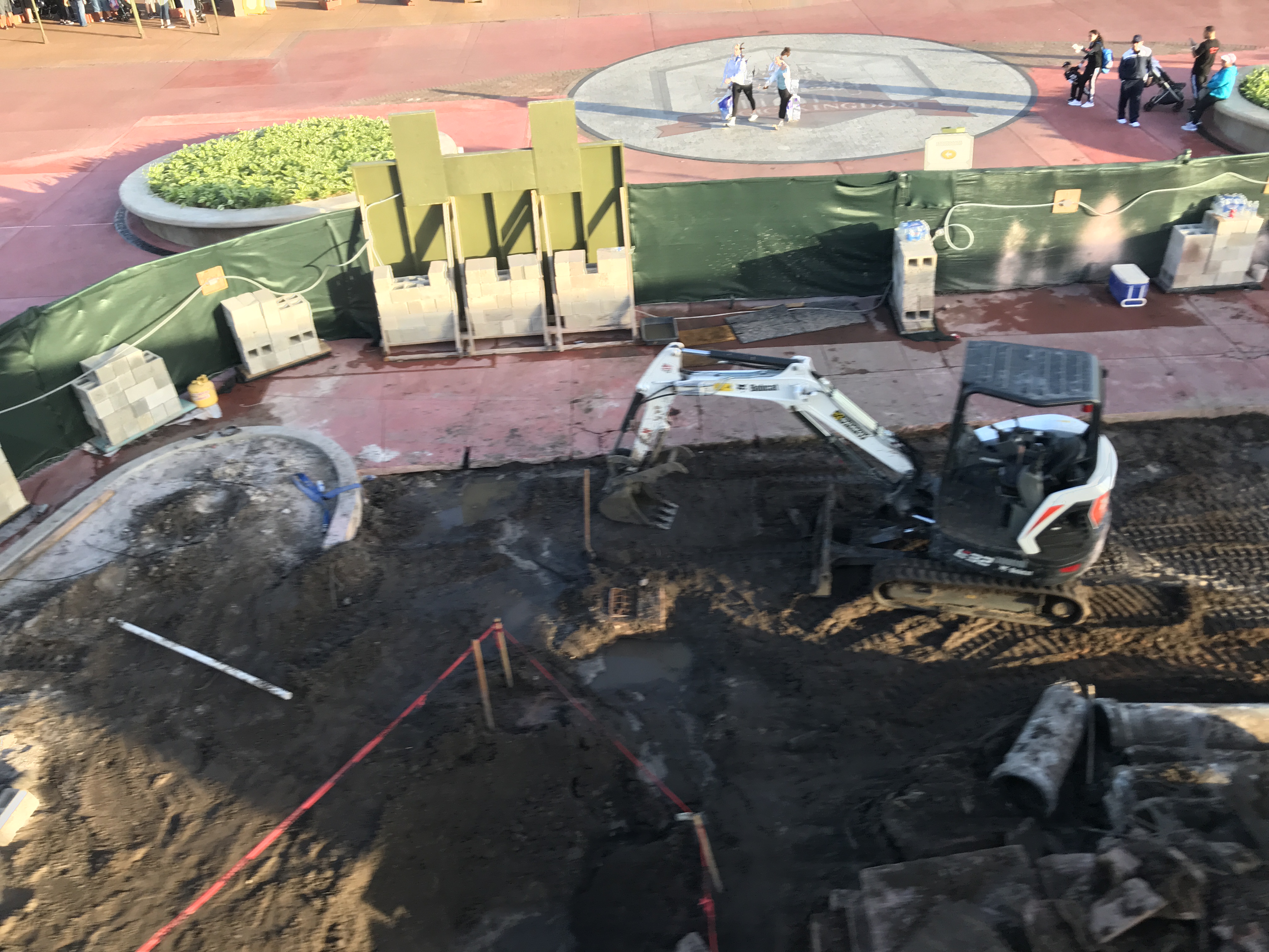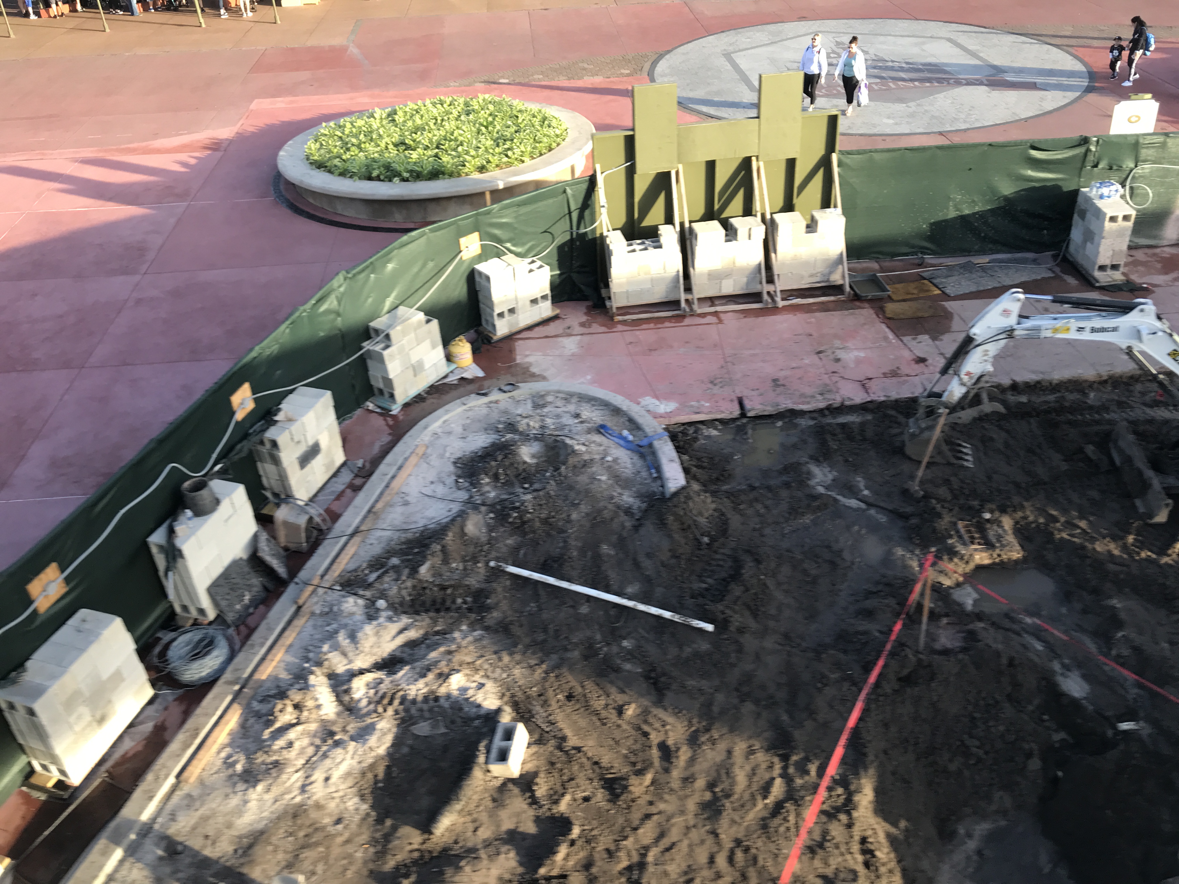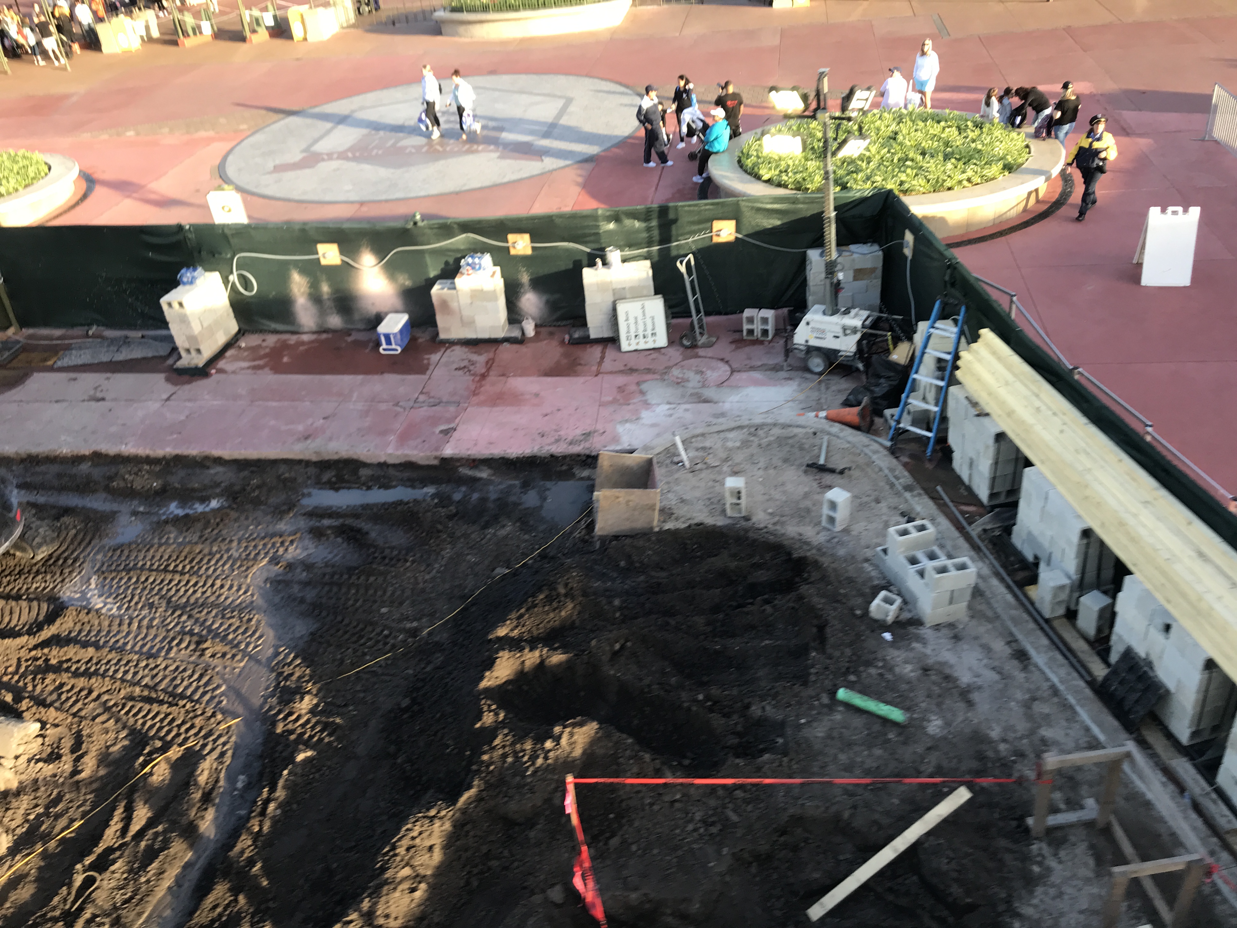 Within this newly combined construction area, the walkway pavement has been ripped up. Dark dirt now covers part of the recently built planters.