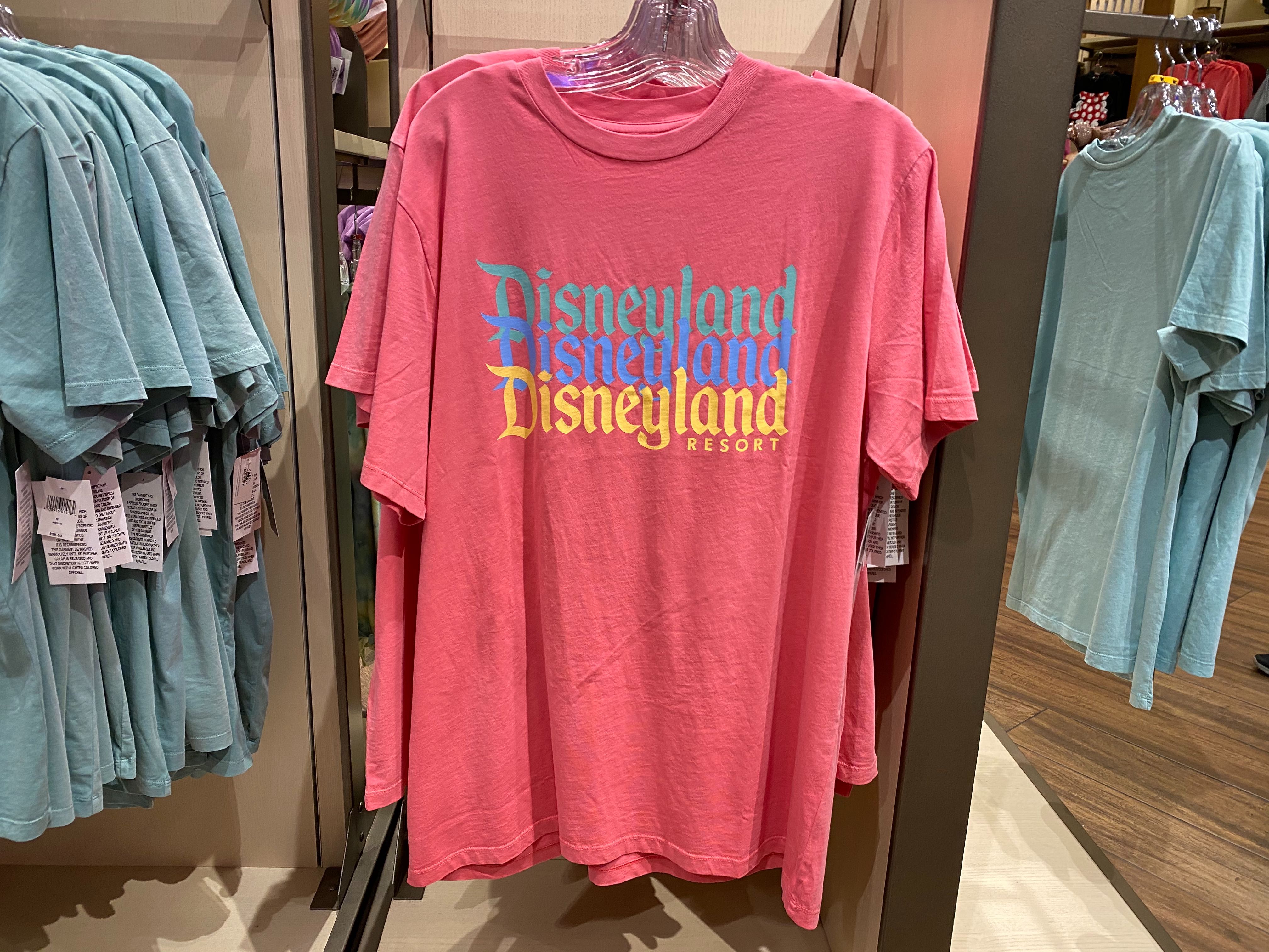 This gray-green t-shirt features the Disneyland Resort logo in a gradient of blue, purple, red, orange, and yellow. It’s perfect if you like rainbows without green in them!