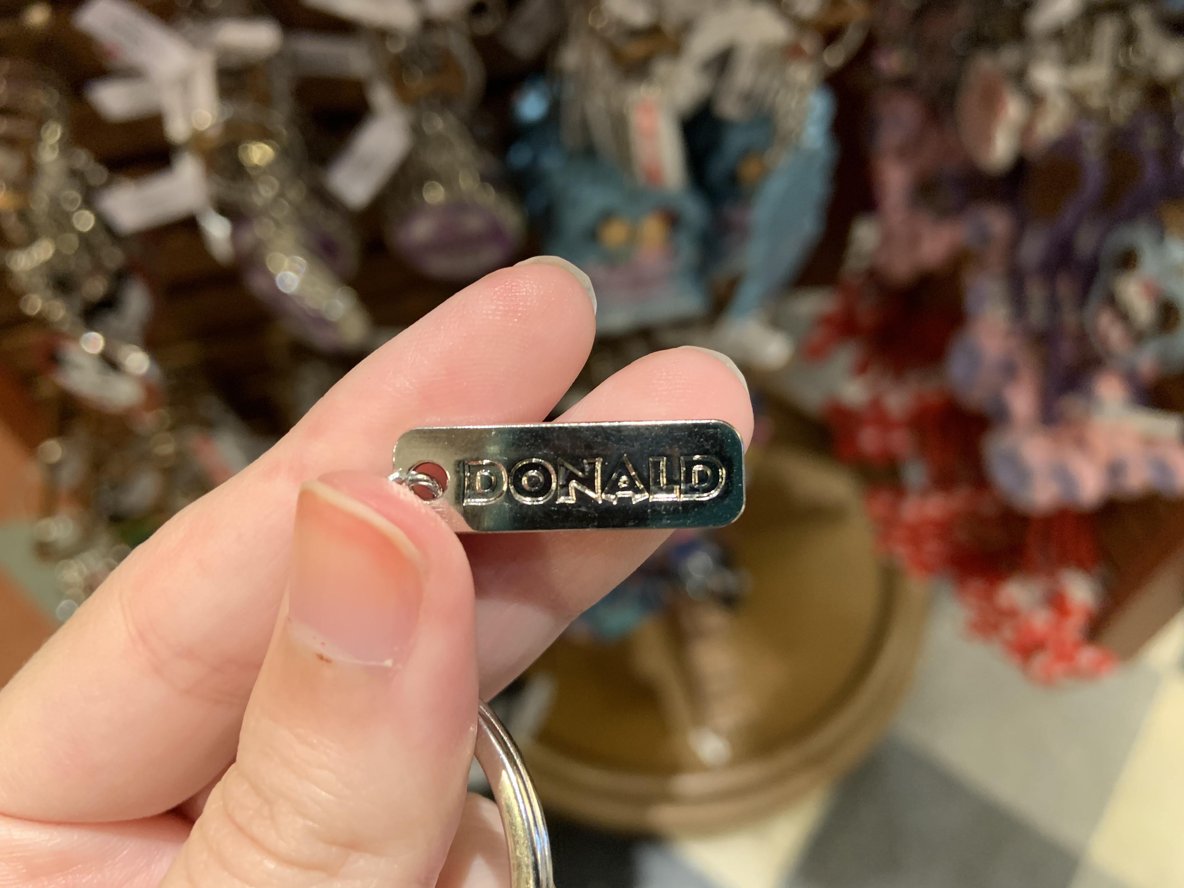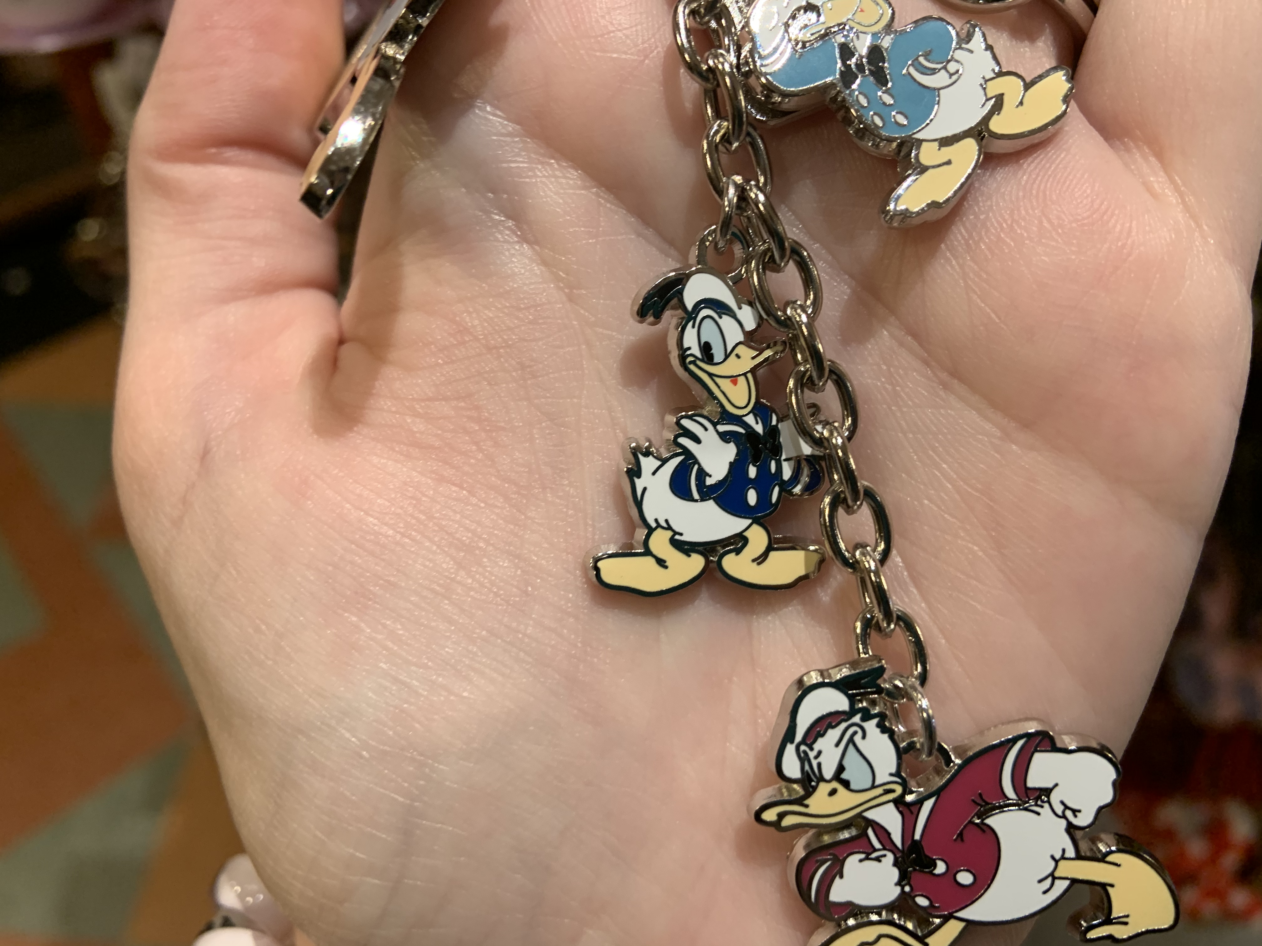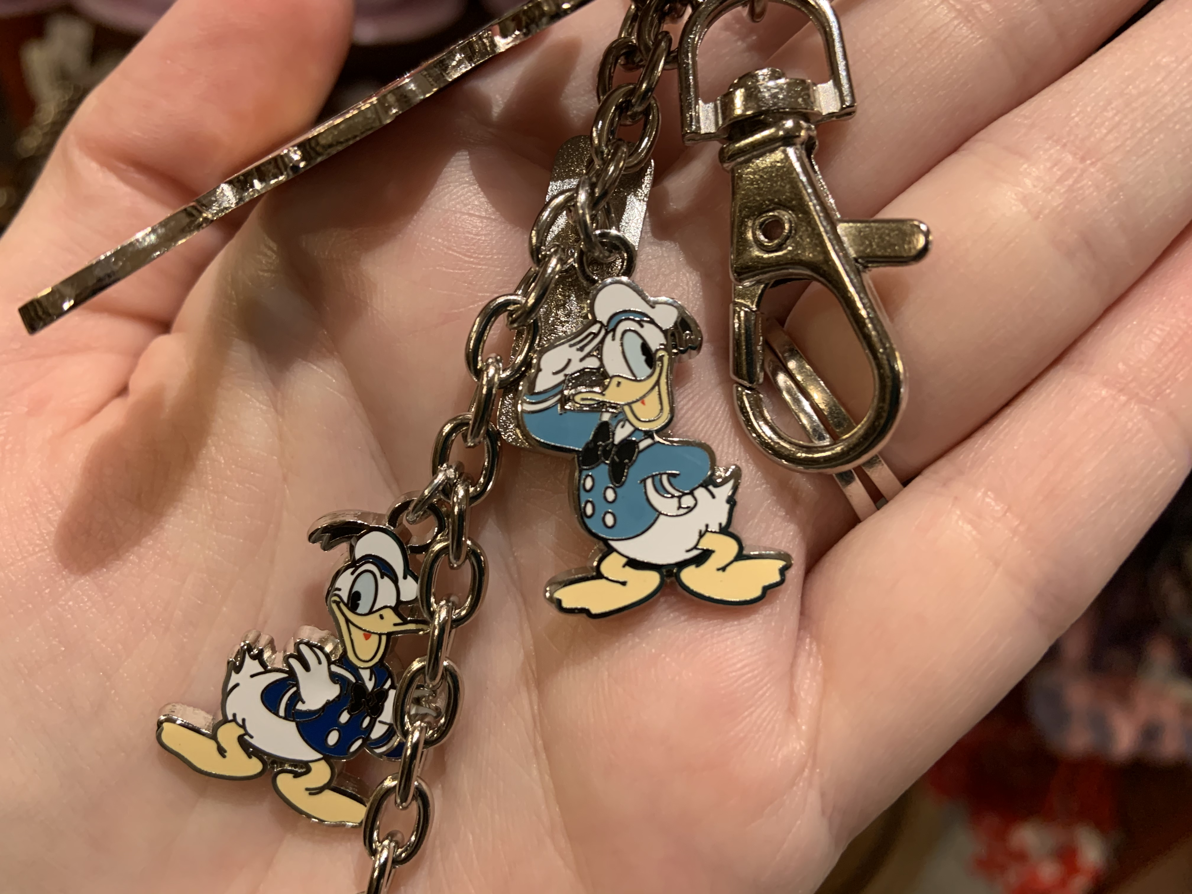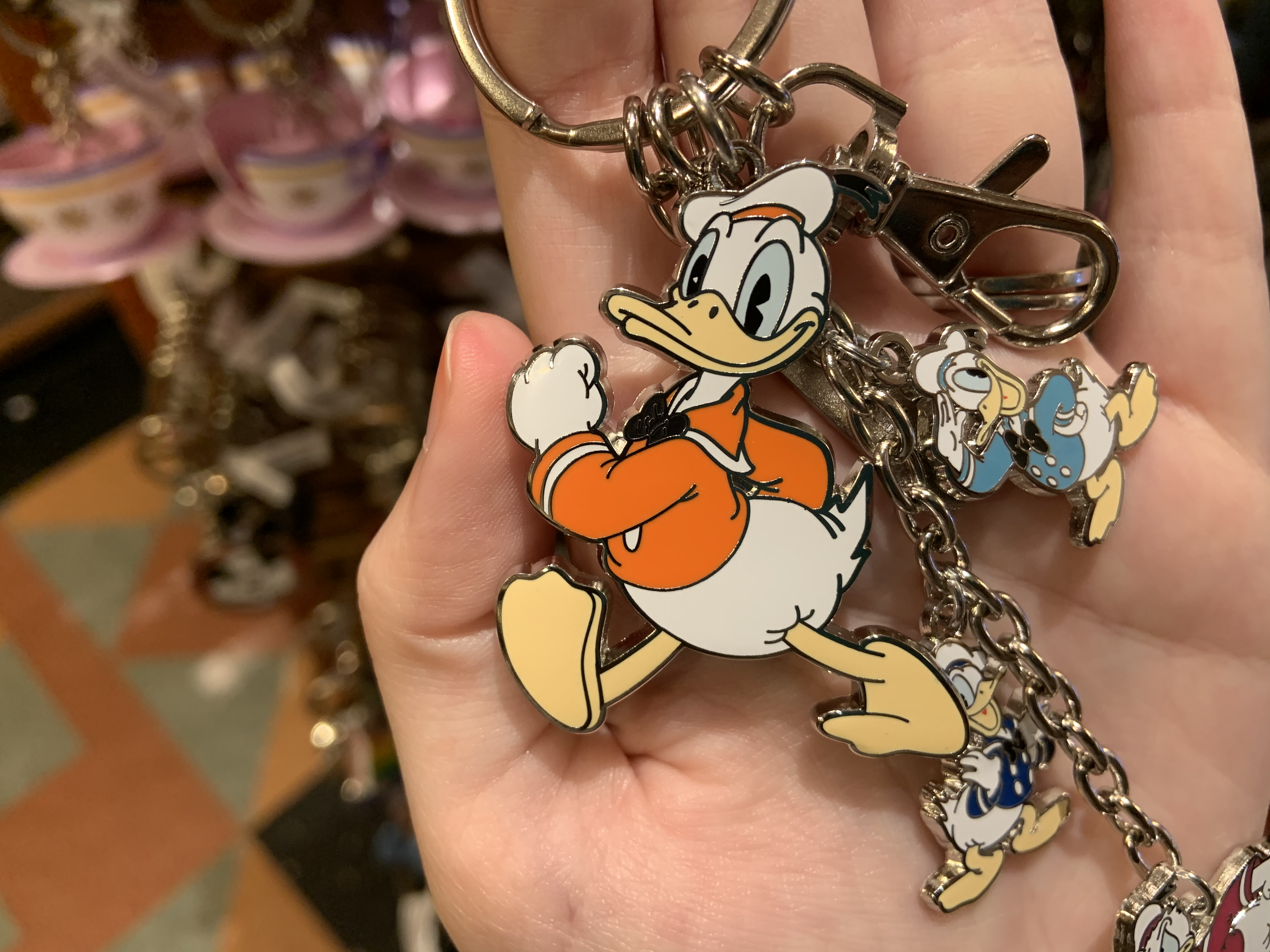 This big Donald Duck keychain charm shows a cheerful, vintage orange-clad Donald marching off to the next fun thing.