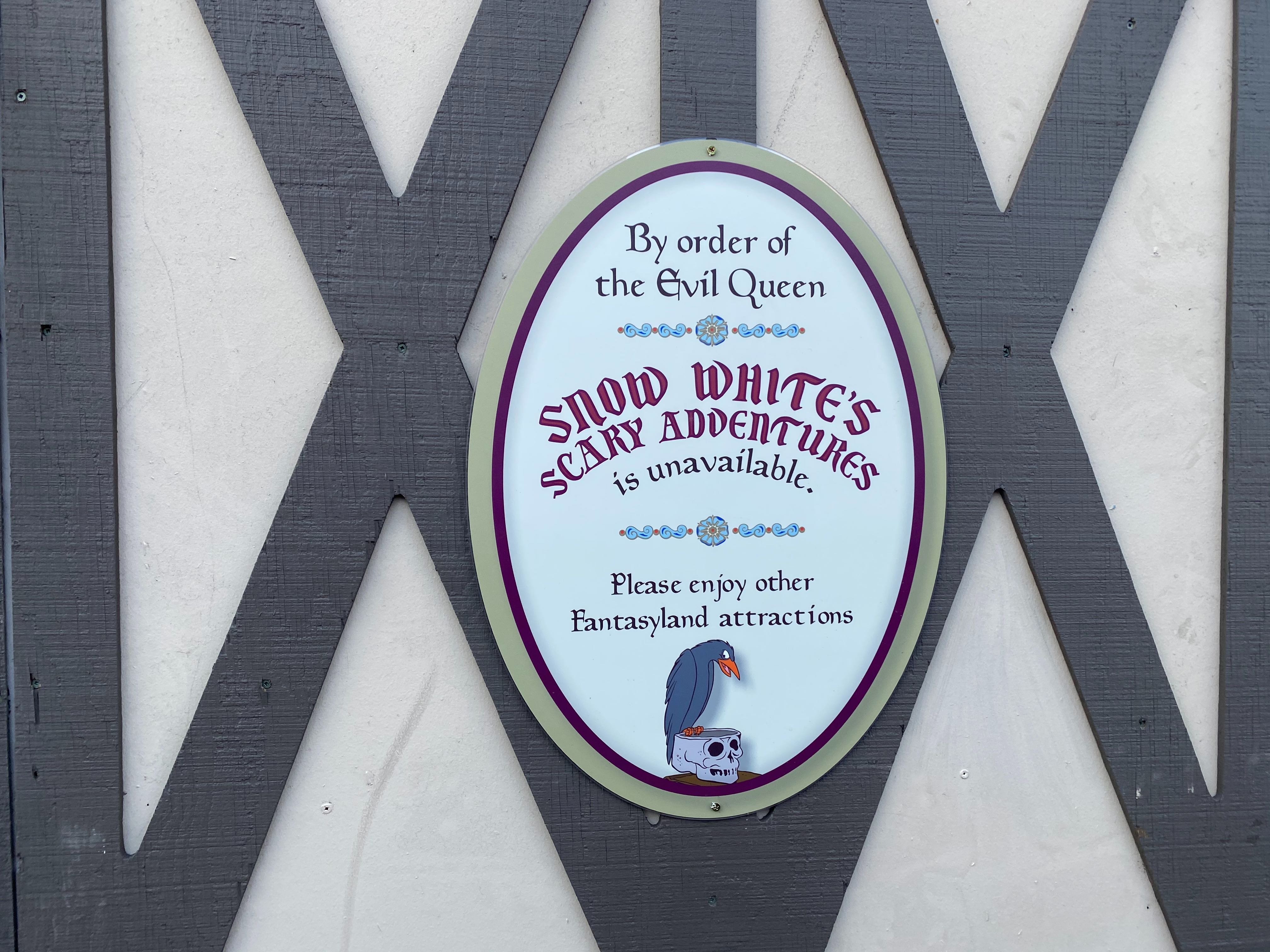 This sign can be found along the construction walls, reading, “By order of the Evil Queen, Snow White’s Scary Adventures is unavailable. Please enjoy other Fantasyland attractions.” Given that her death scene is the one rumored to be removed for the new scene, I’d say this is darn decent of her.