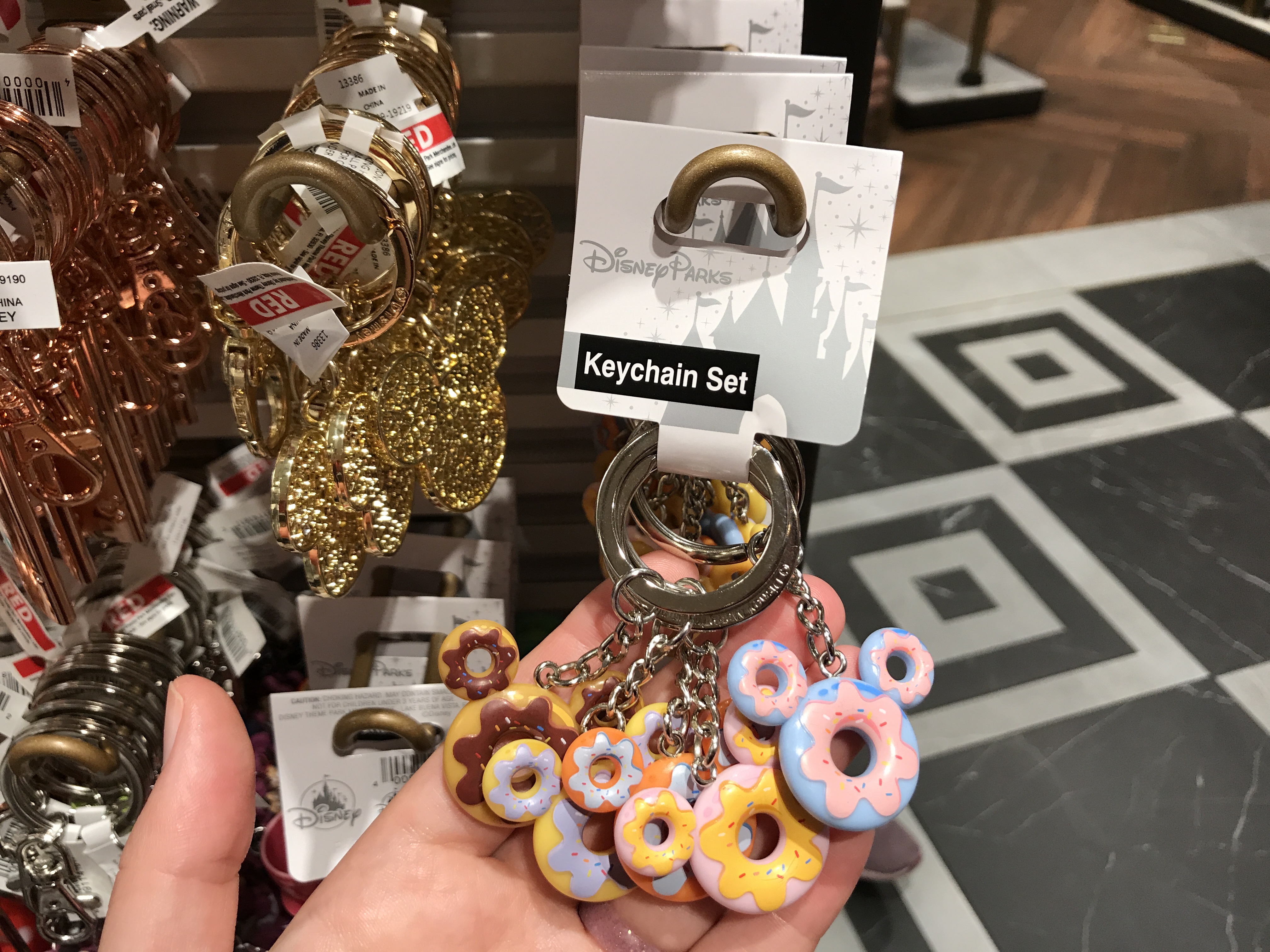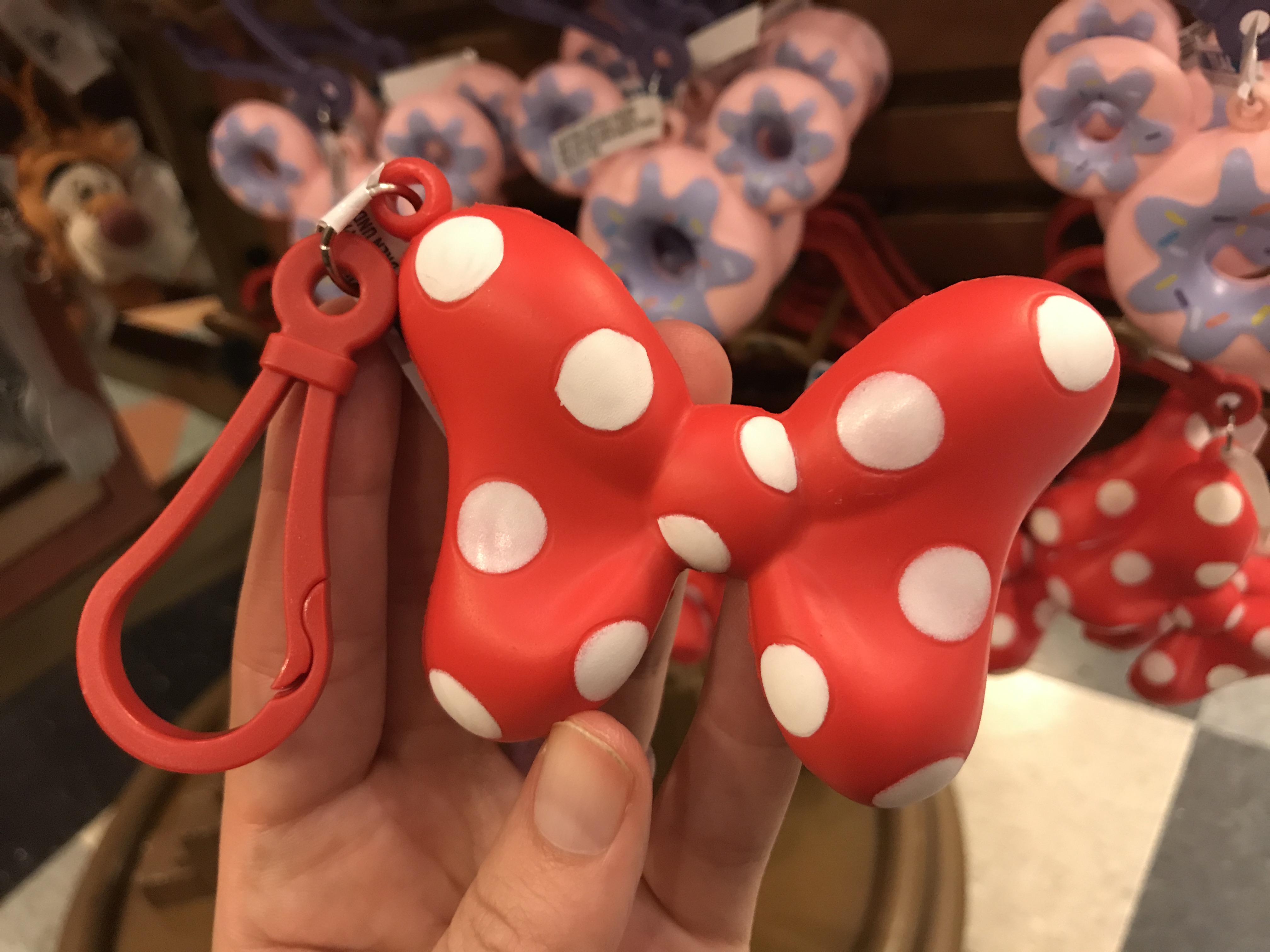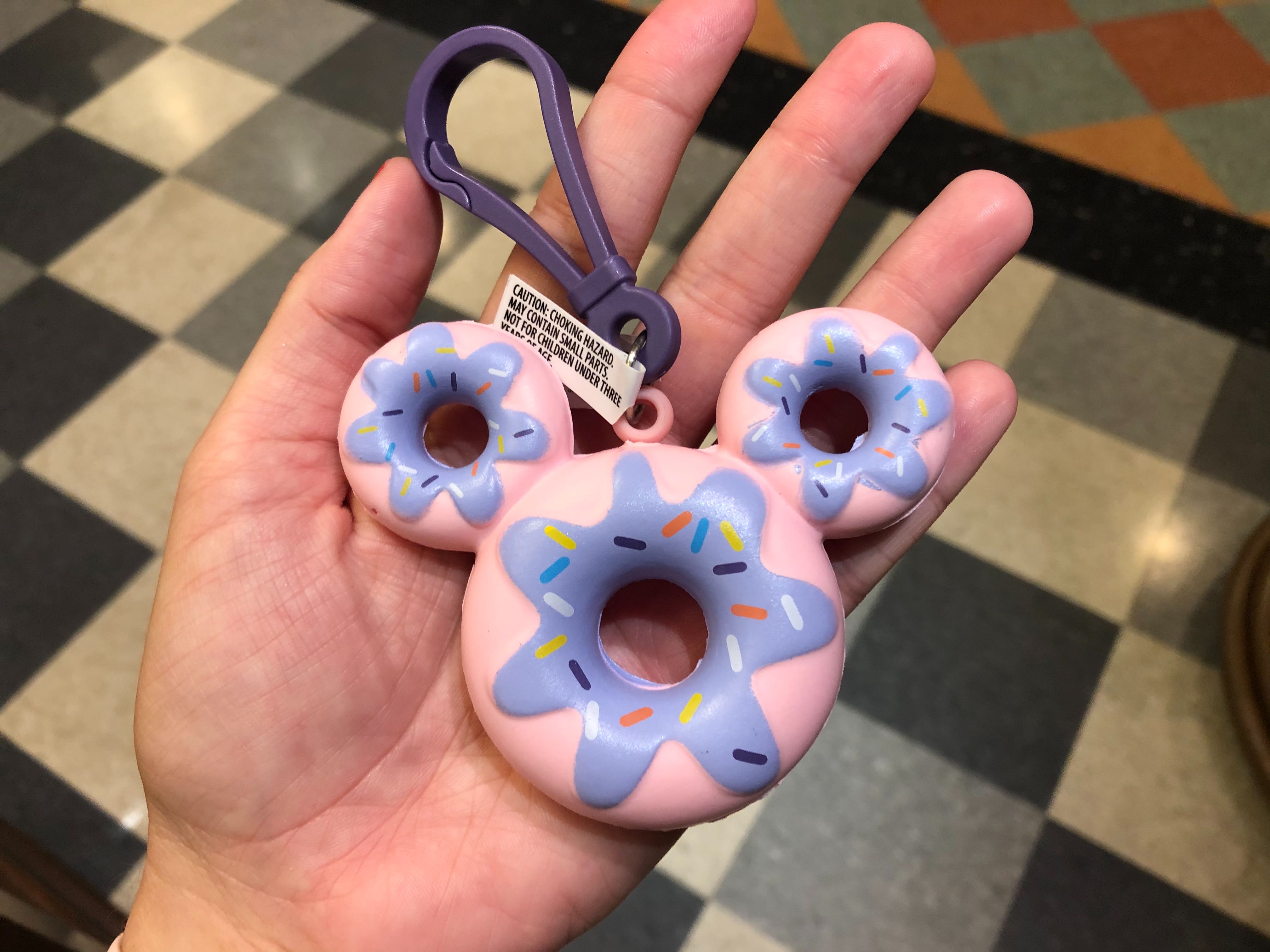 There’s a set of Mickey-shaped donut keychains that match the squishy bag clip. The donuts are made out of plastic and come in a variety of colors.