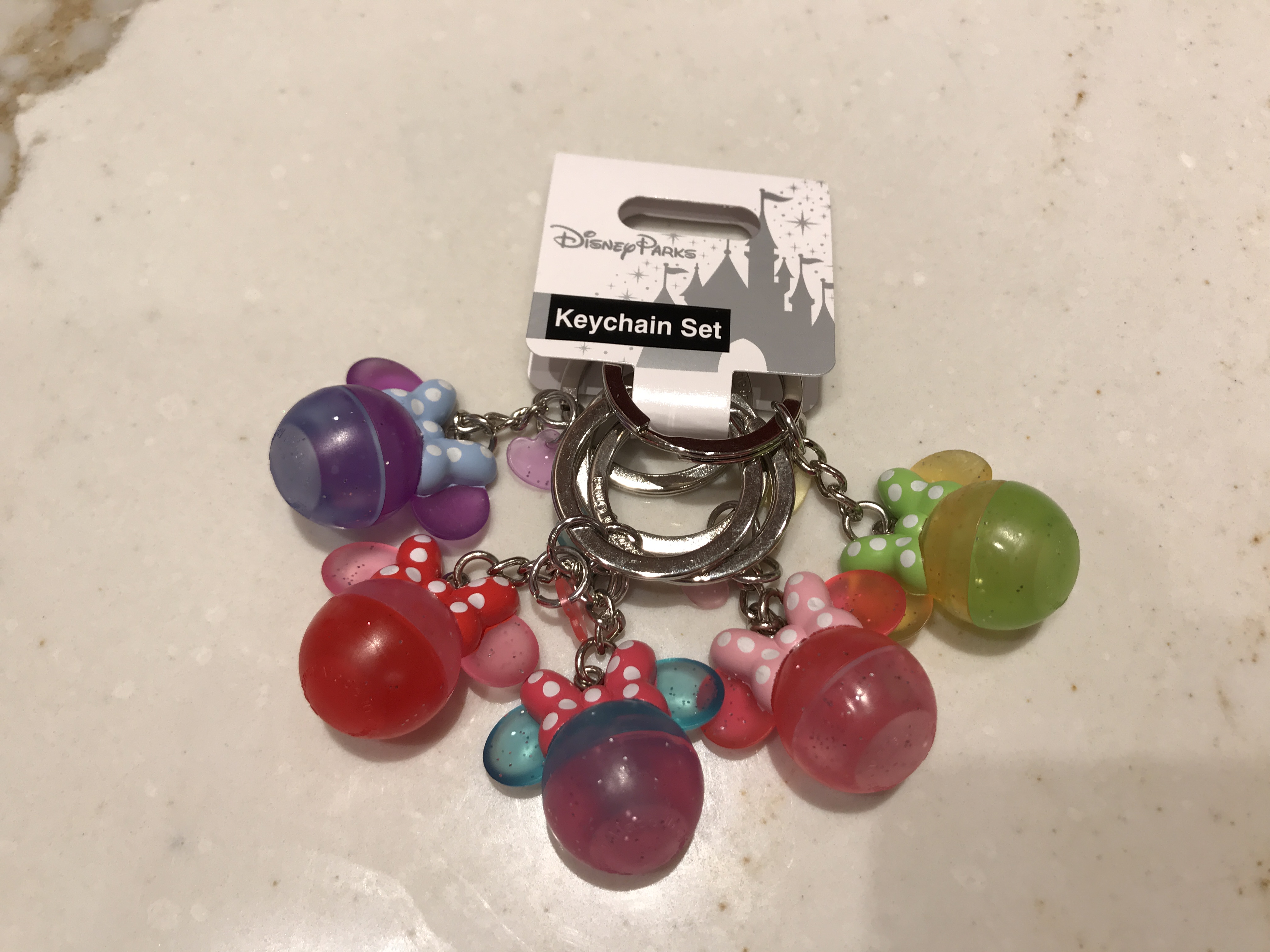 The final keychain set has Minnie-shaped bobbles. Each Minnie is a different color of glittery plastic and topped with a polka dot bow.