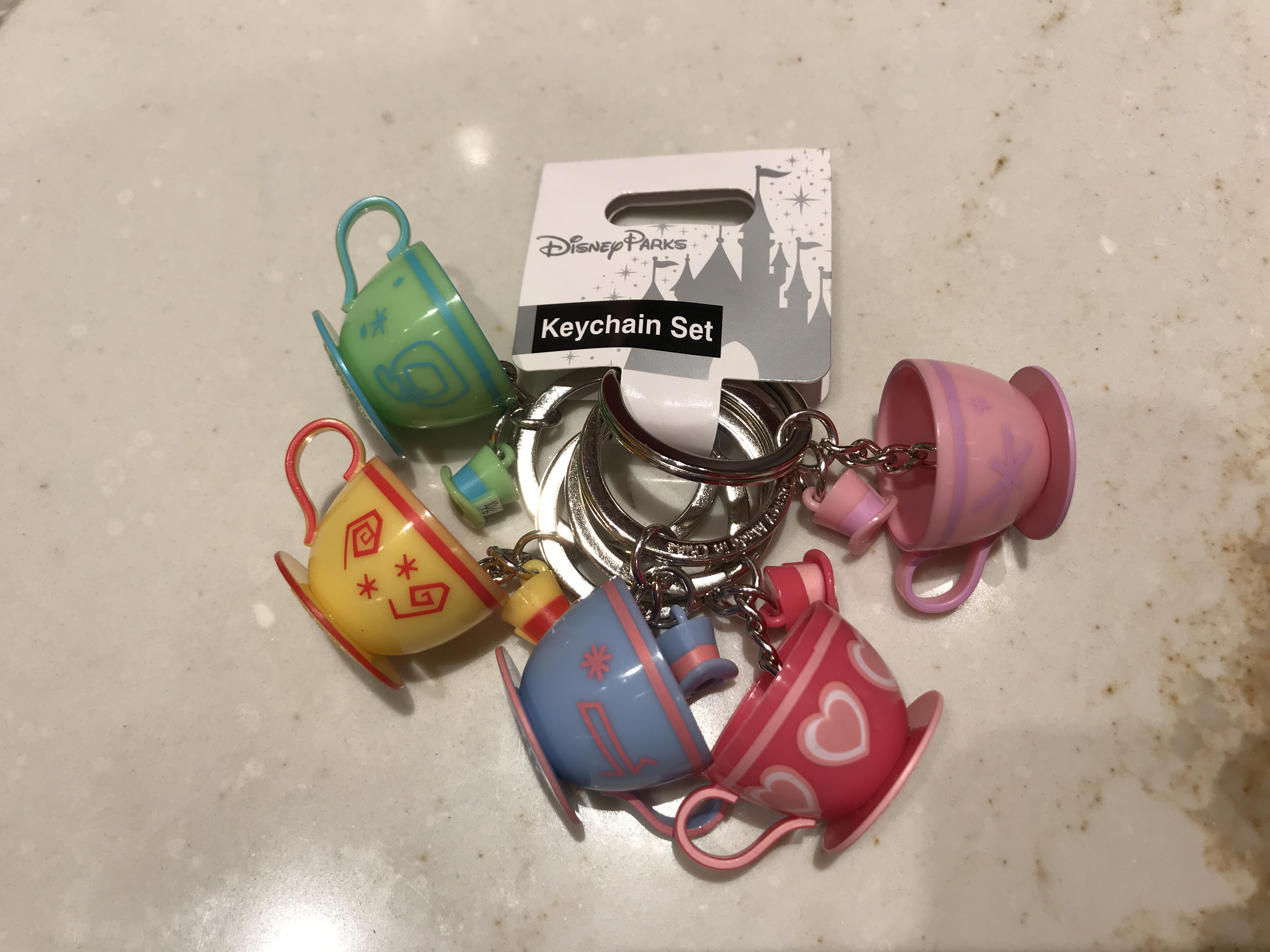 With the next keychain set, you have enough teacups to make a tea party! Each keychain has a plastic teacup modeled after the iconic Mad Tea Party attraction and a small Mad Hatter hat in a corresponding color. The keychains come in various pastel shades.