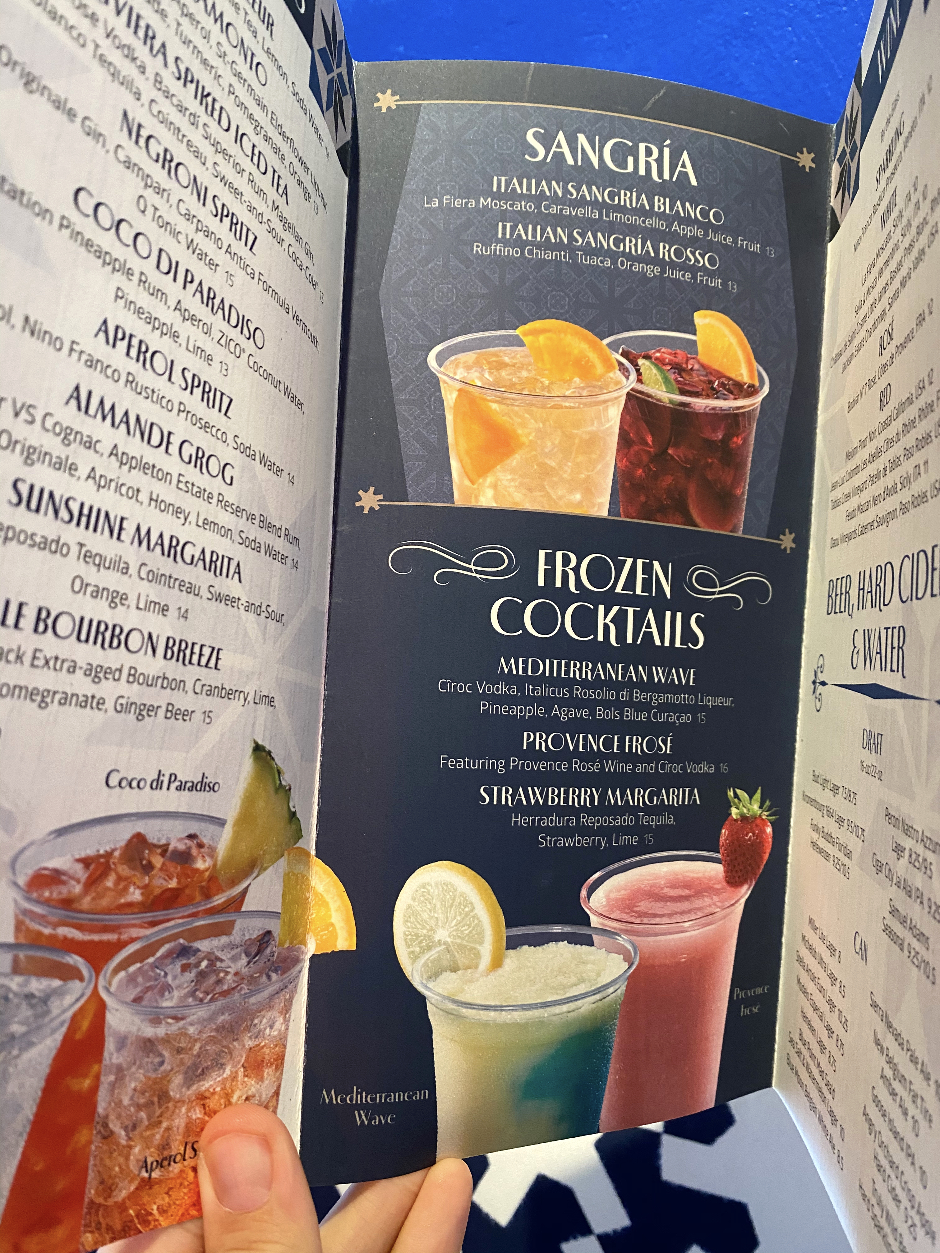 The menu features a selection of drinks that can be found at other locations within the resort like Topolino’s Terrace and Le Petit Cafe, plus some specialty frozen and iced cocktails, wines, beers, and hard ciders: