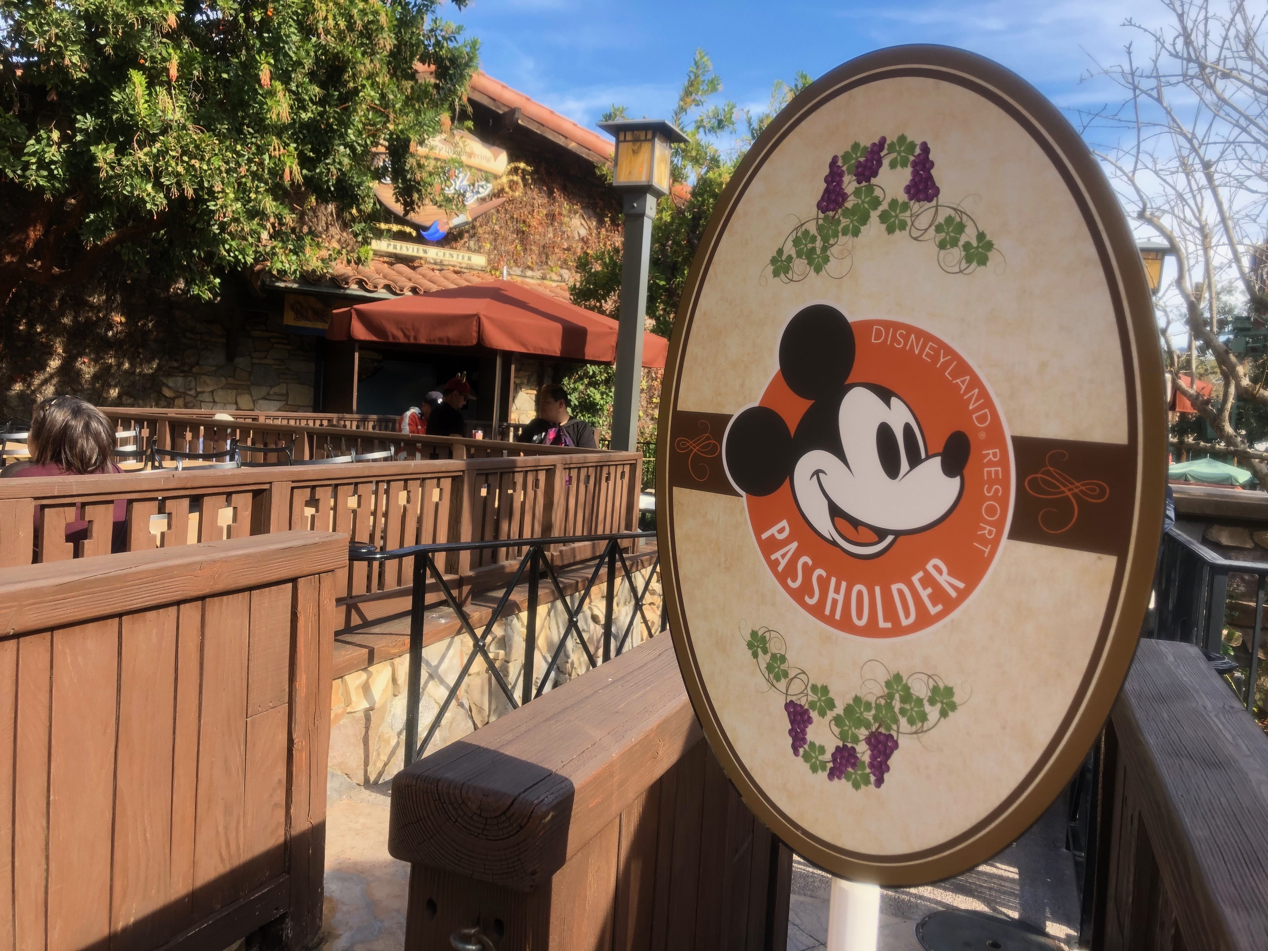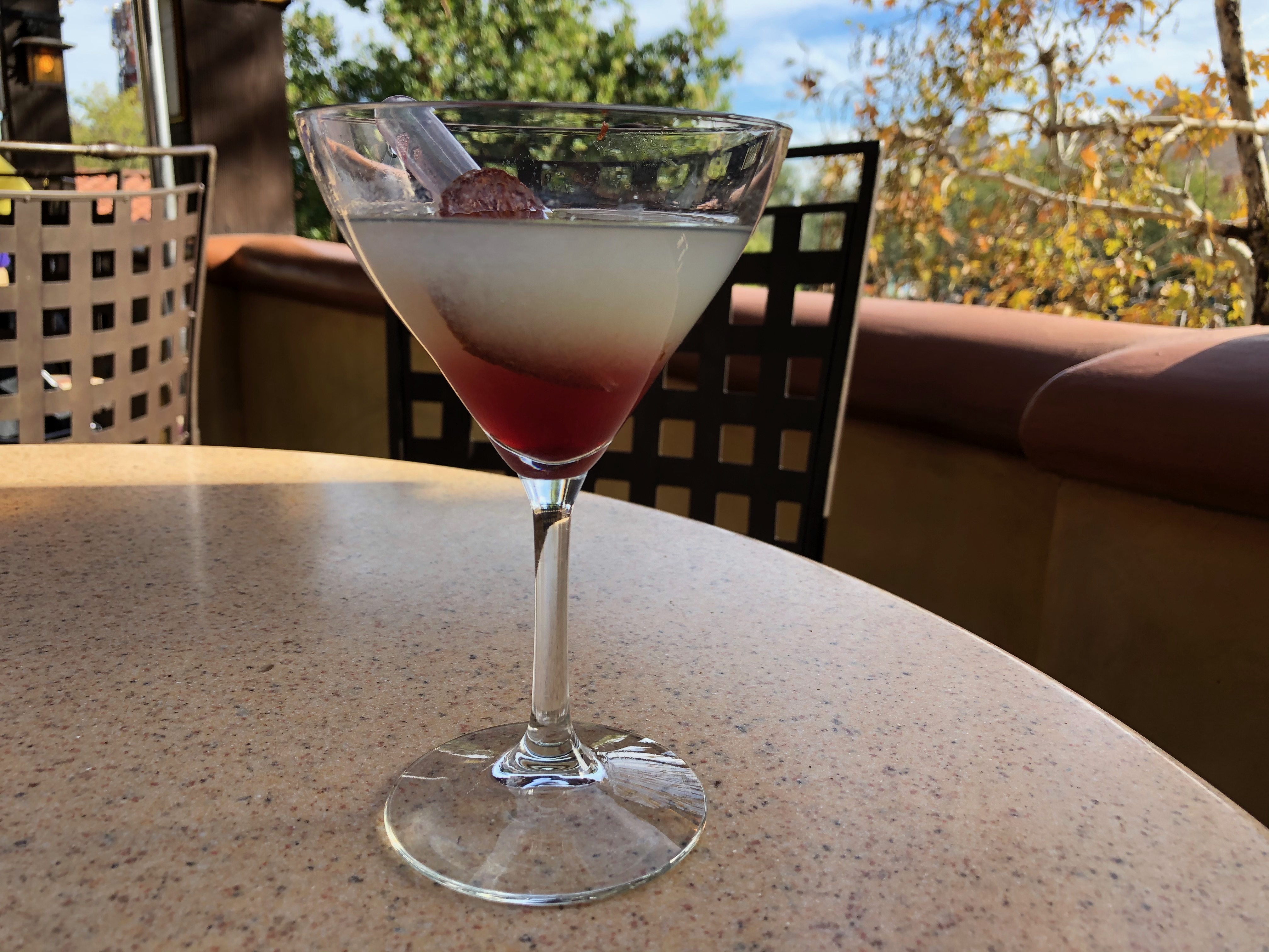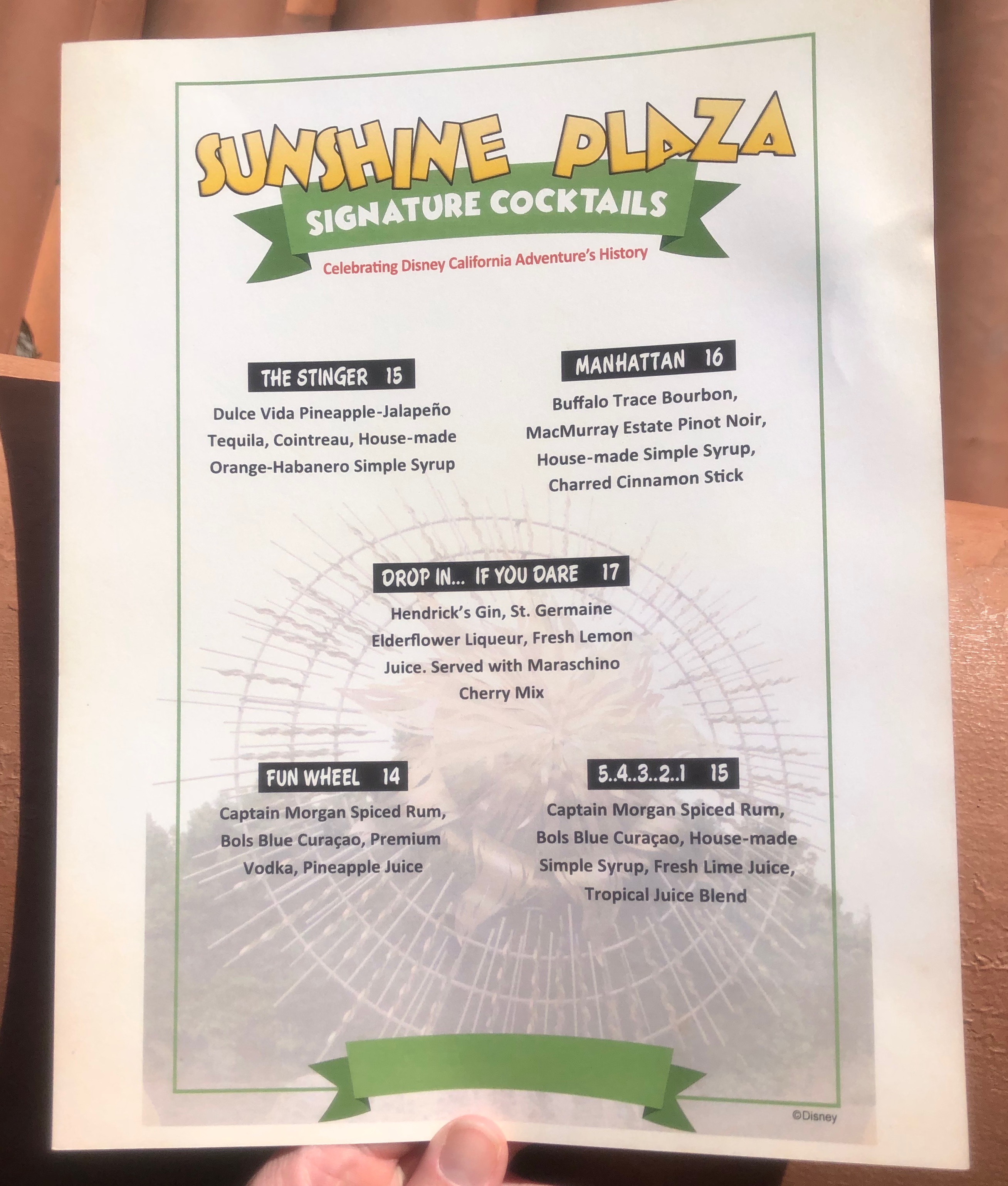 As we reported on a few days ago, the Alfresco Tasting Terrace in Disney California Adventure was switching to an Annual Passholder-only area. Even if you are not an Annual Passholder, you can still enter with a group as long as at least one member of your group has an AP. You will need to check in downstairs, and after a cast member checks your AP, your name will be placed on a list and your party will be directed to a holding area. We waited about an hour at 11:45 AM on a Tuesday. In honor of Disney California Adventure, each cocktail is inspired by the history of the park. Let’s take a closer look at these six new cocktails.
