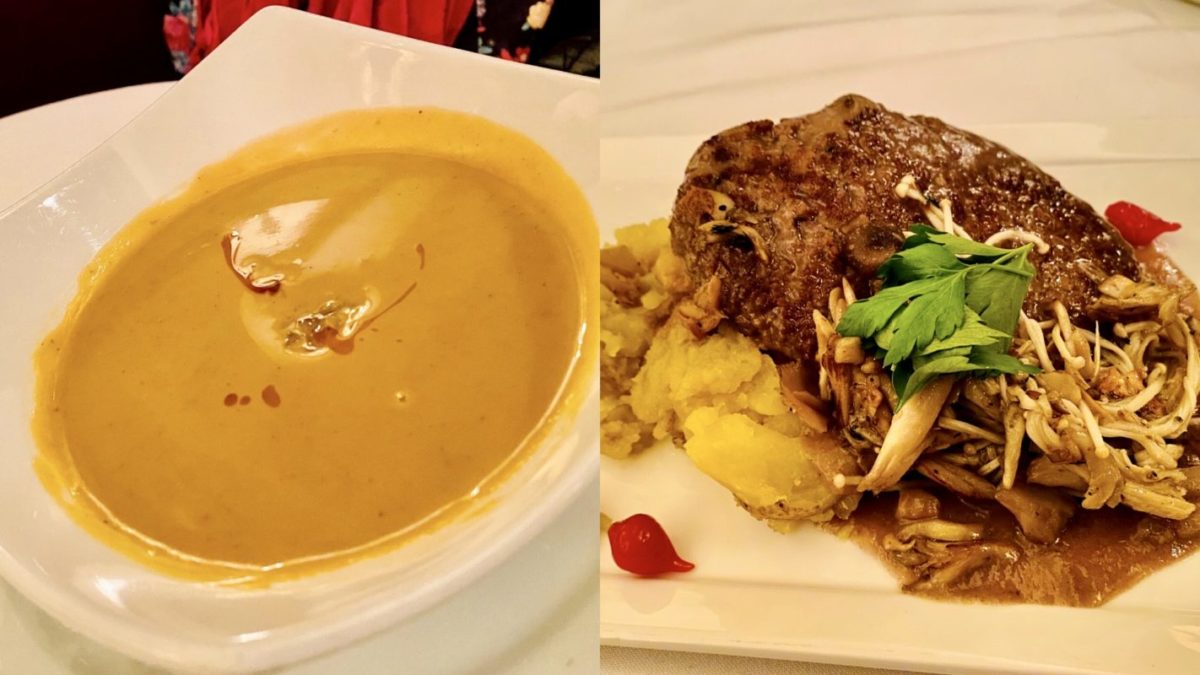 The restaurant’s winter menu features the usual classics like the Cobb Salad, as well as recent additions like the Heirloom Tomato and Buffalo Mozzarella Salad. The new seasonal soup is a vegan, plant-based Curried Butternut Squash Soup, which could not be more of a contrast from the prior menu’s soup, which was a Cream of Brie cheese soup. Over on the entrees, you have the usual filet, chicken, and fish dishes, but we noticed a new Plant-Based Chopped Steak, which piqued our interest.