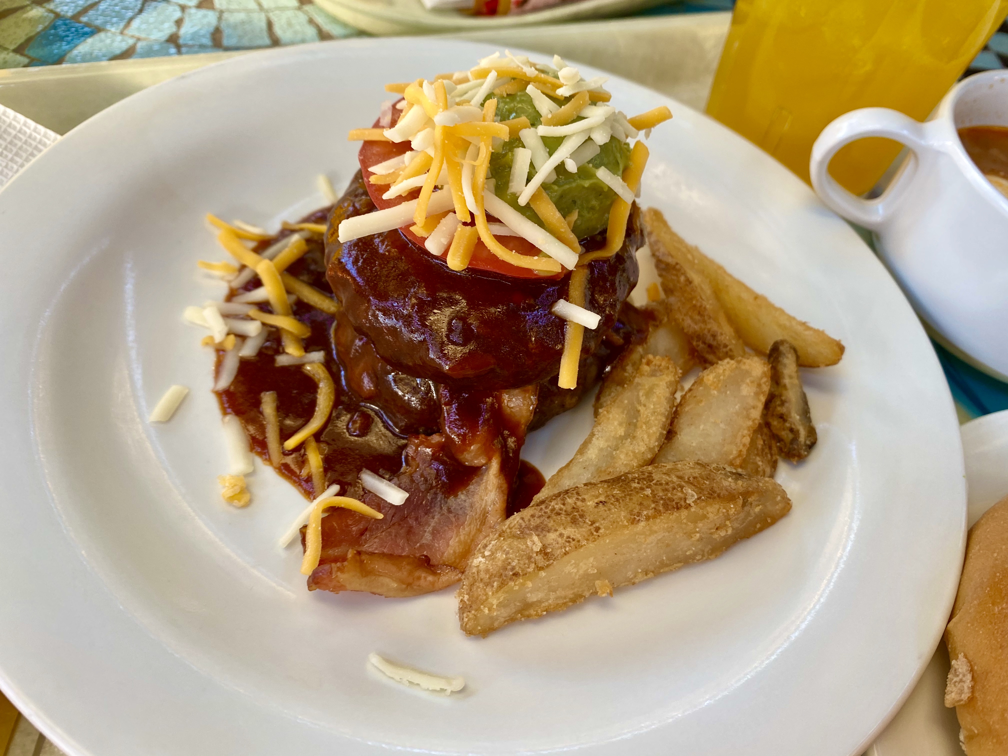 How do you put American food and Tex-Mex on the same plate? Throw some guac and bacon on, of course! This was actually quite interesting. I couldn’t quite put my finger on the sauce but it had a bit of tang to it, and I loved the way it mixed with the guacamole. The meat patties were a bit stiff and needed a knife to cut them, but still fairly juicy as always. Those potato fries needed a bit more salt, but were otherwise fine. Try to eat them on their own rather than mixing them with the sauce. If you’re an intrepid person (as we were not), you can also take your bread roll and throw these between two halves to create a burger. Seriously, it’s actually encouraged! This was certainly a unique twist on the normal concept of meat patty at TDR, and I enjoyed the results.