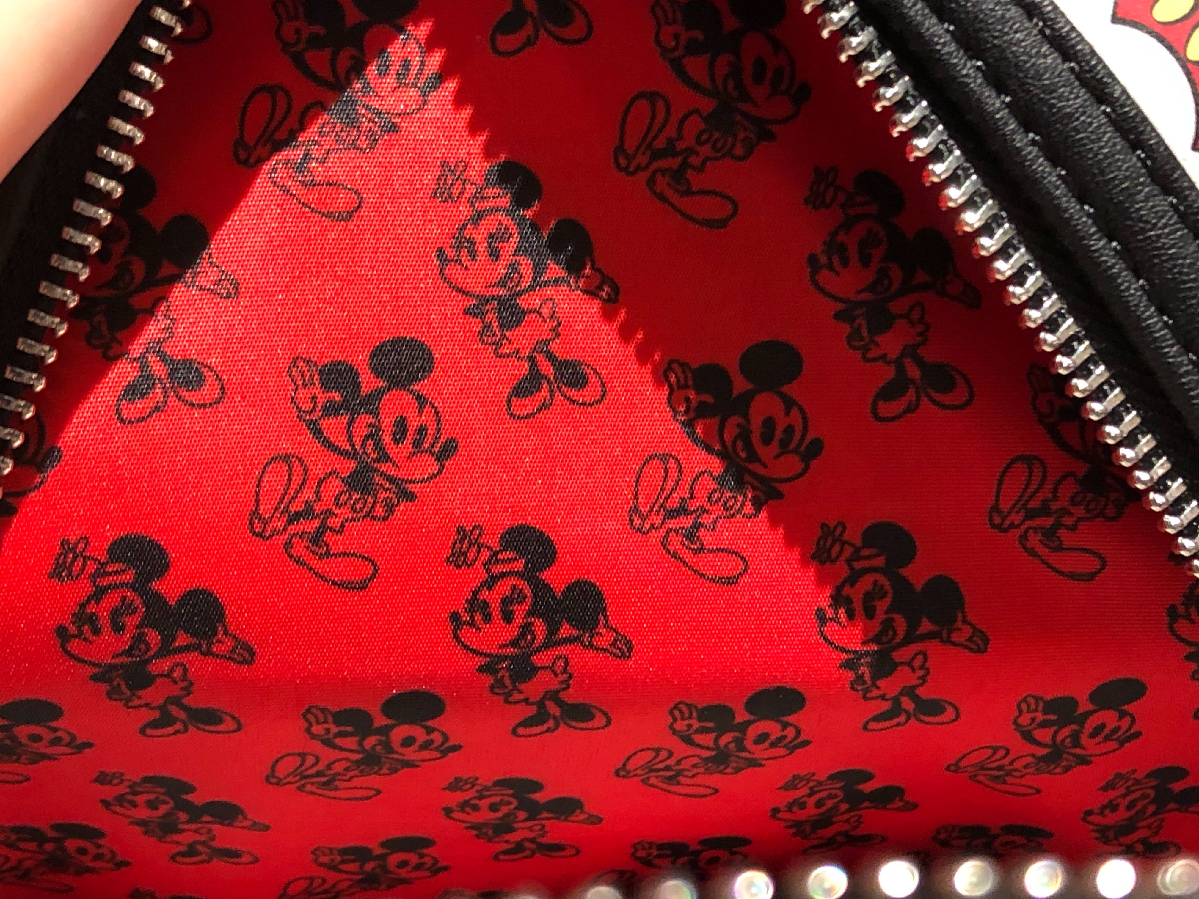 The wallet features oversized headshots of Mickey and Minnie on either side of the wallet. Inside the pattern is the same as the backpack with simple versions of the iconic mice set against a red background.
