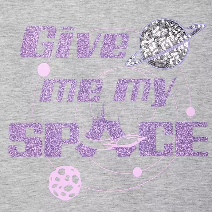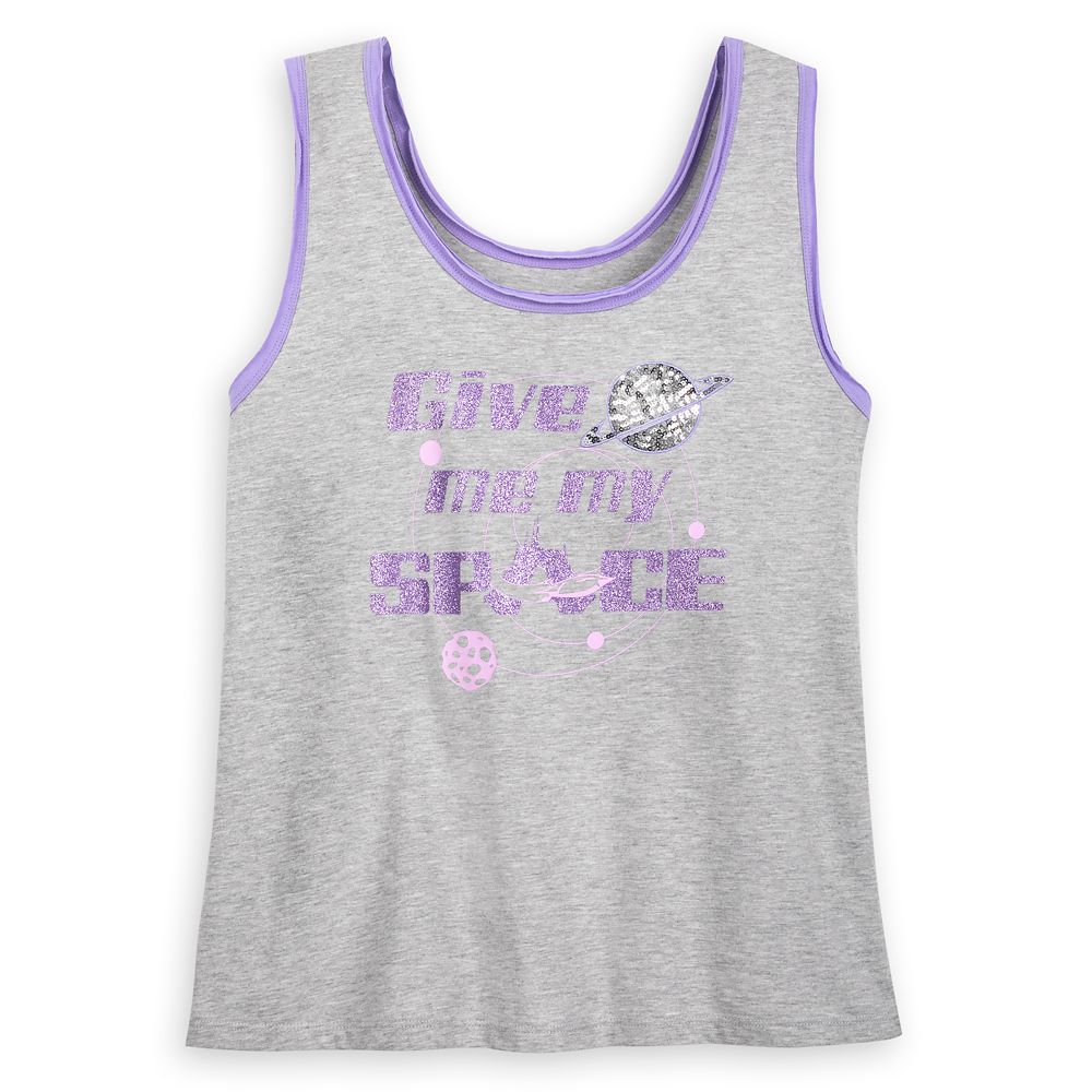 The gray tank top features the phrase “I Need My Space, in a glittery purple, with the “a” in Space taking the shape of the iconic attraction building, while a rocket and planets finish the look.