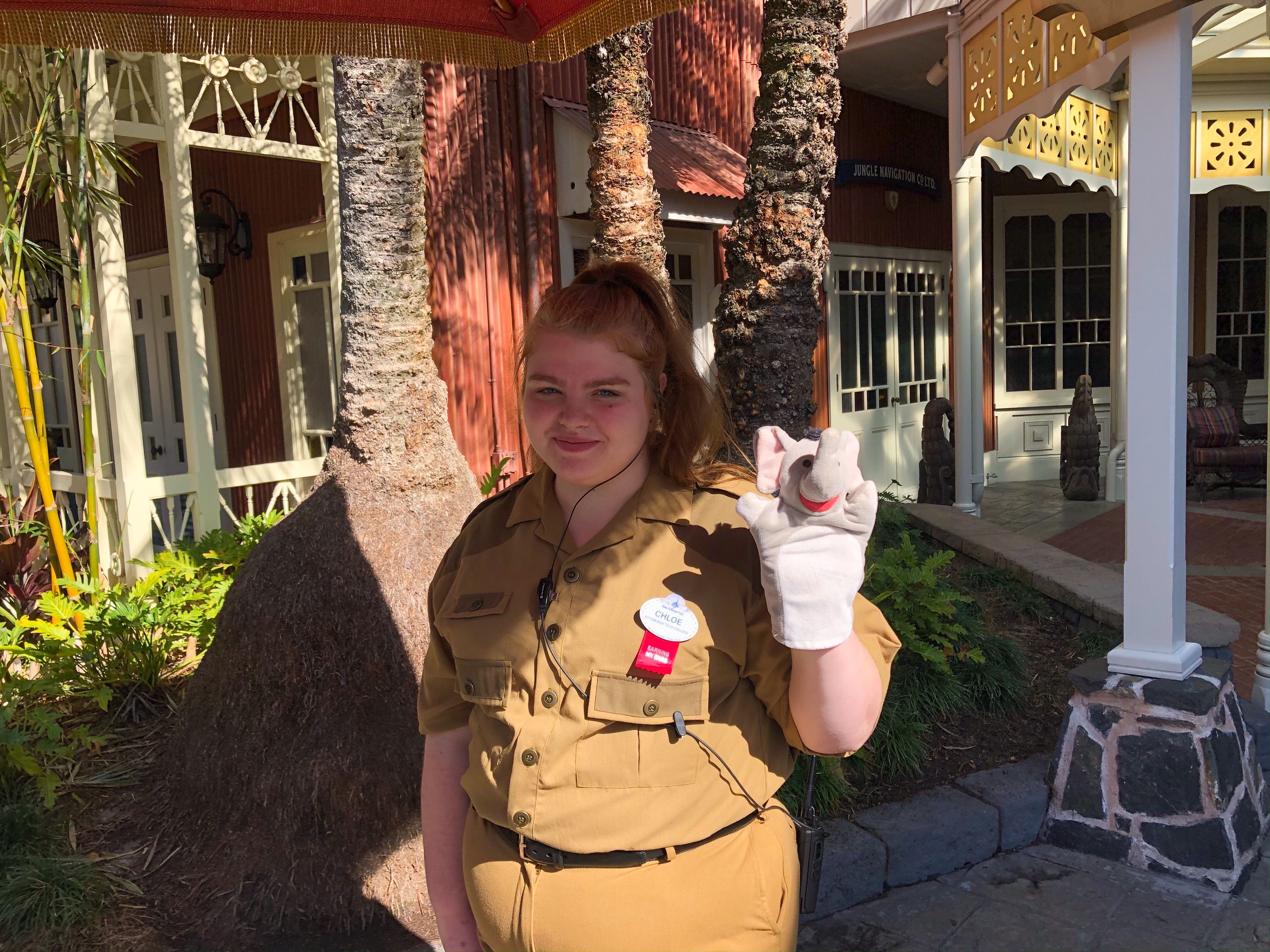 In front of Skipper Canteen, this awesome Cast Member was having fun with a tiny elephant puppet. This made our day!
