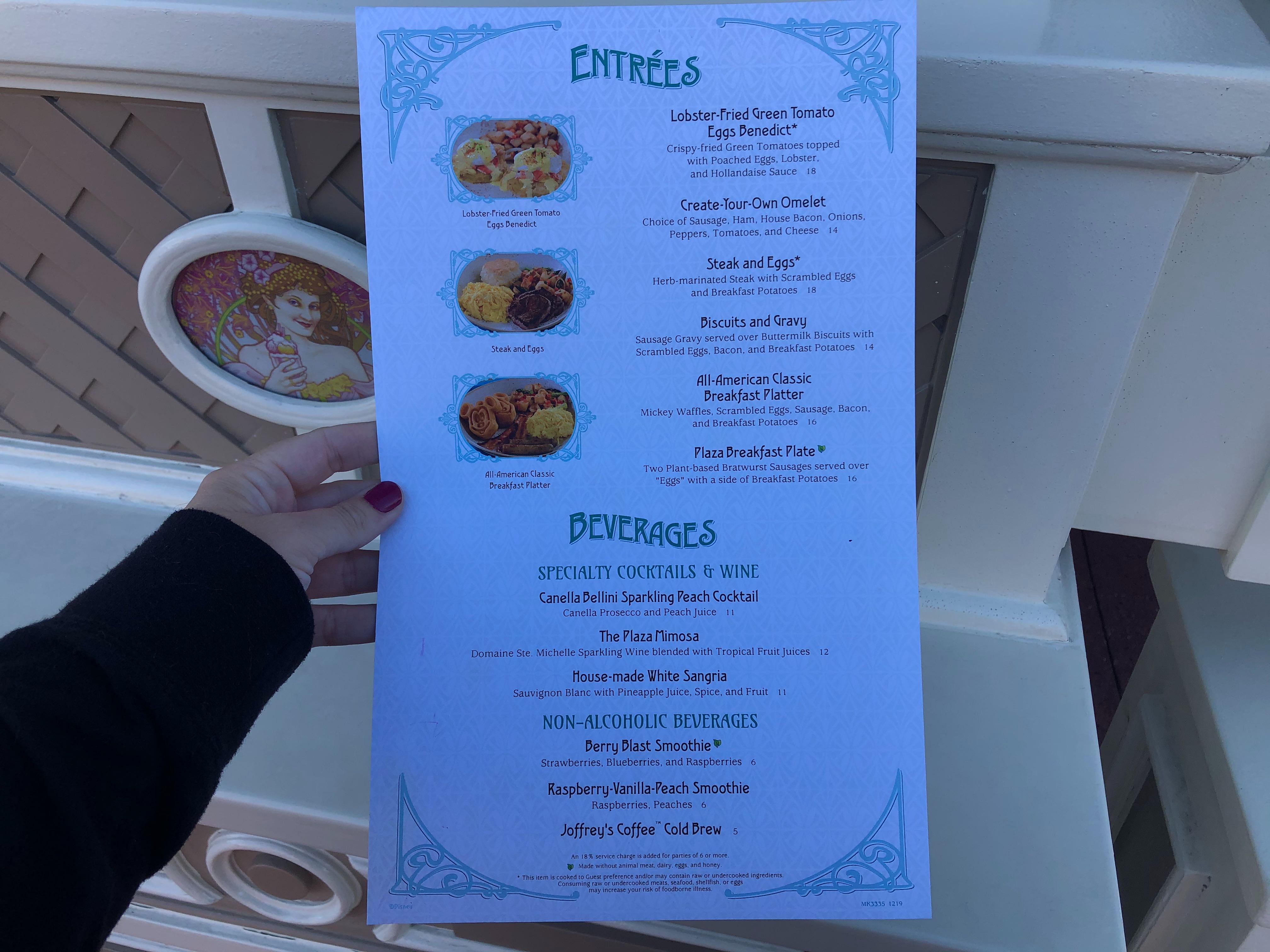 Since it’s early, we decided to stop by the Plaza and check out their breakfast menu. The menu has been updated with just a few minor changes. The Mickey Waffles meal has been removed and replaced with Biscuits and Gravy. That sounds pretty good. And Mickey waffles haven’t been completely removed and can be still found in the All-American Classic Breakfast Platter.