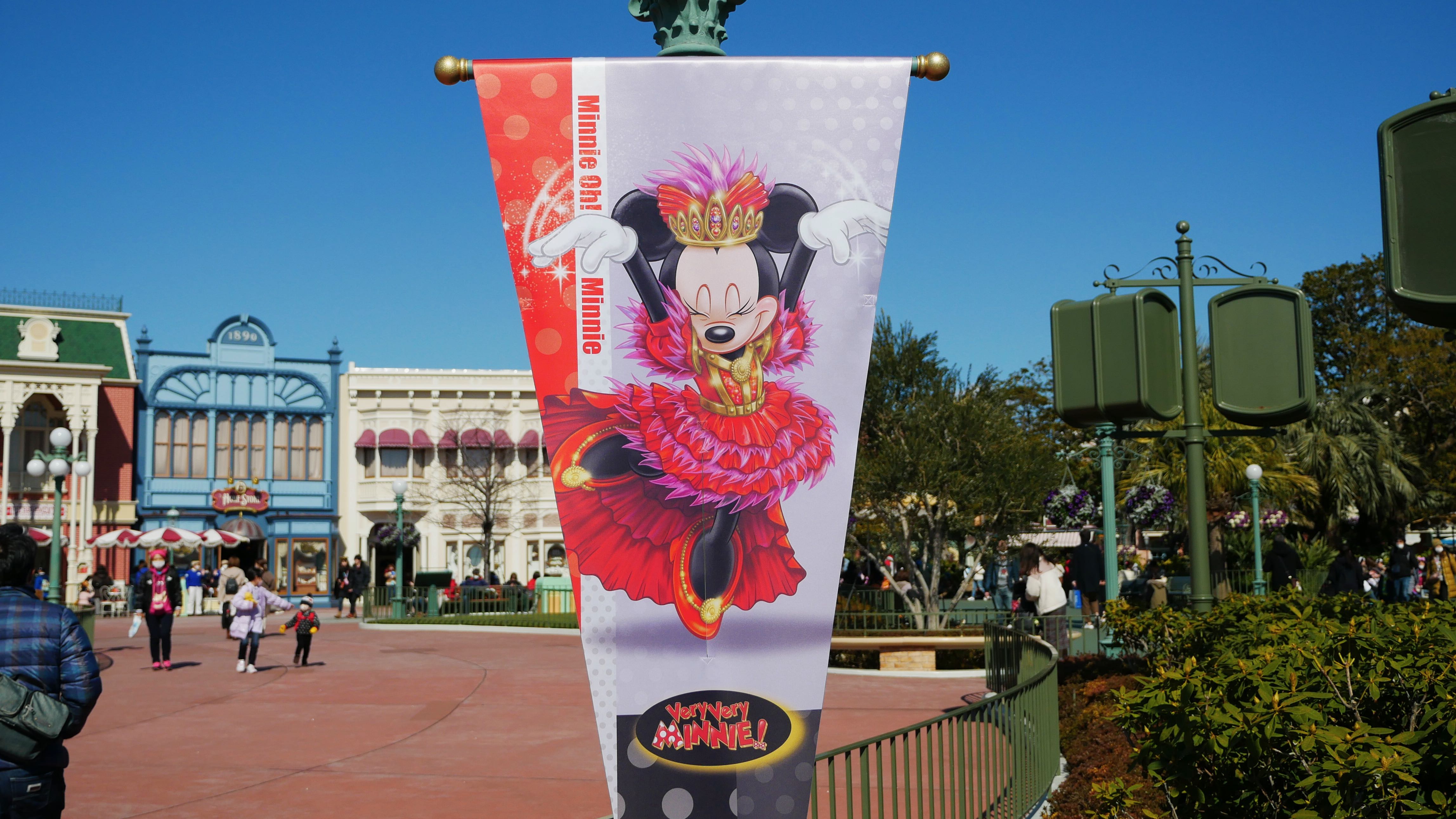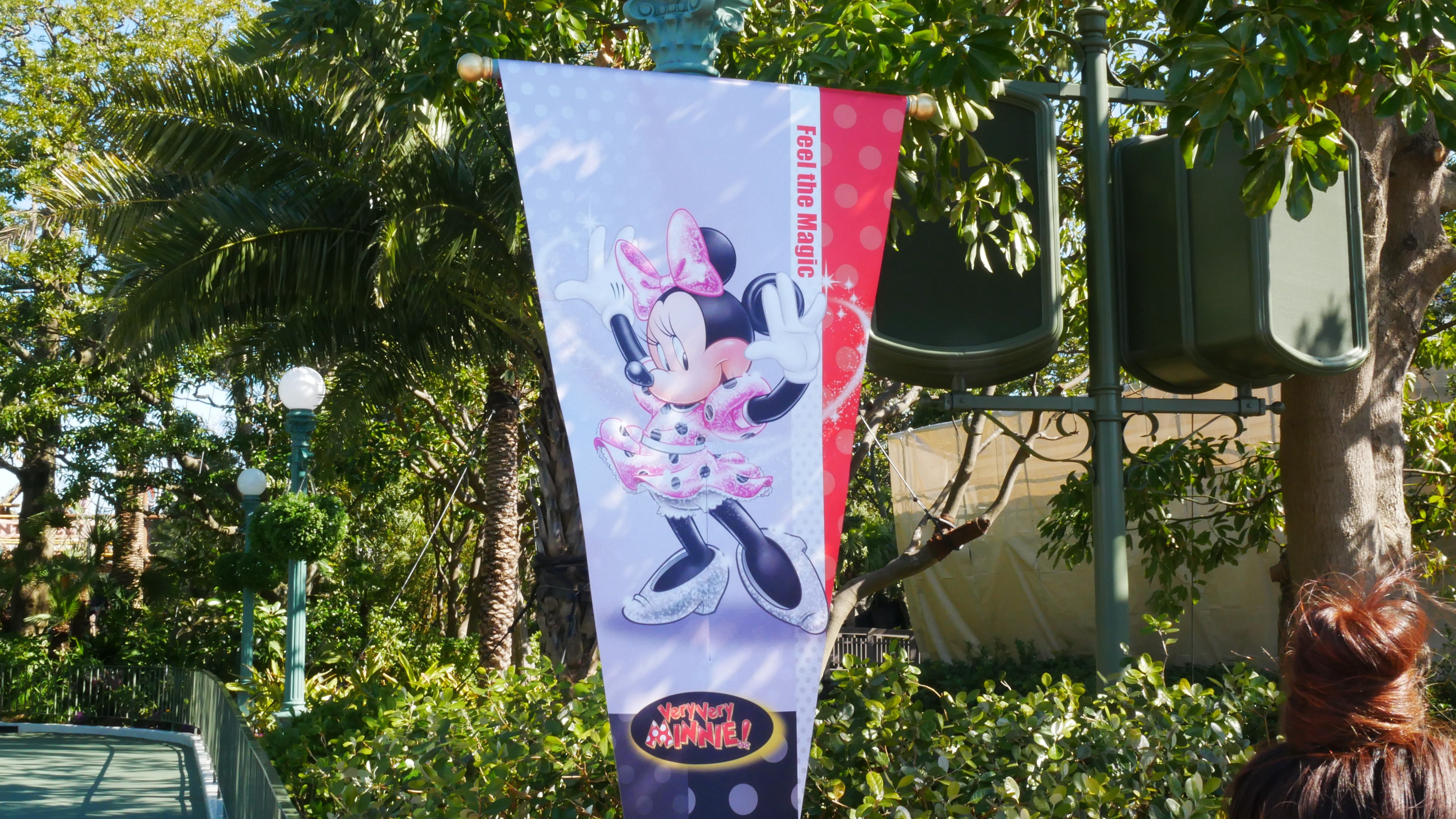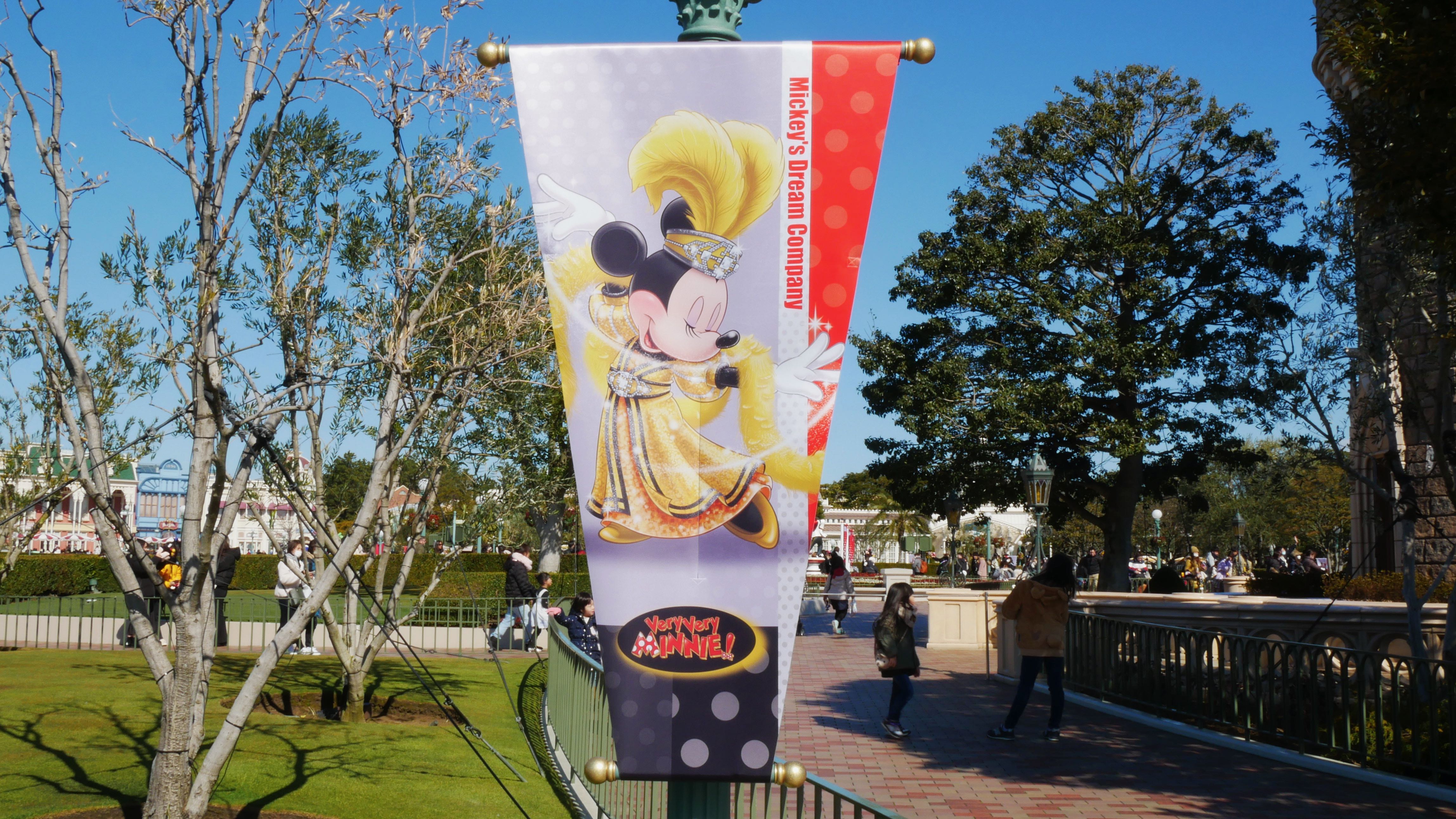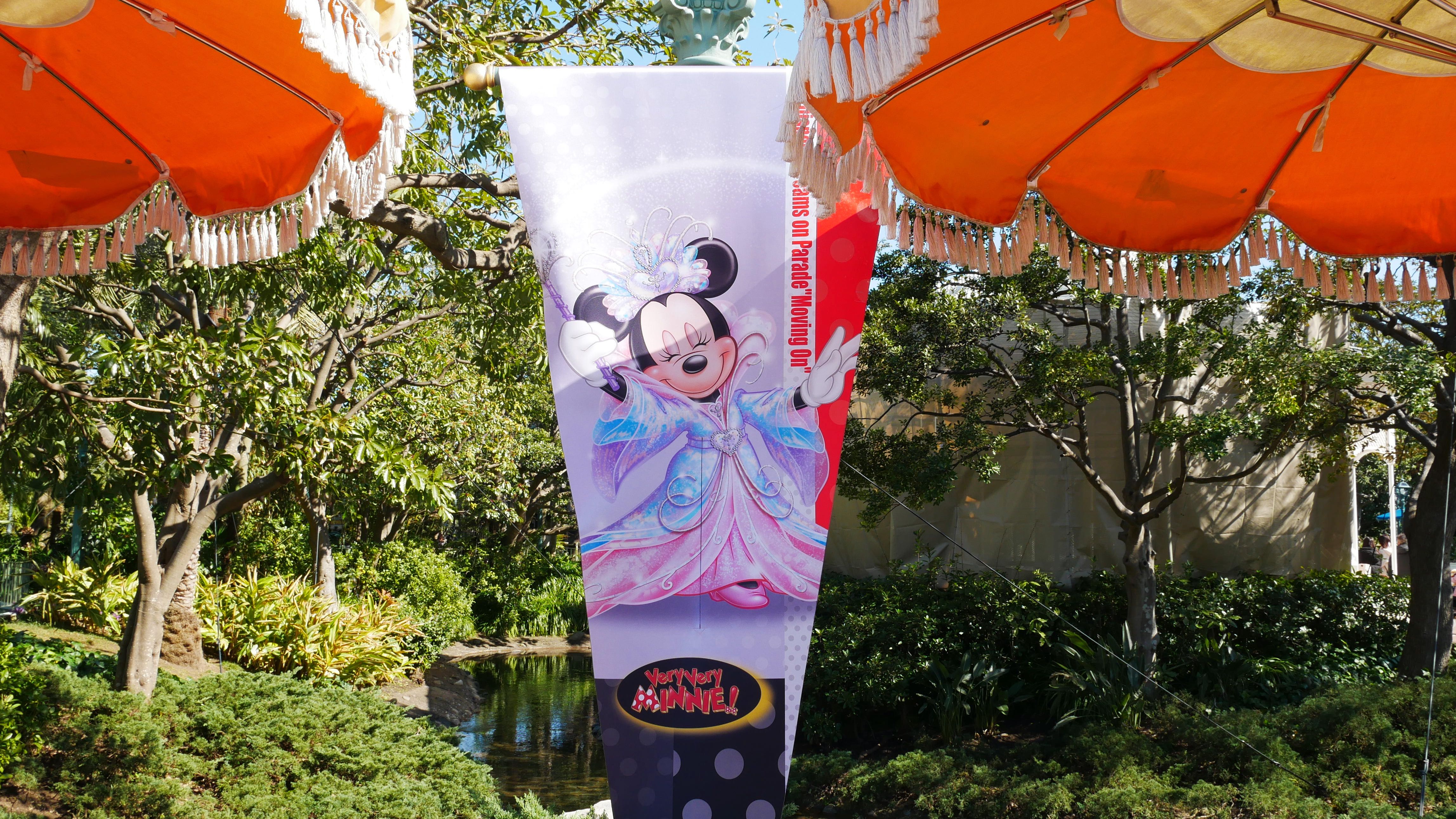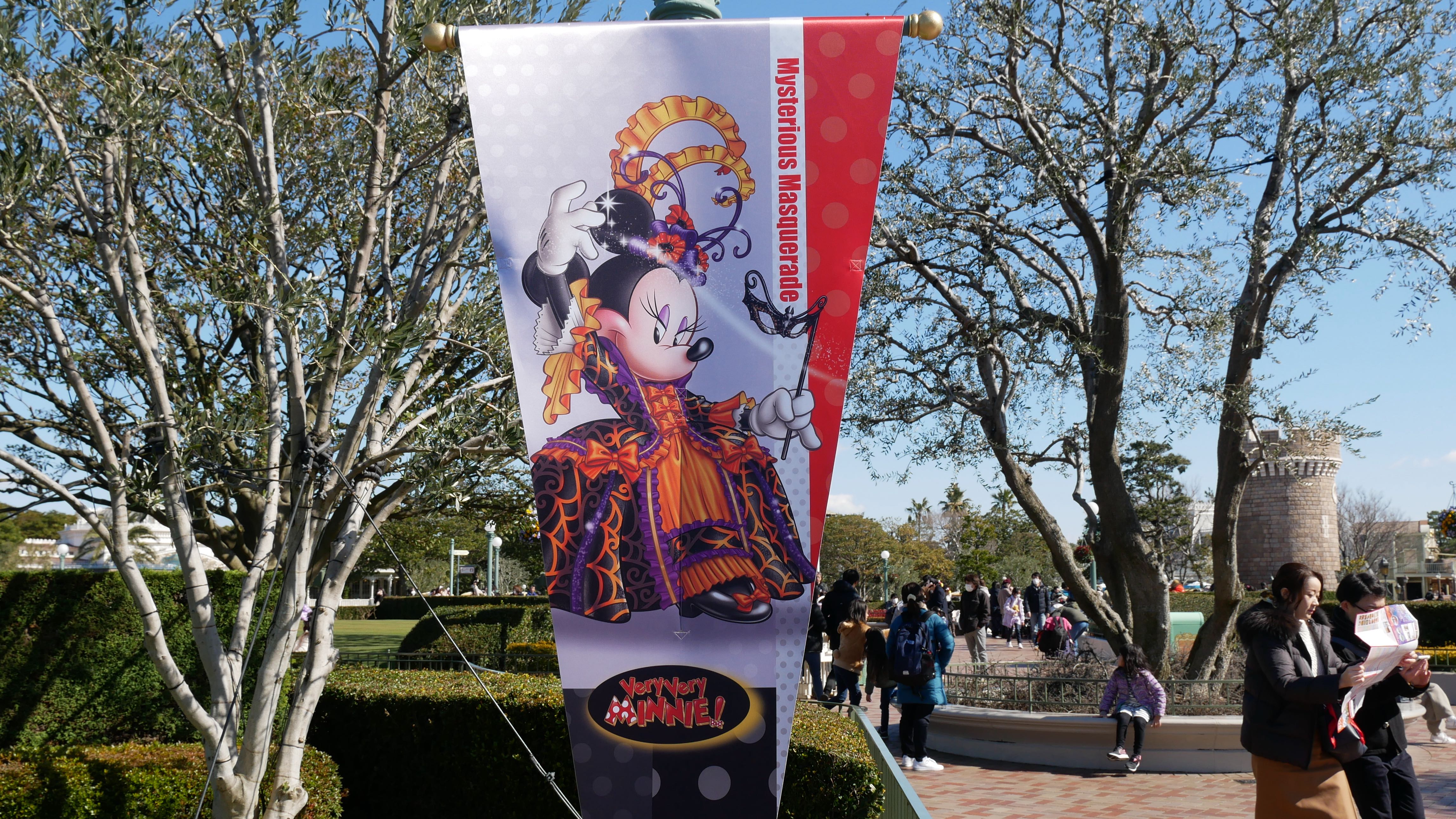 On February 3rd, the new banners for phase two of Very Very Minnie were installed. I love the art for all of these! This one represents Mysterious Masquerade, the Halloween show at Tokyo DisneySea from 2009-2010.