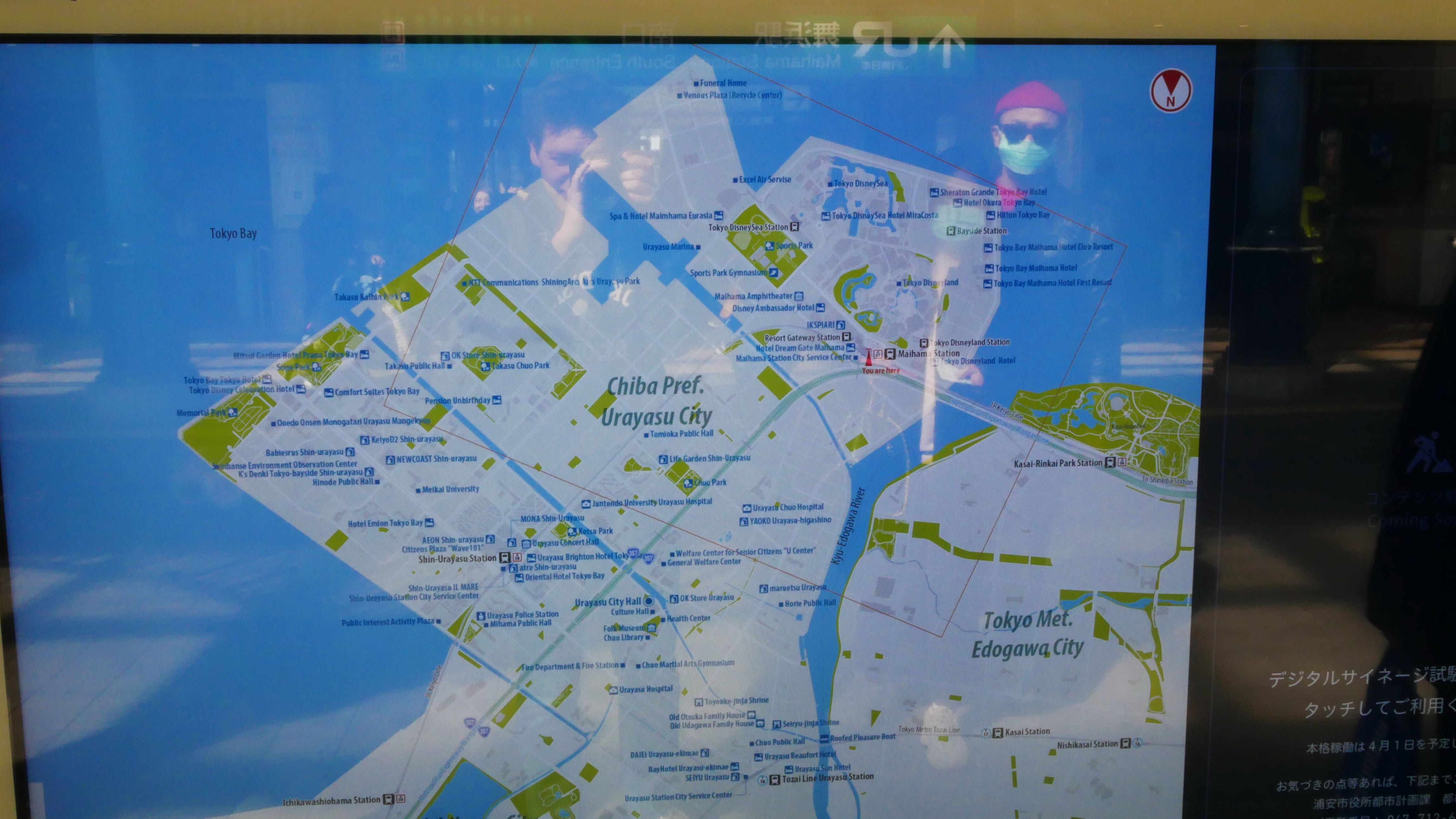 A new digital map and information board appeared this week outside of JR Maihama Station’s South Exit. The map features weather, bus information, and an interactive map of the Maihama area.