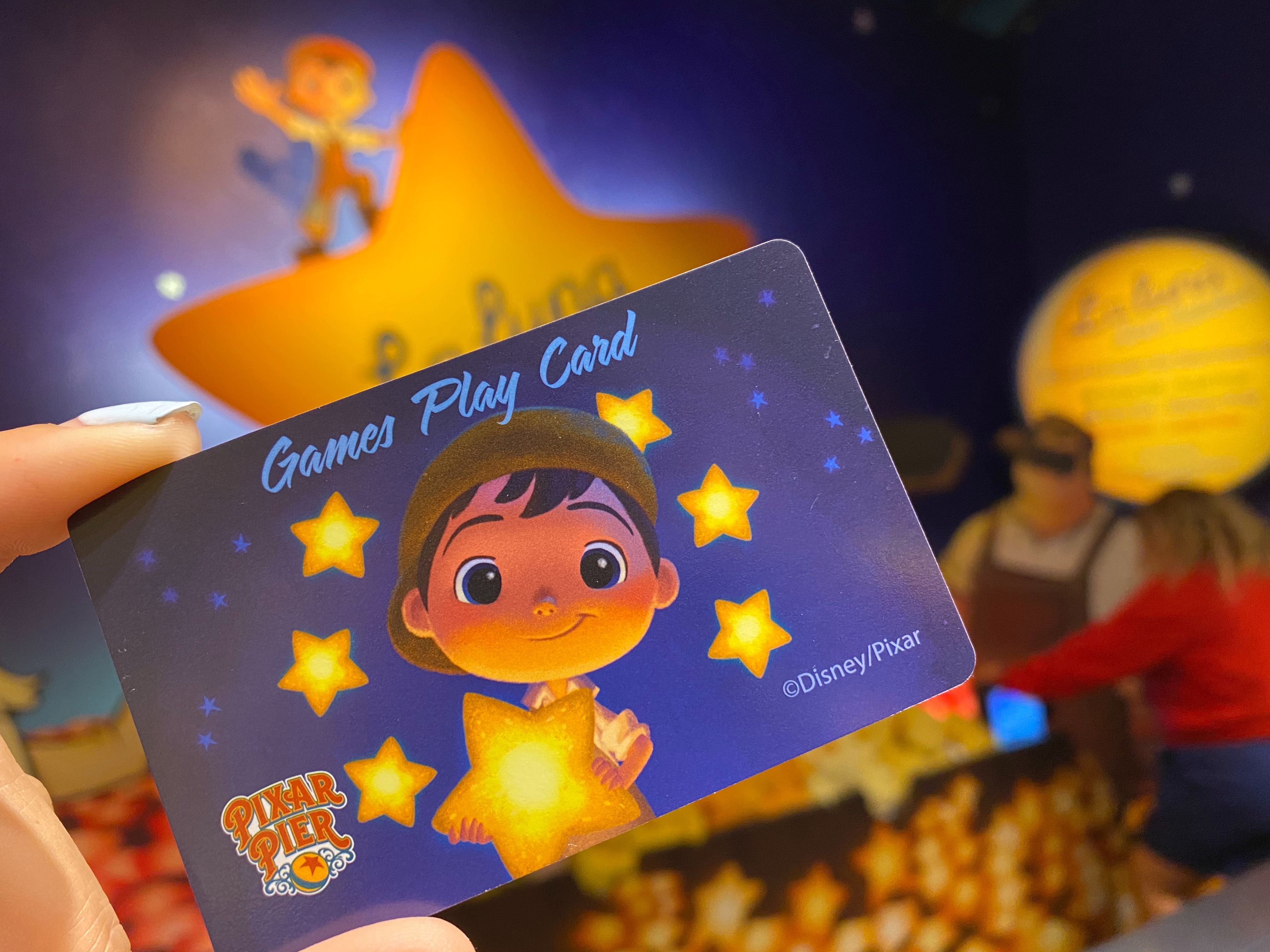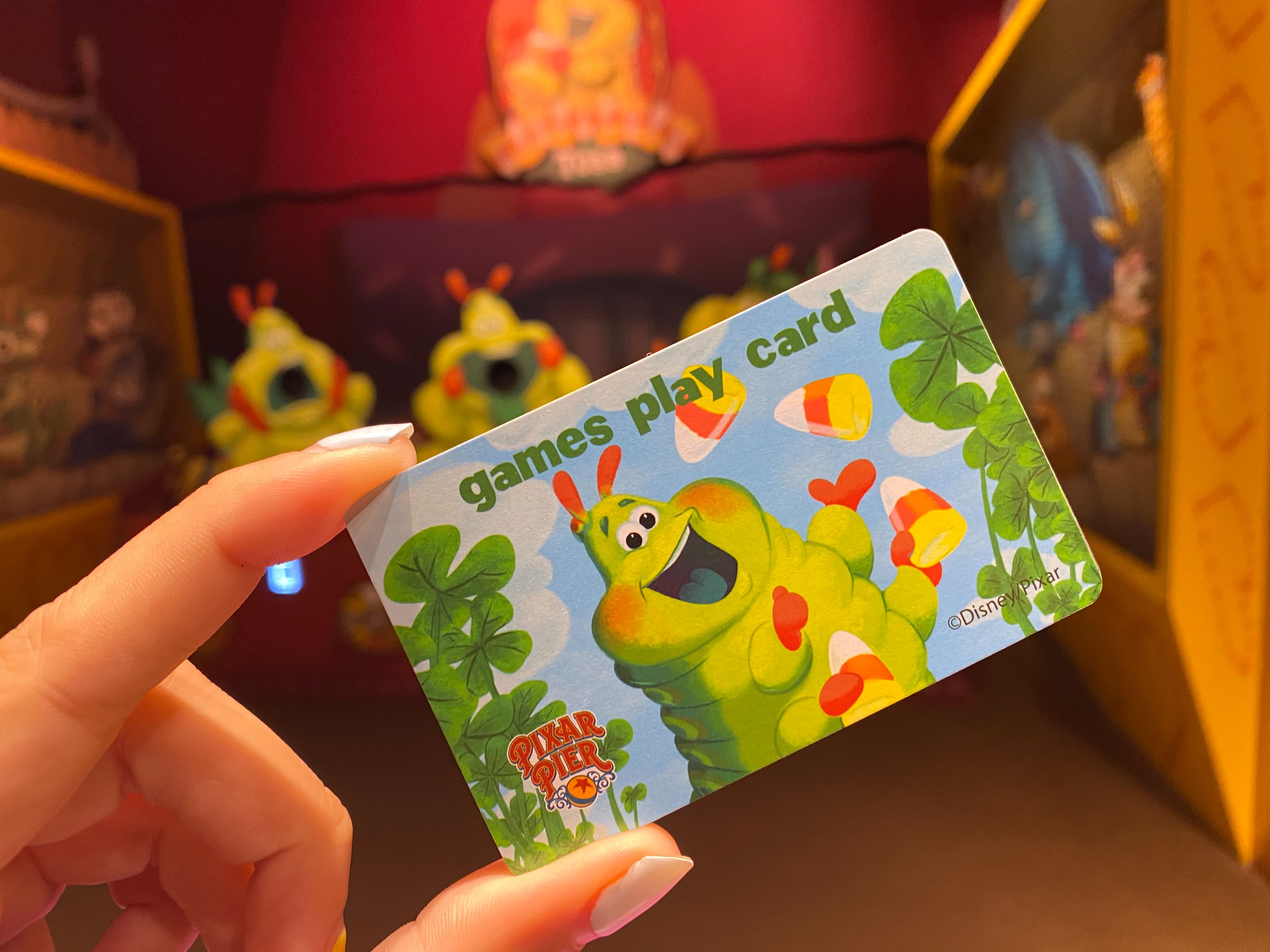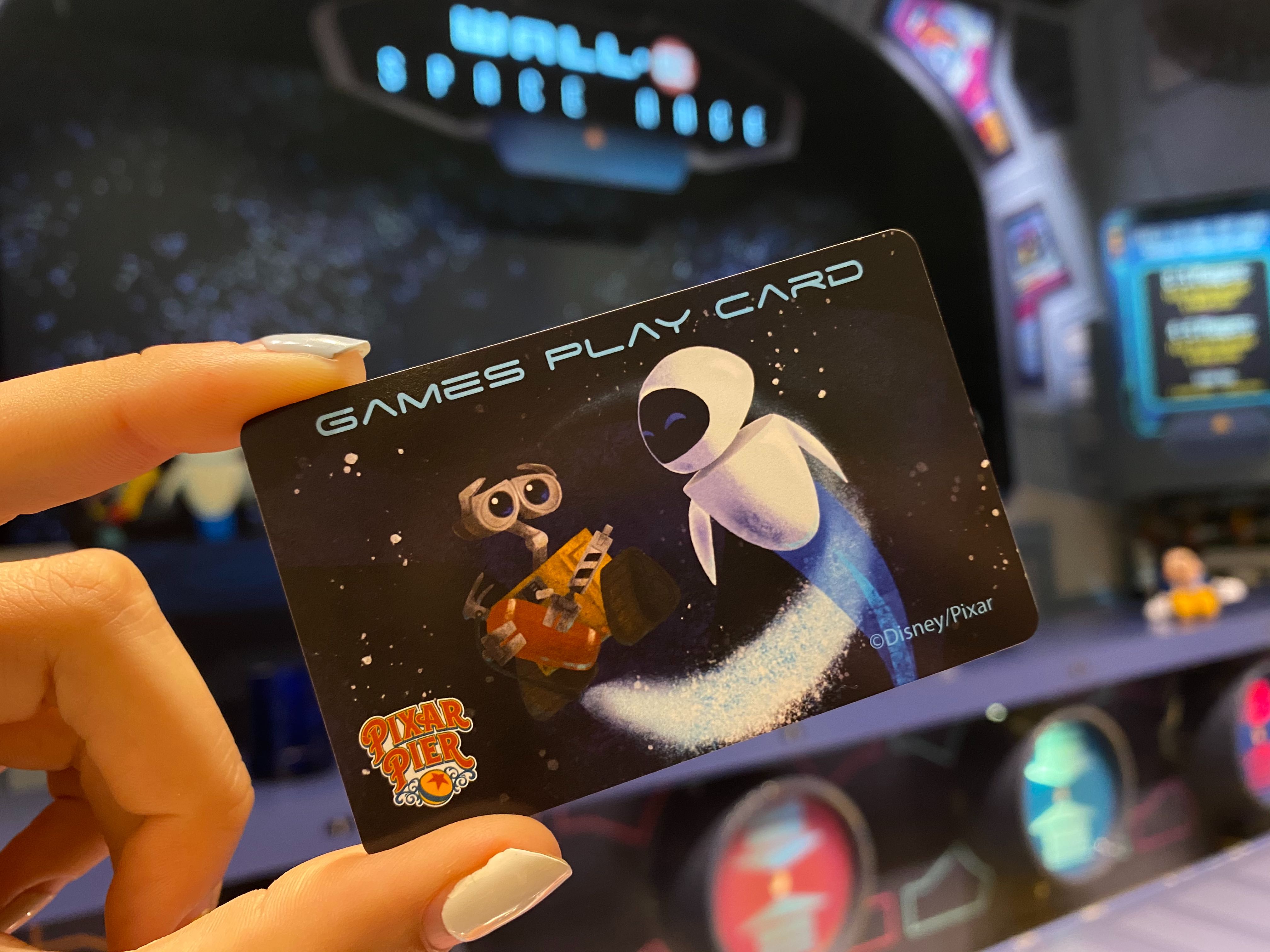 Each game play costs 500 points, or $5. You can purchase or reload a card at one of the kiosks at Pixar Pier.