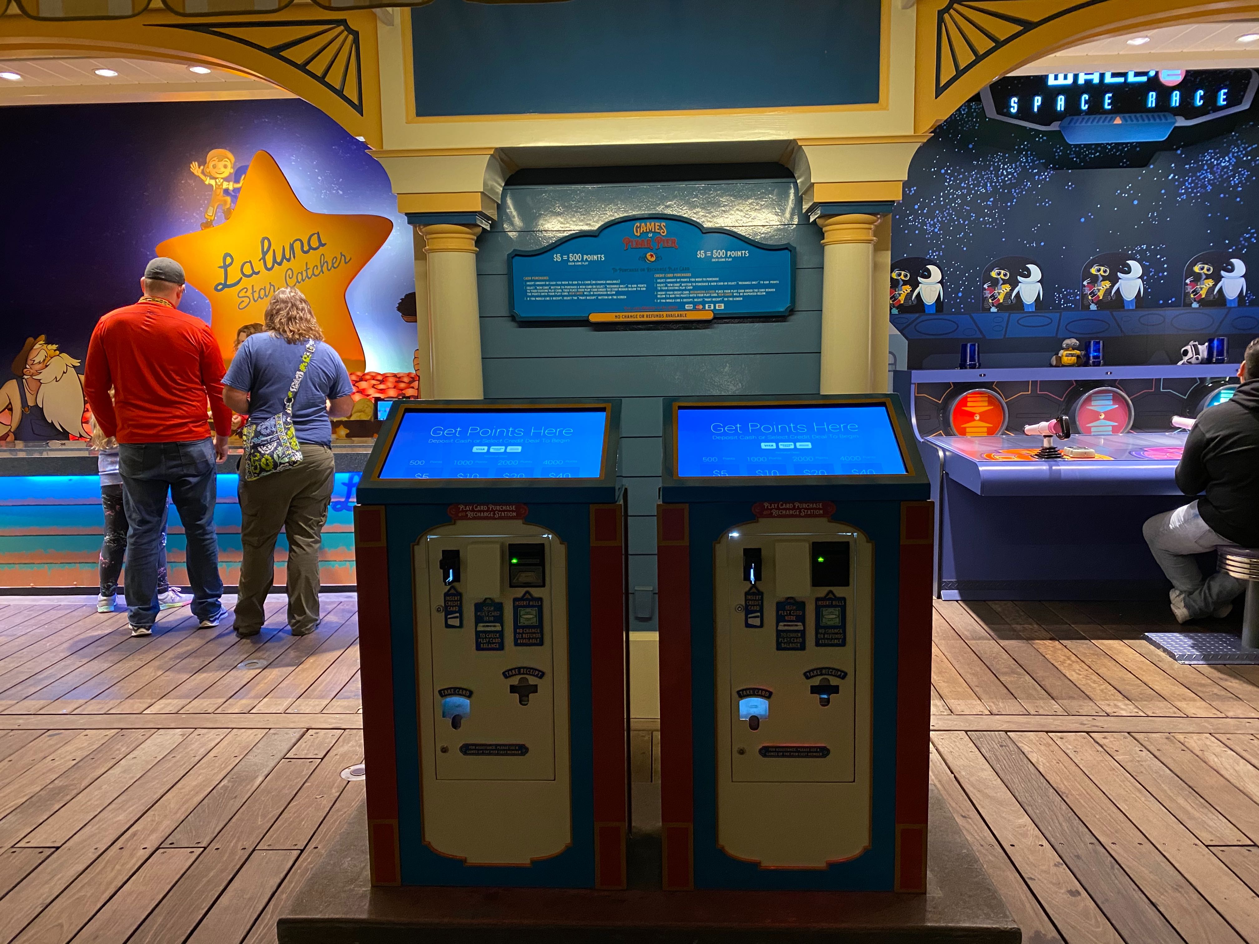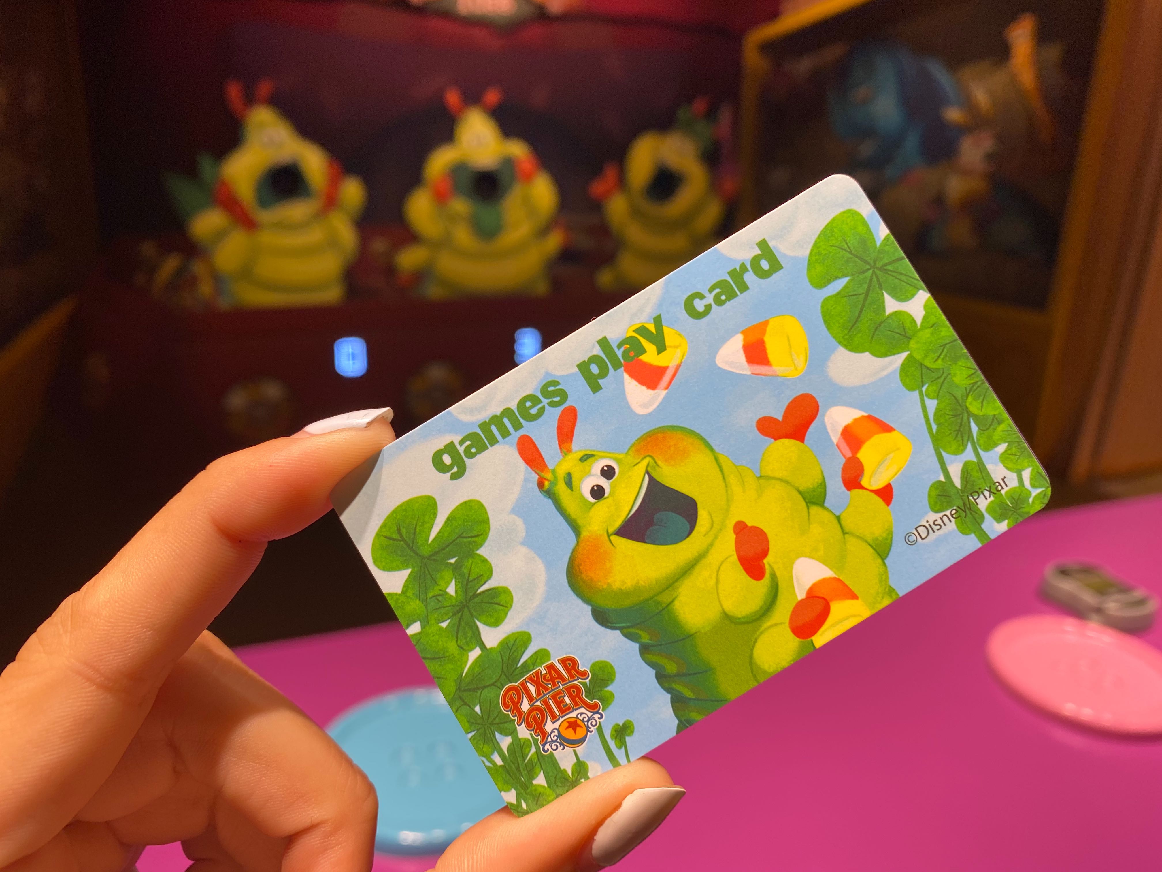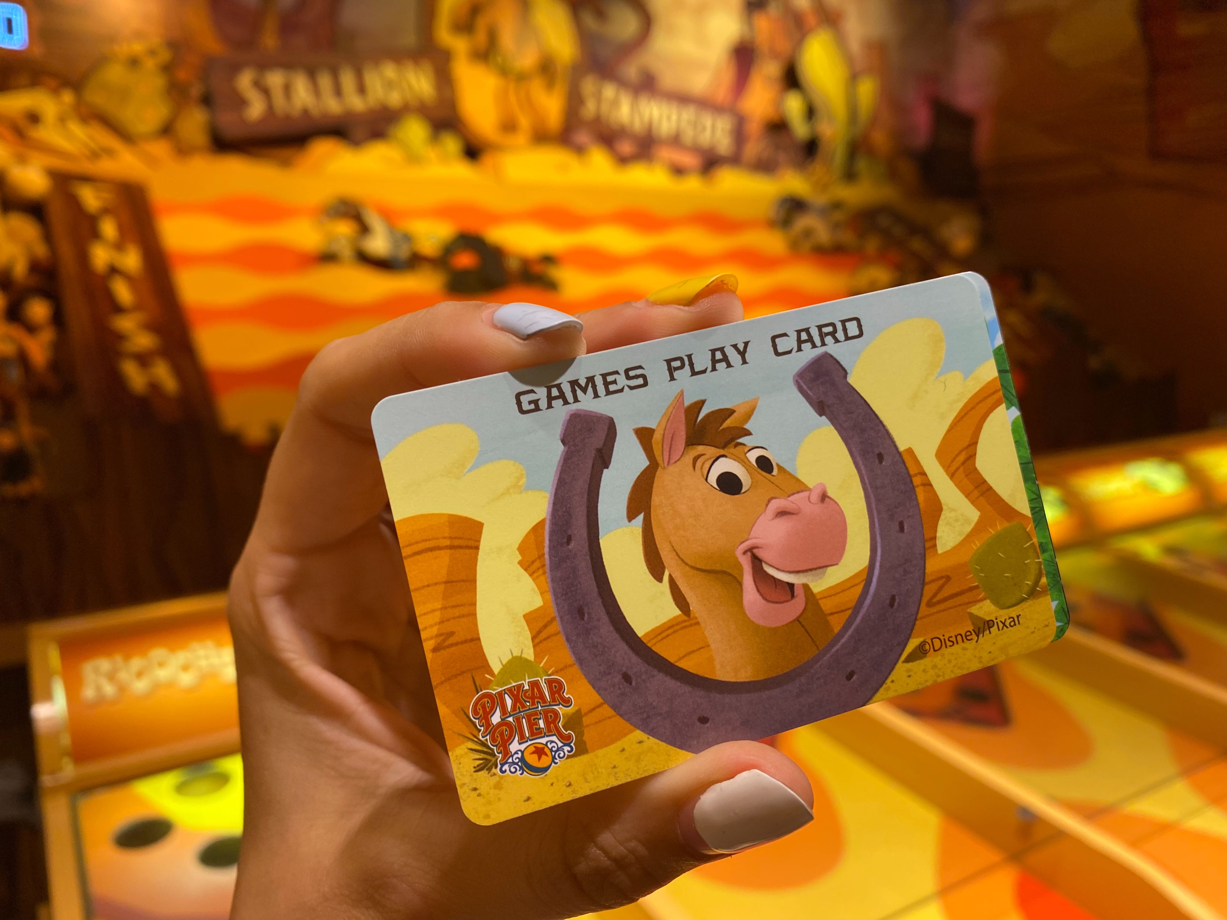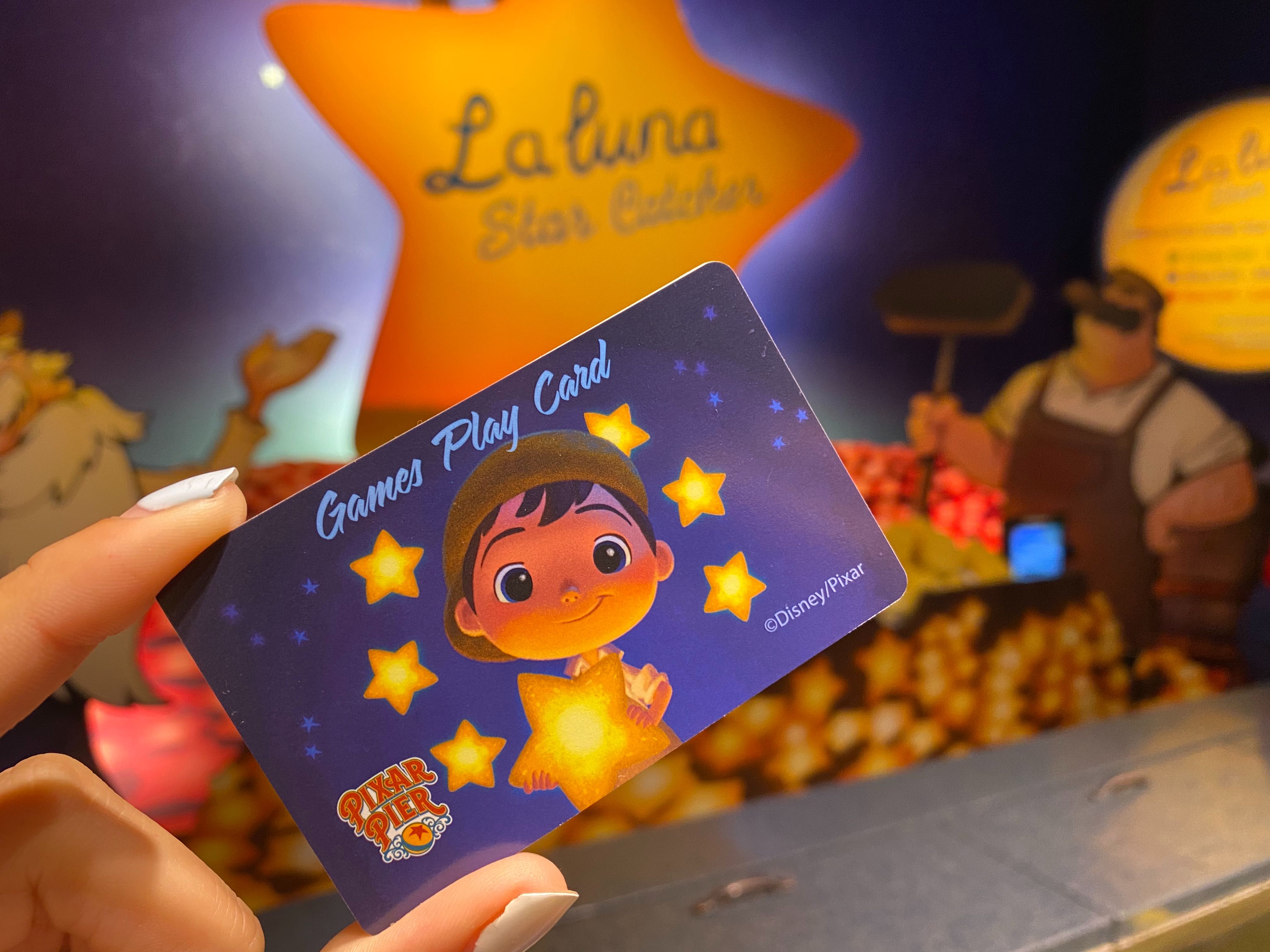 Each game play costs 500 points, or $5. You can purchase or reload a card at one of the kiosks at Pixar Pier.
