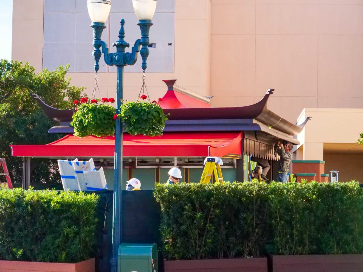 The kiosk was installed overnight, and mirrors the same design elements of the Chinese Theatre, with a red, upwards curved Xeishan-style roof and a red awning with yellow accents. Planters currently surround the structure as work continues on finishing the interior of the kiosk.