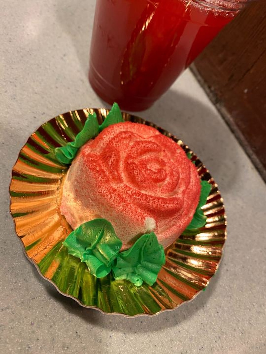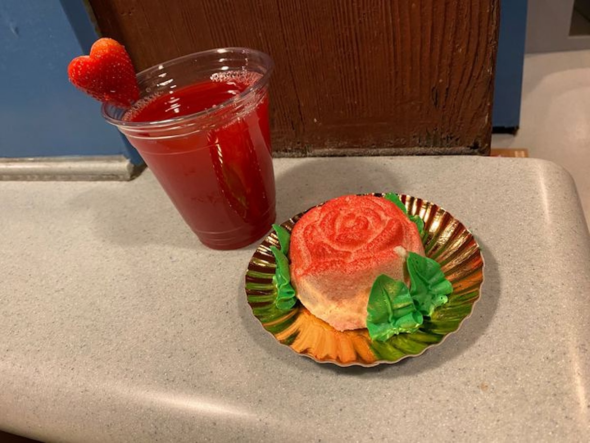 That “Painting the Roses Red” has been the taste-test item on the “Taste of the Magic Kingdom VIP Tour” for a bit now. We had it a couple of weeks back. Unfortunately, for legal reasons, Disney can’t collect comments during that taste-test – they just provide a survey card for you to fill in on the overall, the taste, and the presentation. We agreed – we don’t love cheesecake mousse, although when you get a bite of the buttercream, mousse, and filling all together, it’s a pretty good bite.