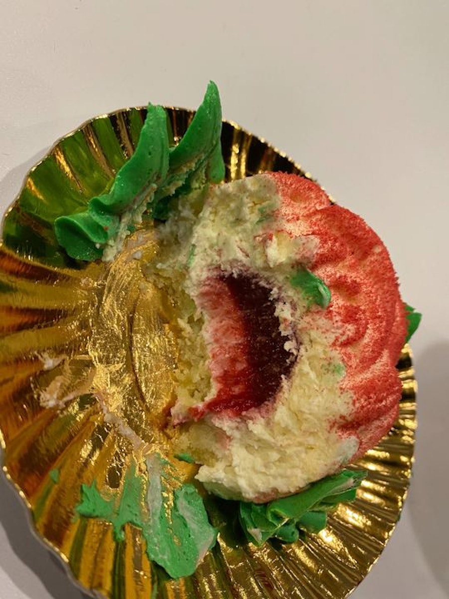 Painting the Roses Red is a cheesecake mousse, raspberry gelee, red cocoa butter, and buttercream leaves.