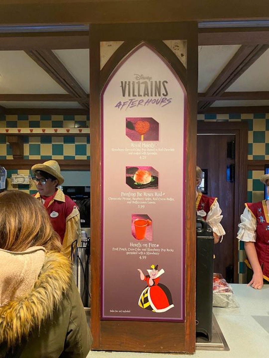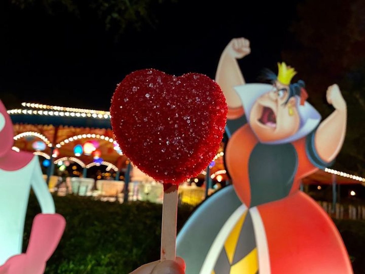 Tonight starts the first of many Disney Villains After Hours 2020 events that will run on select nights until July 10th, 2020. The event this year has brought new merchandise, a new parade, and tasty treats themed after several classic Disney villains. We’ve been snacking our way through them and next up is the Queen of Hearts, who has a multitude of treats at the Chesire Cafe.