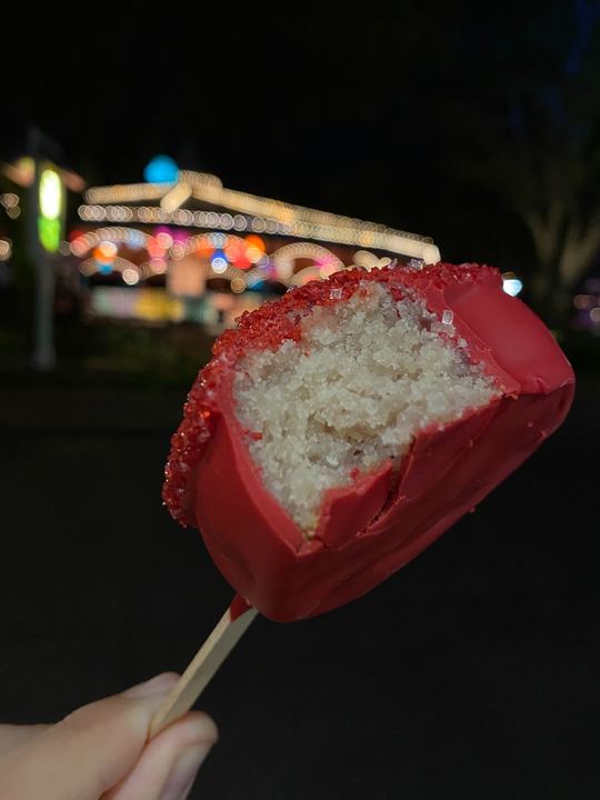 The Royal Majesty is a strawberry flavored cake pop, dipped in red chocolate and coated in red sprinkles.