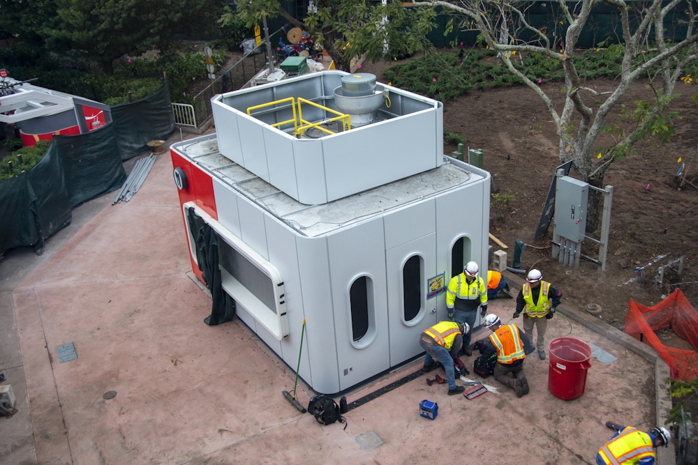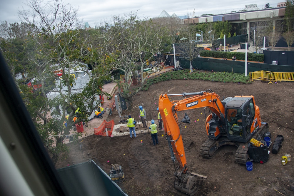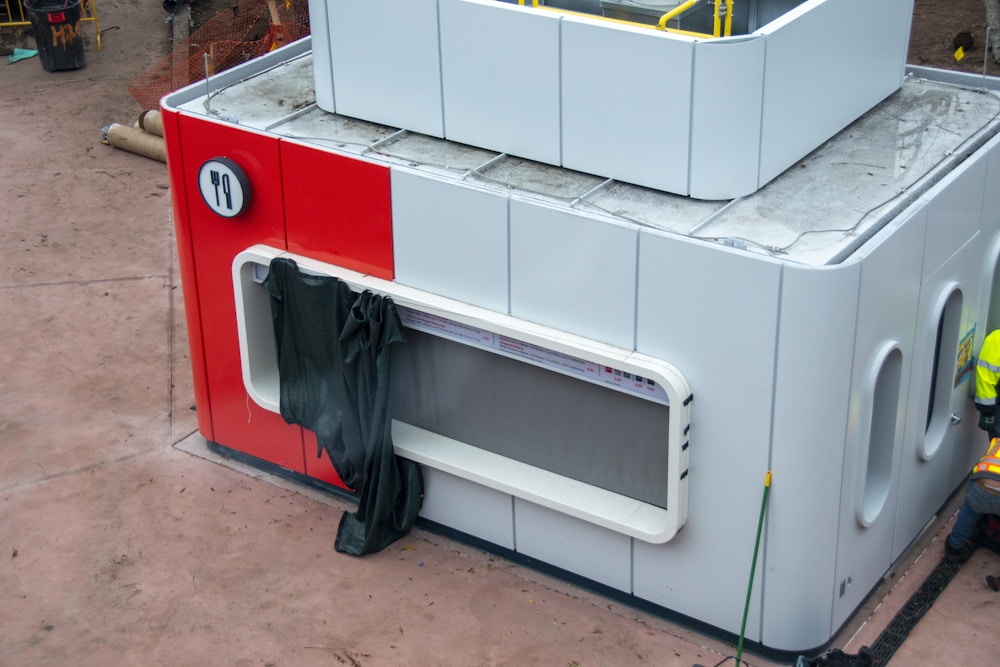 From above, workers were active around the site. You can see where a new, all-white structure was added to accommodate the vents for the grill, meaning at least something on the menu will be made fresh. During Taste Track’s last appearance at the 2019 Food & Wine Festival, it mainly served donuts and drinks, so an exhaust wasn’t necessary.