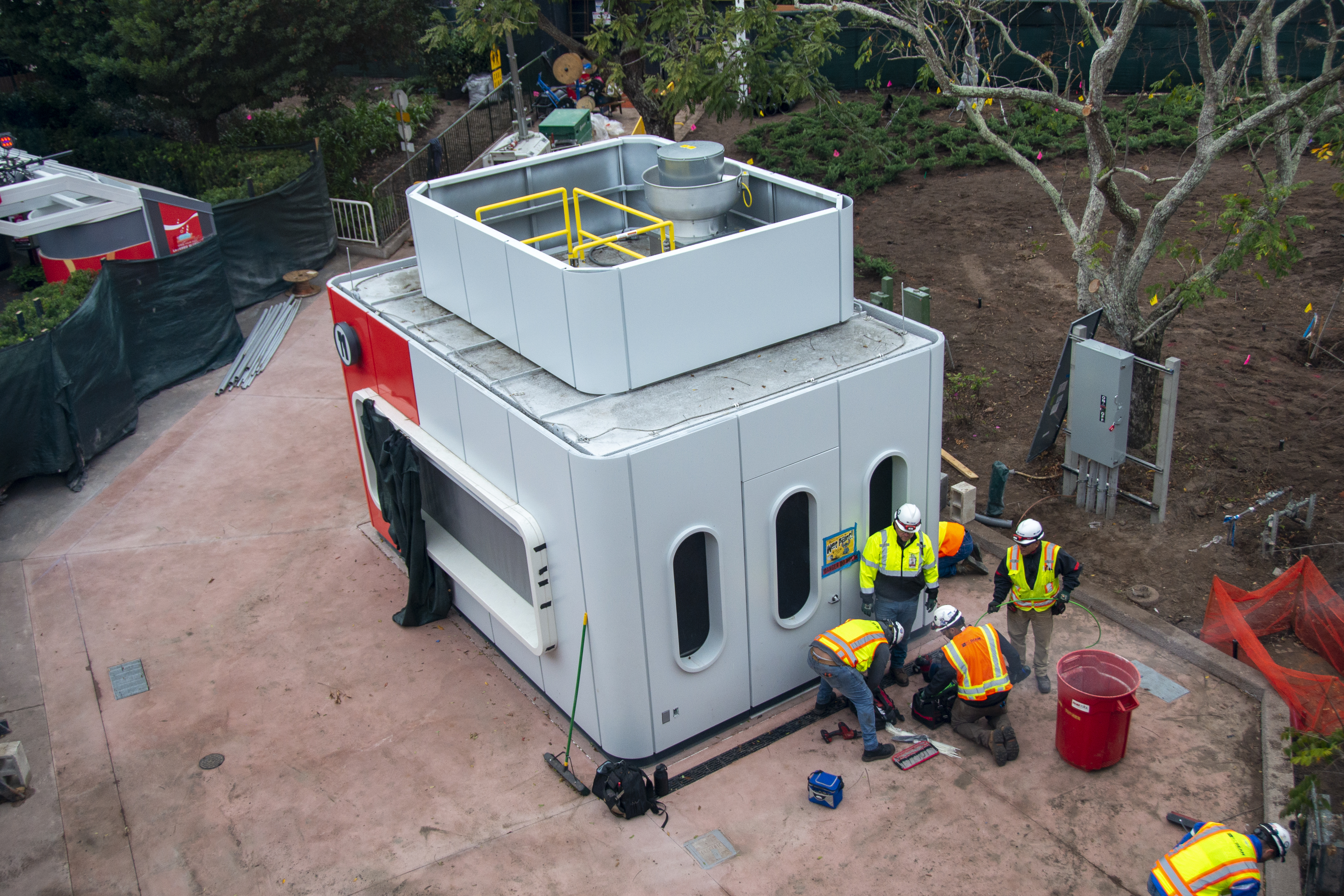 From above, workers were active around the site. You can see where a new, all-white structure was added to accommodate the vents for the grill, meaning at least something on the menu will be made fresh. During Taste Track’s last appearance at the 2019 Food & Wine Festival, it mainly served donuts and drinks, so an exhaust wasn’t necessary.