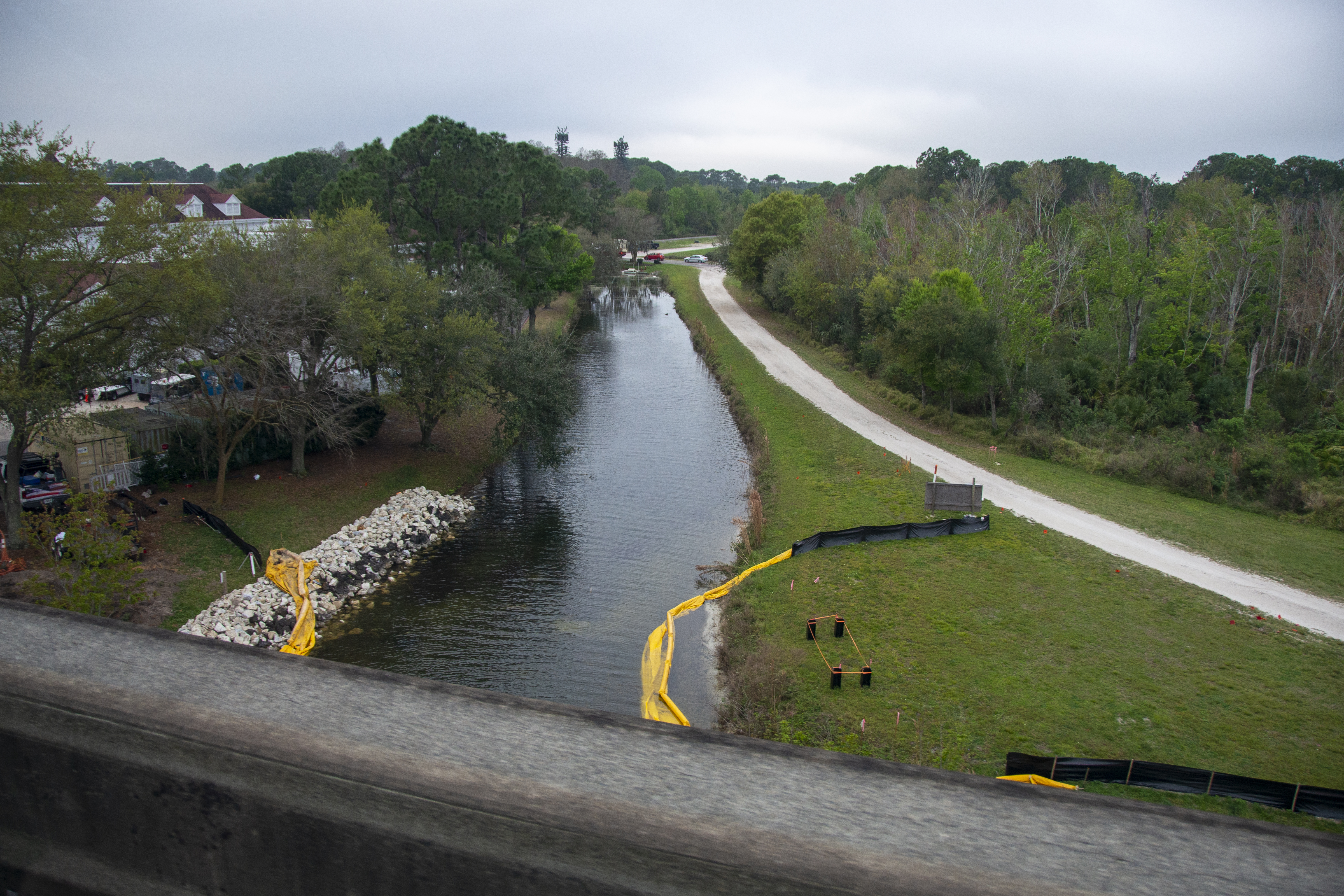 Work on a small bridge to cross this canal is also progressing, with construction barriers lining the work site.