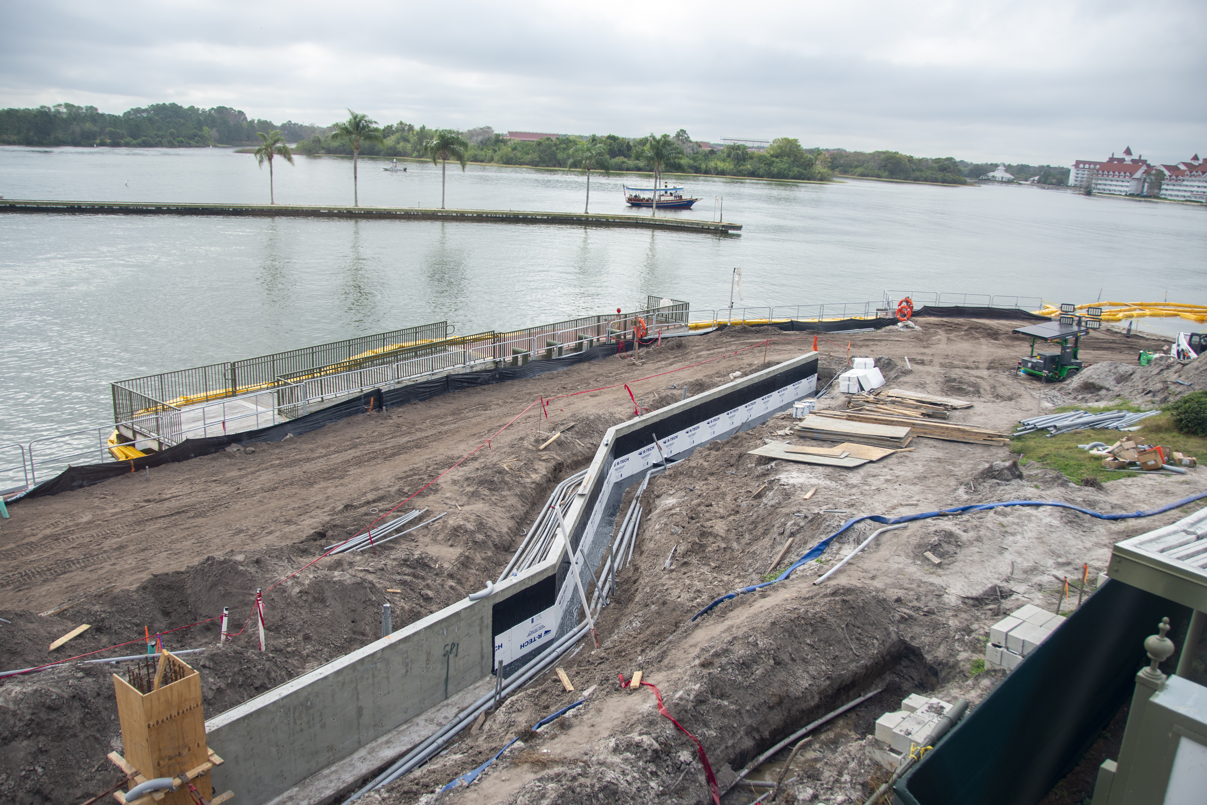 Over at the boat dock for the Magic Kingdom, work continues on the expanded area. The latest iteration of the concrete retaining wall has been poured with new support beams being framed as well.