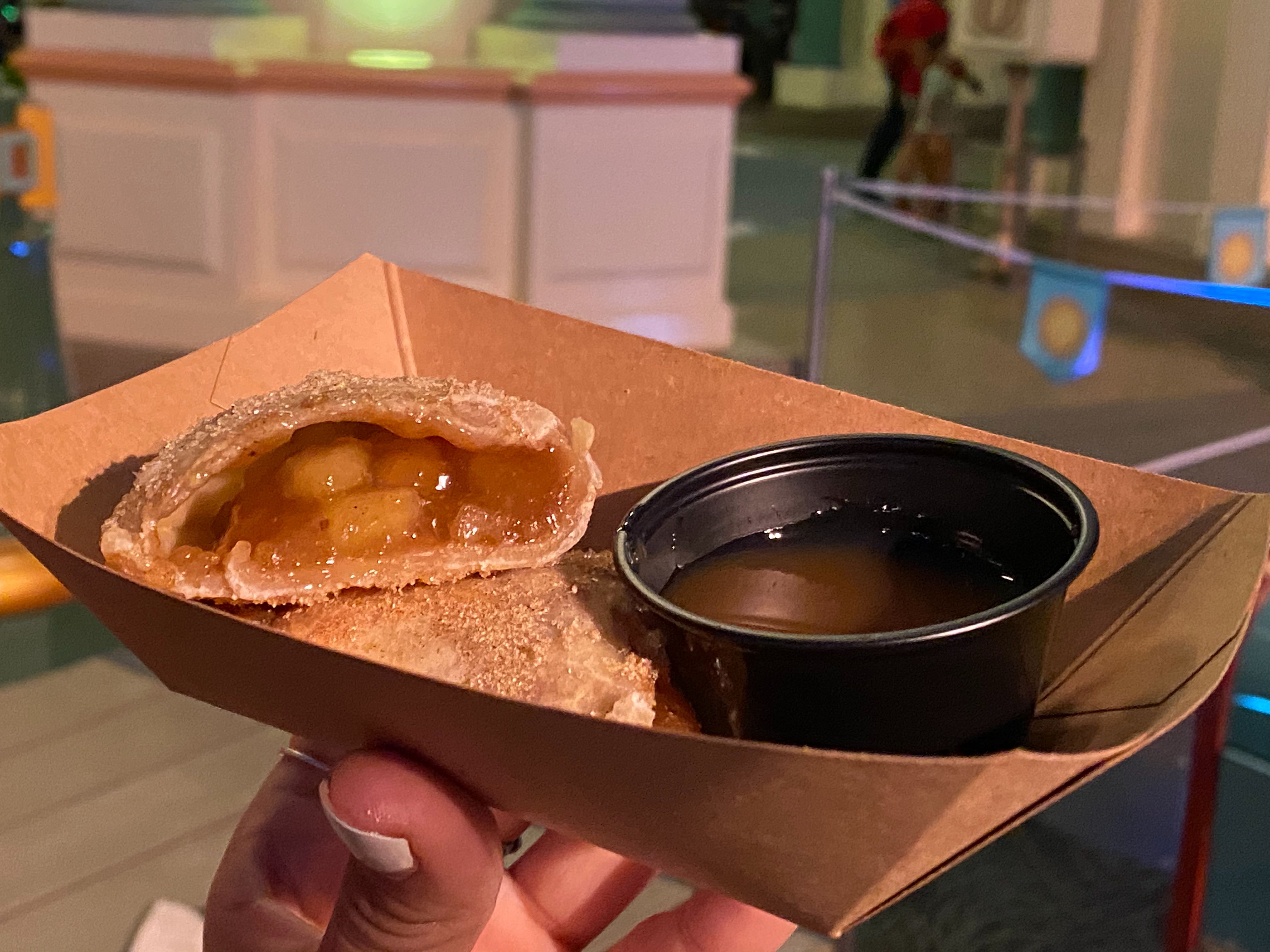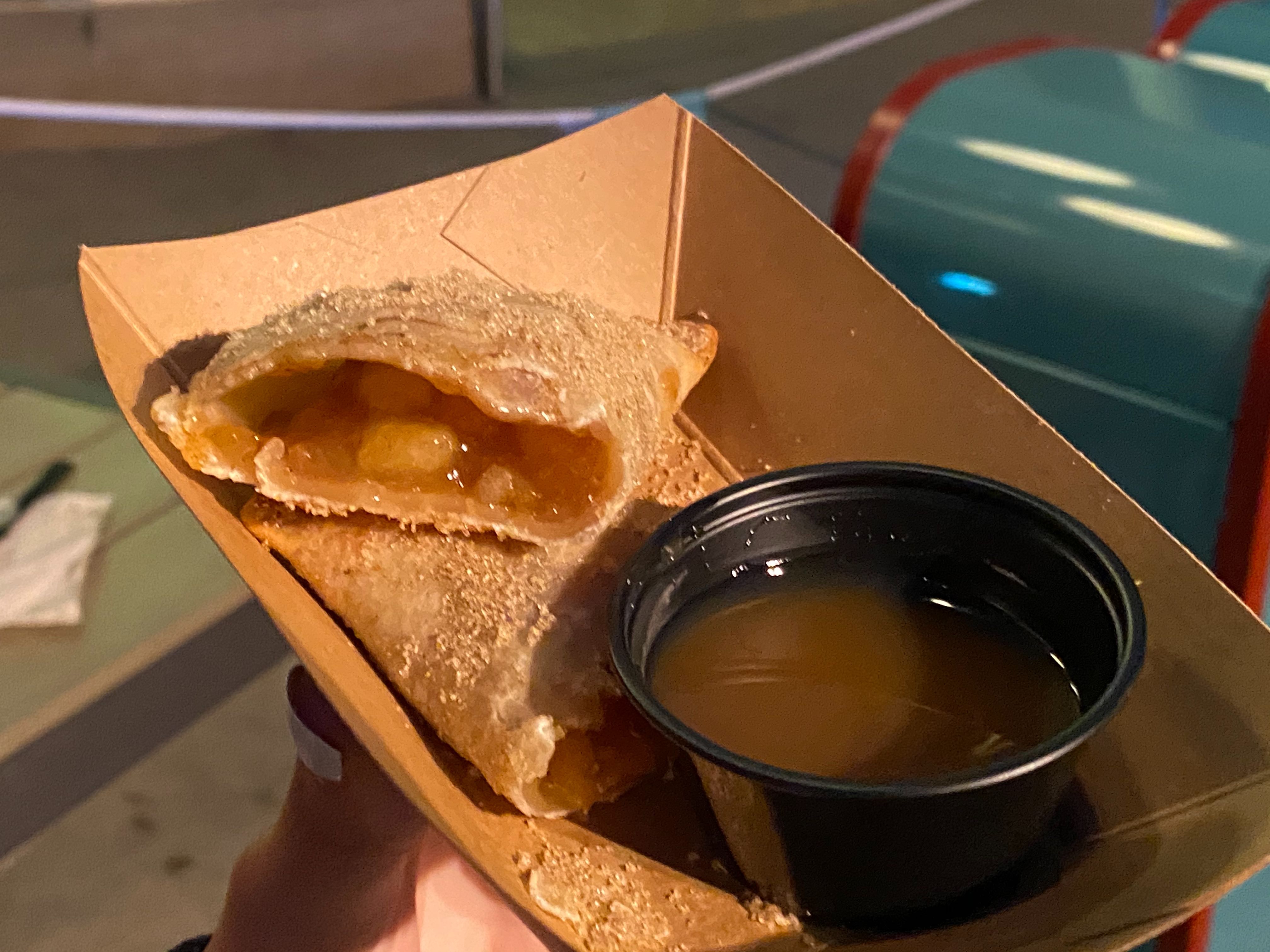 Unfortunately, the apples on the inside are undercooked and very hard. If you can get past that, the sweet cinnamon taste is delicious, but the caramel dipping sauce was too thick and overpowering. This treat wasn’t one of our favorites, and not nearly as good as the savory option.