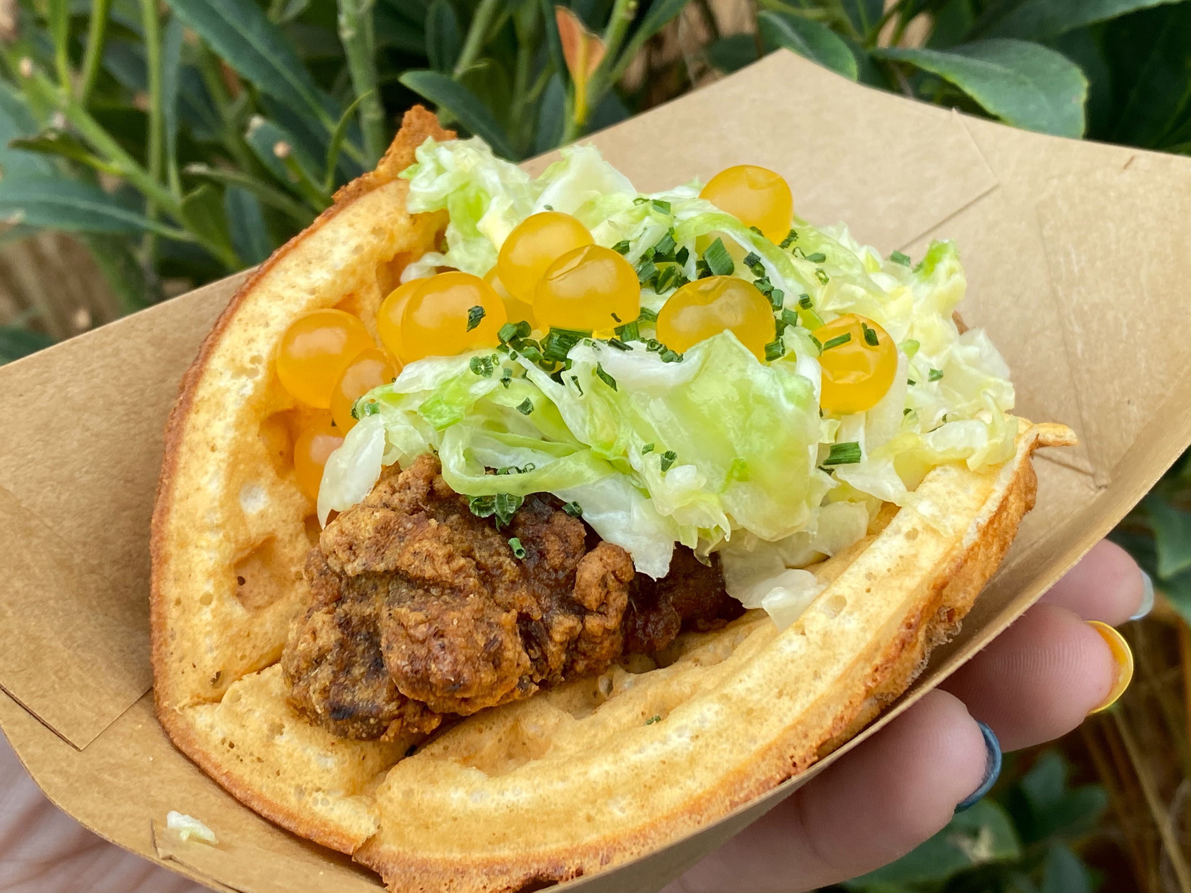 This was a very fresh twist on the classic chicken and waffle dish. Fried chicken sits in an almost taco-looking waffle topped with mimosa-inspired slaw and OJ bubbles. We were hesitant at first glance, but this was a flavorful dish.