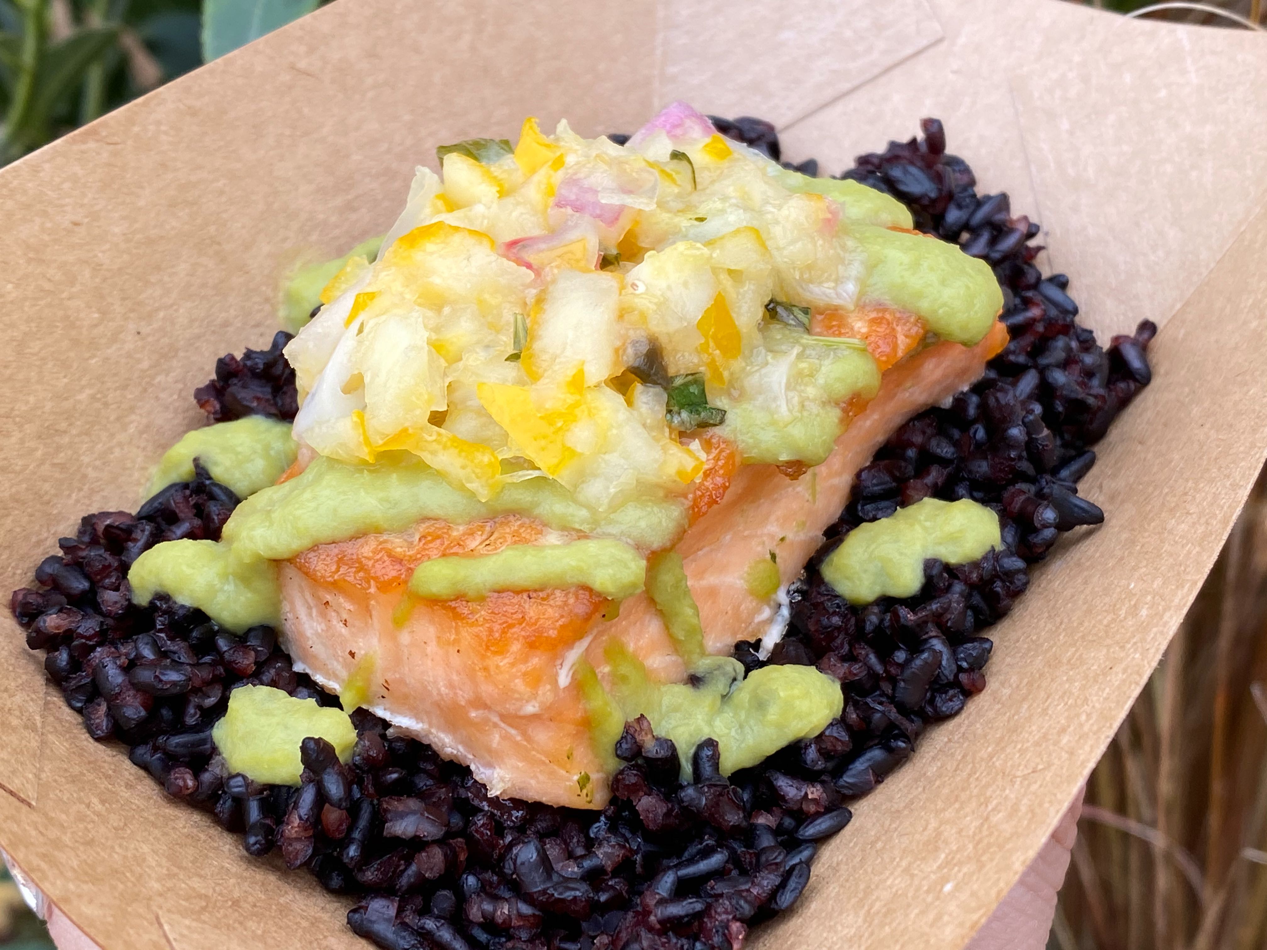 *NEW* Seared Verlasso® Salmon with Lemon Pea Purée, Black Rice and Meyer Lemon Relish (Gluten-Friendly) – $7.75