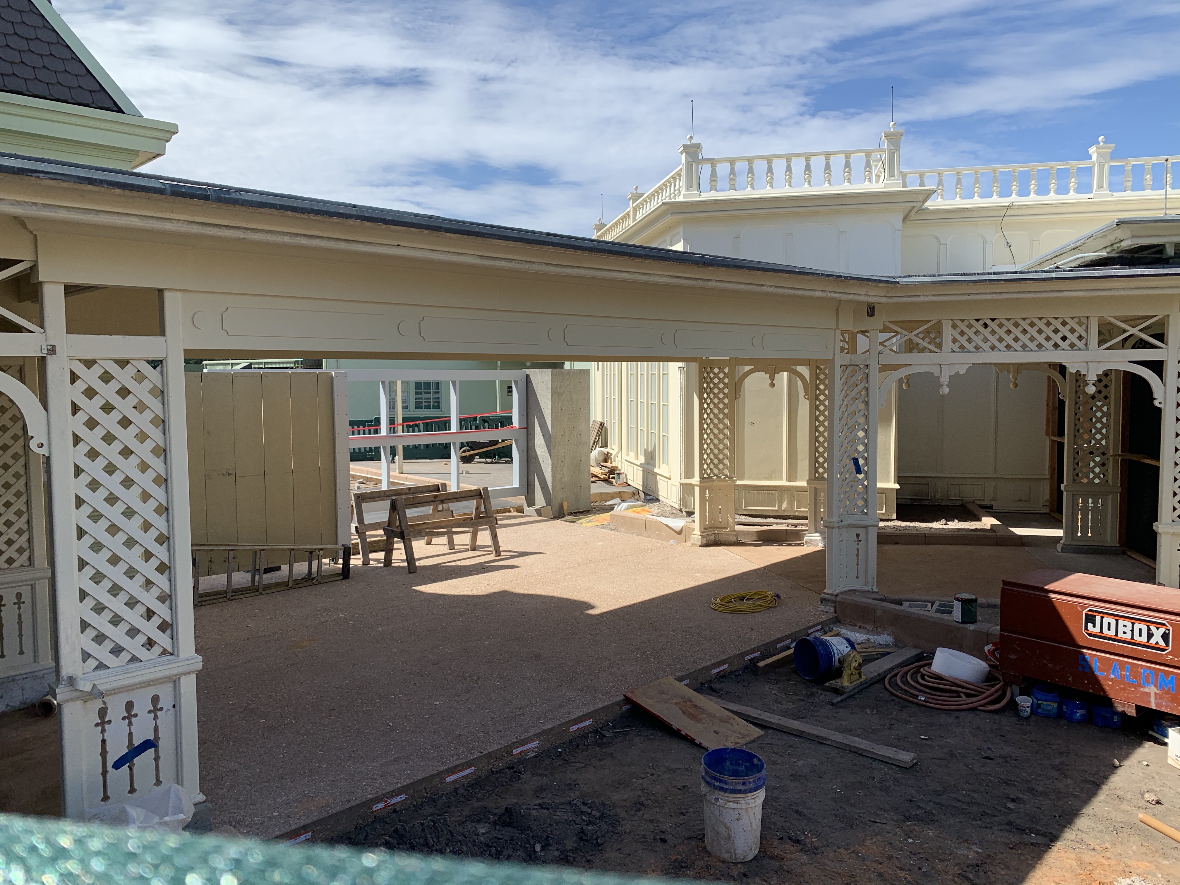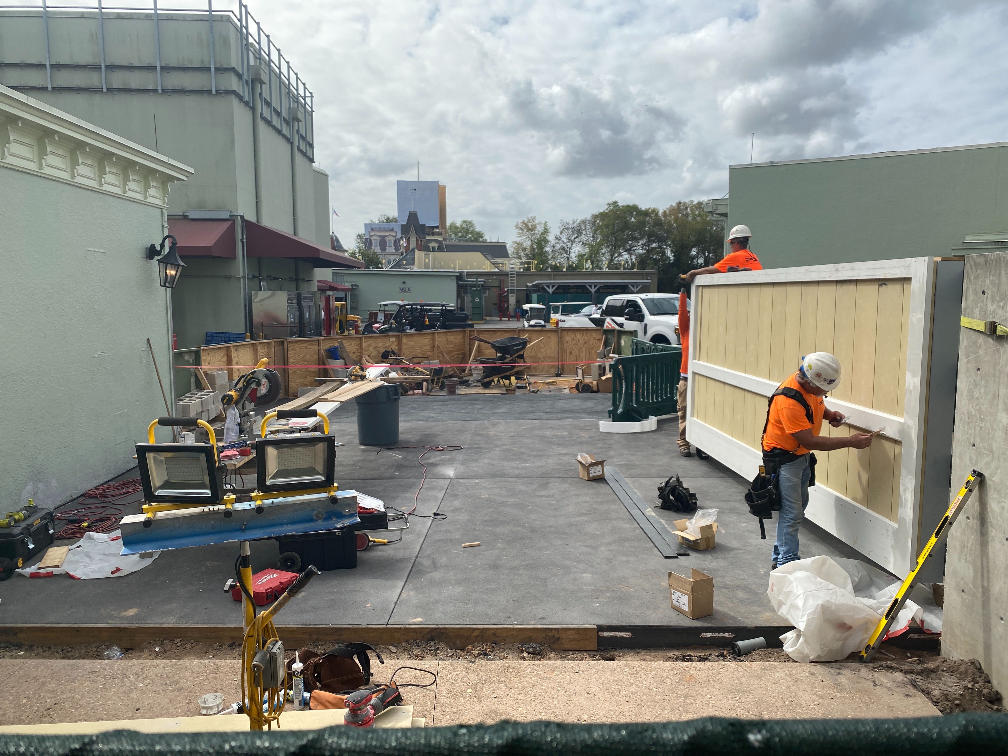 There have been some paving happening backstage to connect it to the onstage area, and a large push gate, similar to what is on the other side of the street in-between Plaza Restaurant and Tomorrowland Terrace, is being installed.