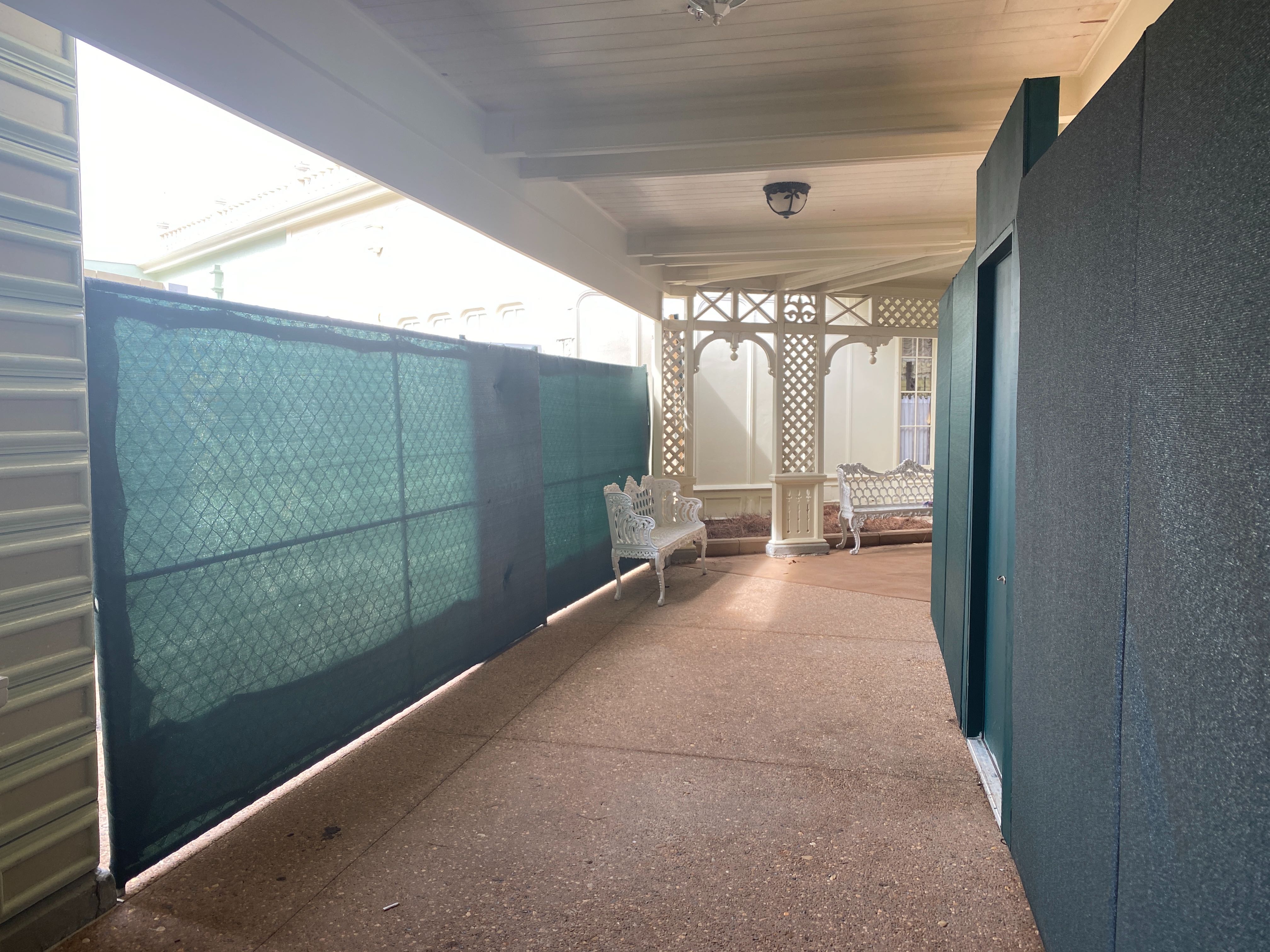 The area backstage was now completely walled off by a temporary scrim. There was now a clear path from Casey’s Corner to Casey’s Corner Restrooms to First Aid, which had been temporarily impeded.